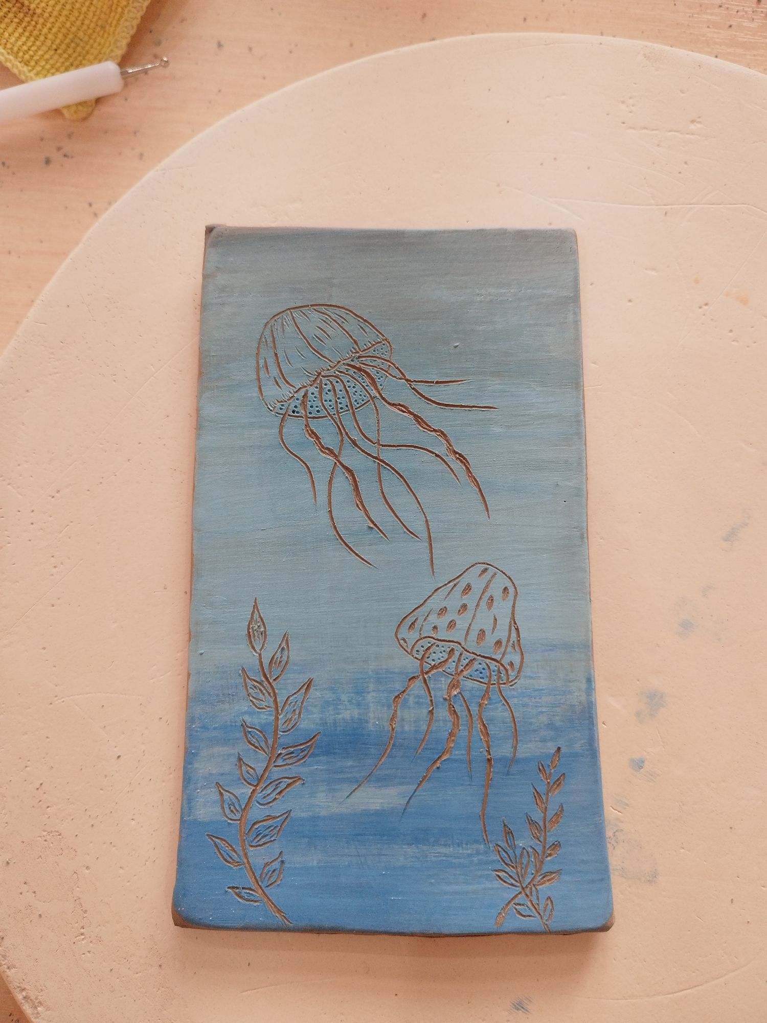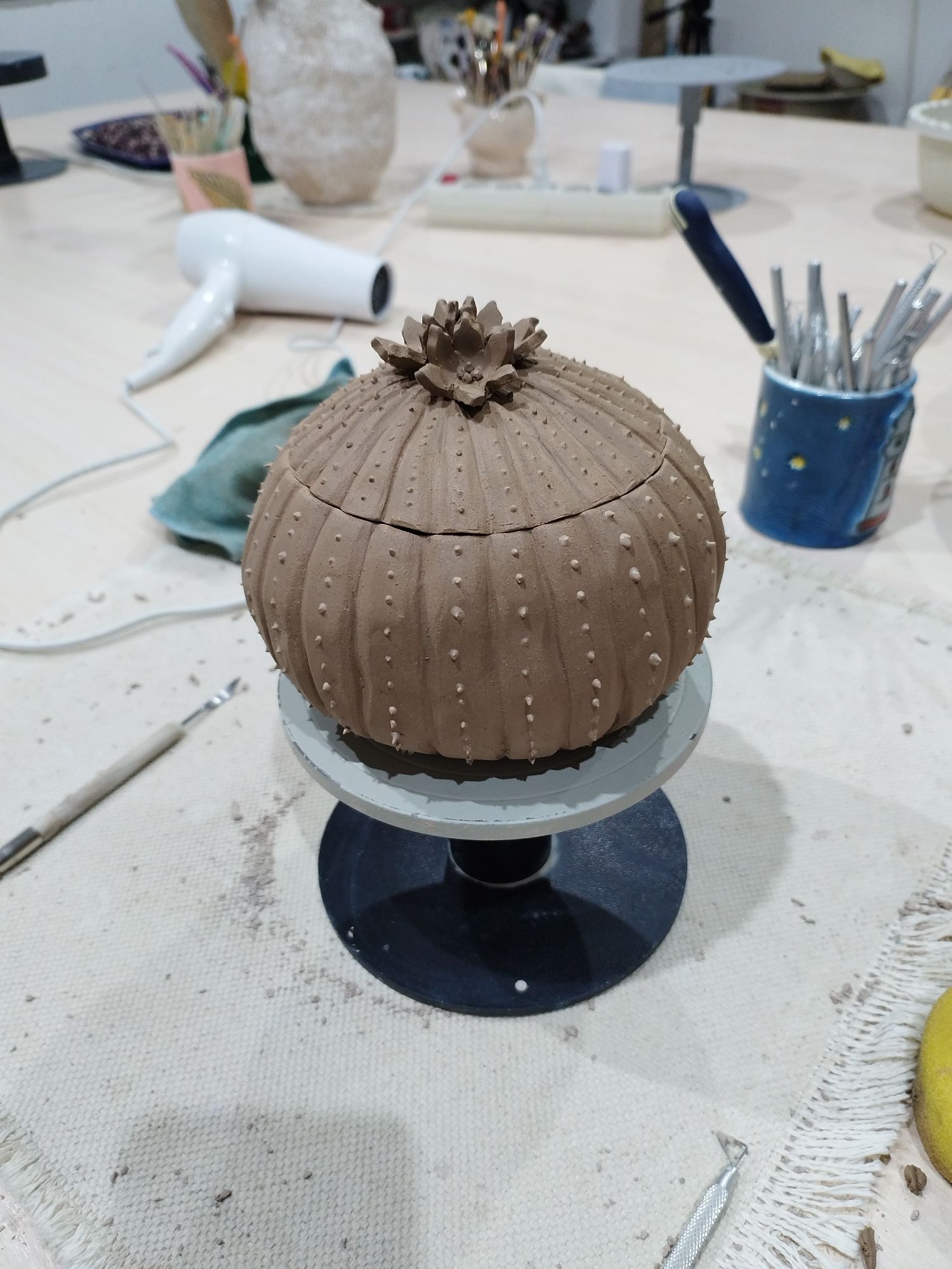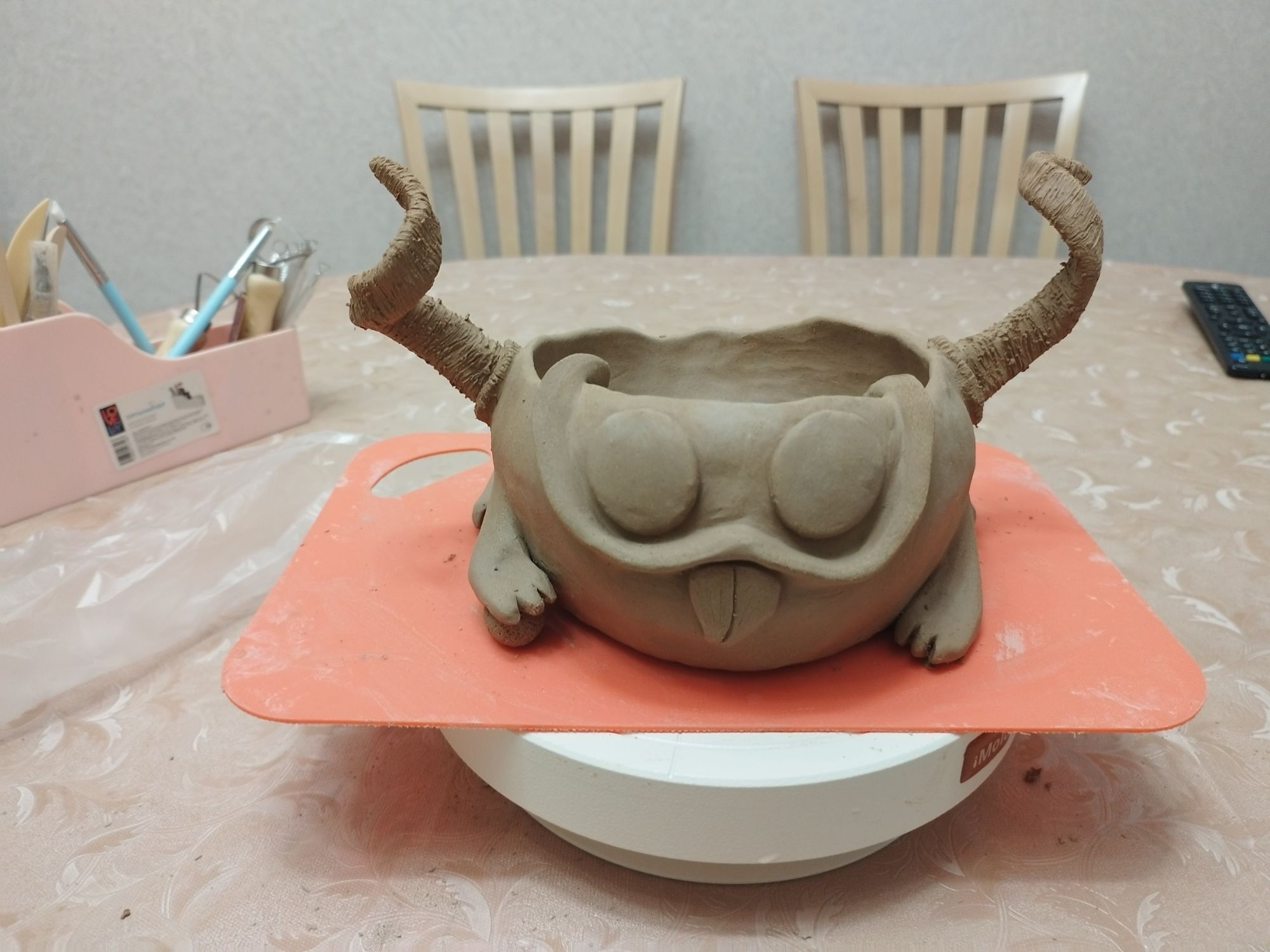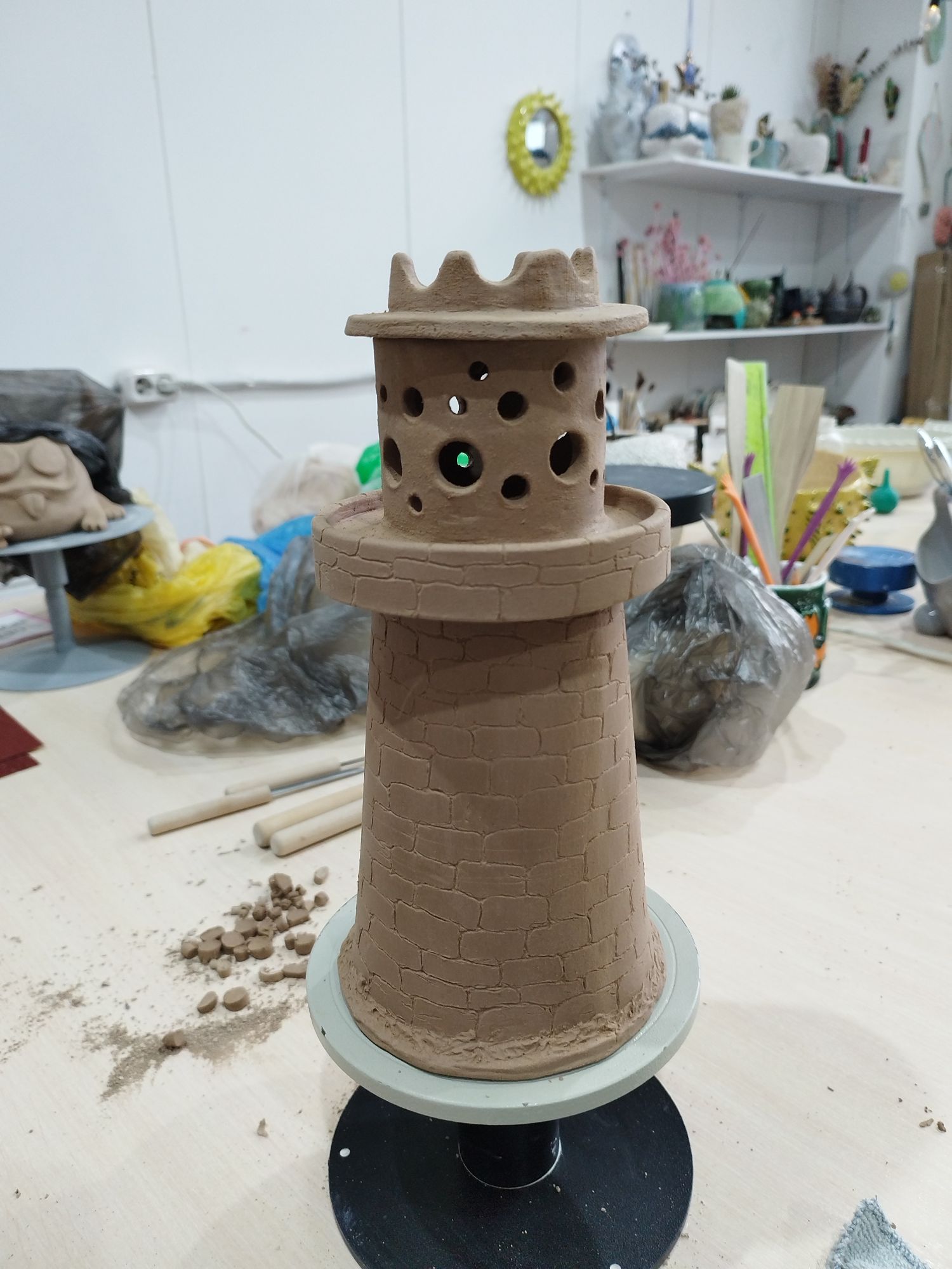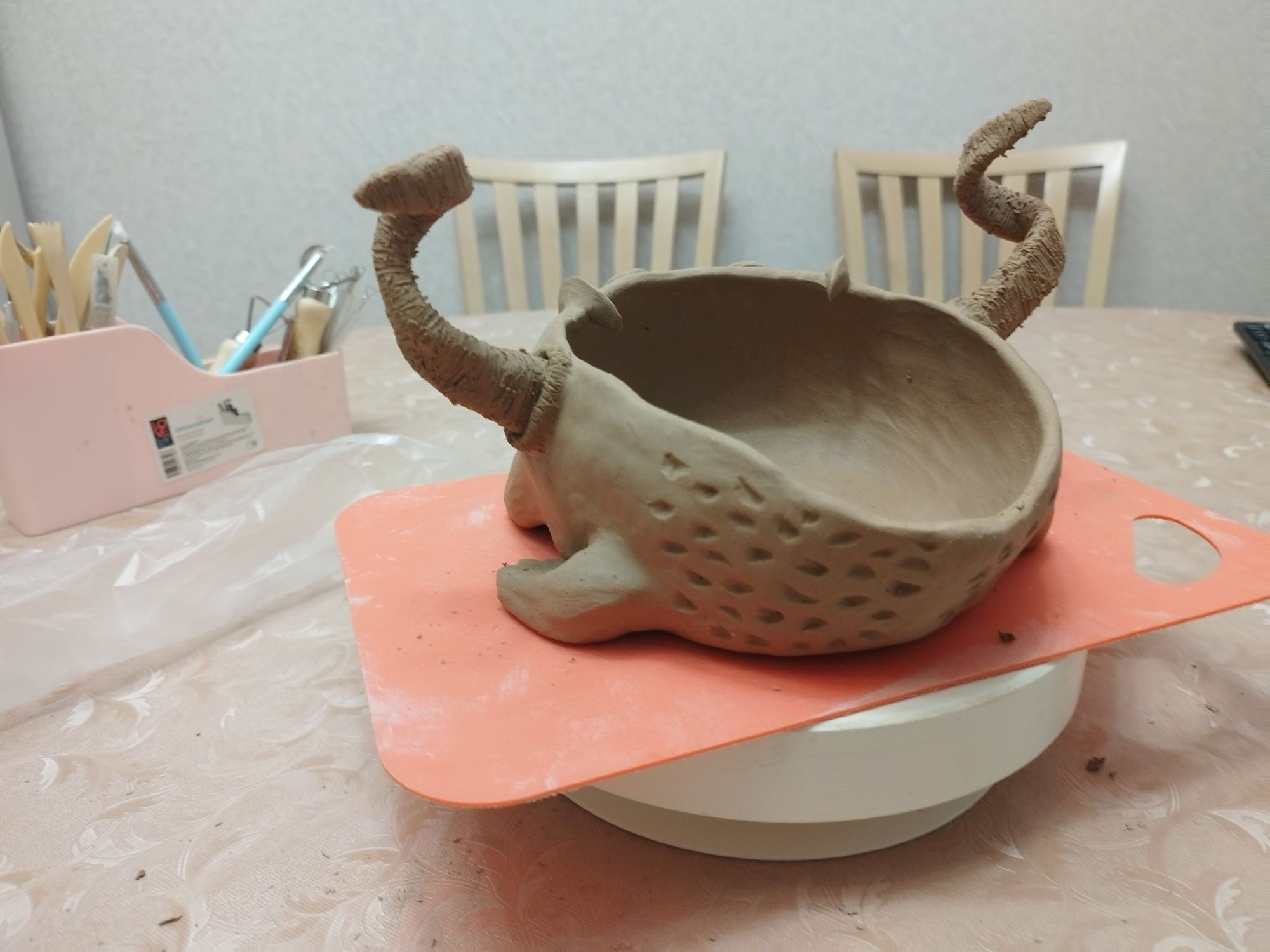 30 мая 2023 Всем привет!)) Немного пропала, вышивала не много, но я халтурила!)) Посетила первый этап курсов ручной лепки! С 13 до 22 (иногда чуть раньше заканчивали) проходило каждое занятие. Уставала конечно колоссально... Фотографий мало, совершенно забывала их делать. На первом занятии мы изучили фактуры, инструменты, техники декора, теорию и сделали заготовки для следующего занятия. Больше всего понравилась технико сграффито)) Это как раз плиточка с медузами) На следующем занятии проходили литё и делали изделие из "колбасок". Литё так же вызвало восторг. Хоть все говорили, что от него всё вокруг заляпано, на удивление от других техник у меня больше "грязи". В этот раз был залит чайник. Основная сложность в очень тяжёлой и большой форме, я физически не могу её ухватить что бы вылить. И пока ждали литё, делали изделие в жгутовой технике. Хотела аля сахарницу-монстрика, но что то пошло не так и вышла огромная рогатая жаба Пока надежда на усушку. Она претерпела много испытаний! Когда брала фото готового изделия за основу, я не задумывалась, что НЕ УМЕЮ САМА ЛЕПИТЬ. Совсем... Ни как... даже из пластилина... Первую лапу лепила наверно минут 15-20, а их 4... На рогах сдалась и попросила помощи. Время поджимало, а они у меня не выходили. ещё минут 30 потратила бы... Сразу расскажу про последнее занятие касательно жабки)) Когда стала делать текстуру, рожки процарапывать, кружочки на попе рисовать, заметила на лапке трещенку. + она была поднята вверх. Взгрустнула, оторвала и снова приладила. Через время она опять поднялась! Народ посмеялся, мол оставь так, будет на манер манеки неко) И тут меня осенило добавить под лапку "камушек". Скатала овальчик, придала текстуру и подложила под лапку))) На удивление, у неё такой довольный вид стал, словно дракон с жемчужинкой))) После жабика настала очередь заняться доделкой работы из литья. Вытащить всё вытащила, основа, носик, ручка и крышка, но осталось ещё носик и ручку приделать, а так же затереть швы и тп! Ну я лёгких путей не ищу, раз выбрала чайник... Подлезть изнутри к стыку носика и основы крайне тяжело. Но голь на выдумка хитра, так что намотала губку на стек и уже этим приспособлением затирала. Вроде что там, бац бац и всё... А на деле часа 2 точно потратила на придание чайнику чистового вида. Следующее занятие было по пласту. Оттиск делать понравилось, придавать форму на пуансоне не очень, но жить можно. А далее попросили выбрать работу посложней, поработать с геометрией... Думала помру прям там... Решила сделать маяк цать в одном. И жнец и швец и на дуде игрец. Задумка была: Основа маяка будет вазой, следующий слой подсвечник. Шло всё не плохо, пока не дола до "крыши". Ну не выходит купол и всё тут... Плюнула и решила сделать слой для благовоний конусов Что бы я ещё раз надумала делать вазу из пласта! Убейте сразу. Затереть швы изнутри у дна это ппц. Как чайник... Количество швов я даже подсчитывать не хочу... Каждый стык с двух сторон. Часов 5 минимум на "чистовик" потратила. Забегая вперёд, маяк стал башней на маяк данная конструкция не смахивала ни под каким ракурсом))) Громадина несусветная вышла Были процарапаны камни кладки, прорезана "стена" крыши на манер башен и сотый раз всё затёрто-замыто. Так же в этот день была залита чашка с последующей доработкой в конце дня. Приделать ручку и замыть-затереть. На следующий день была доработка прошлы