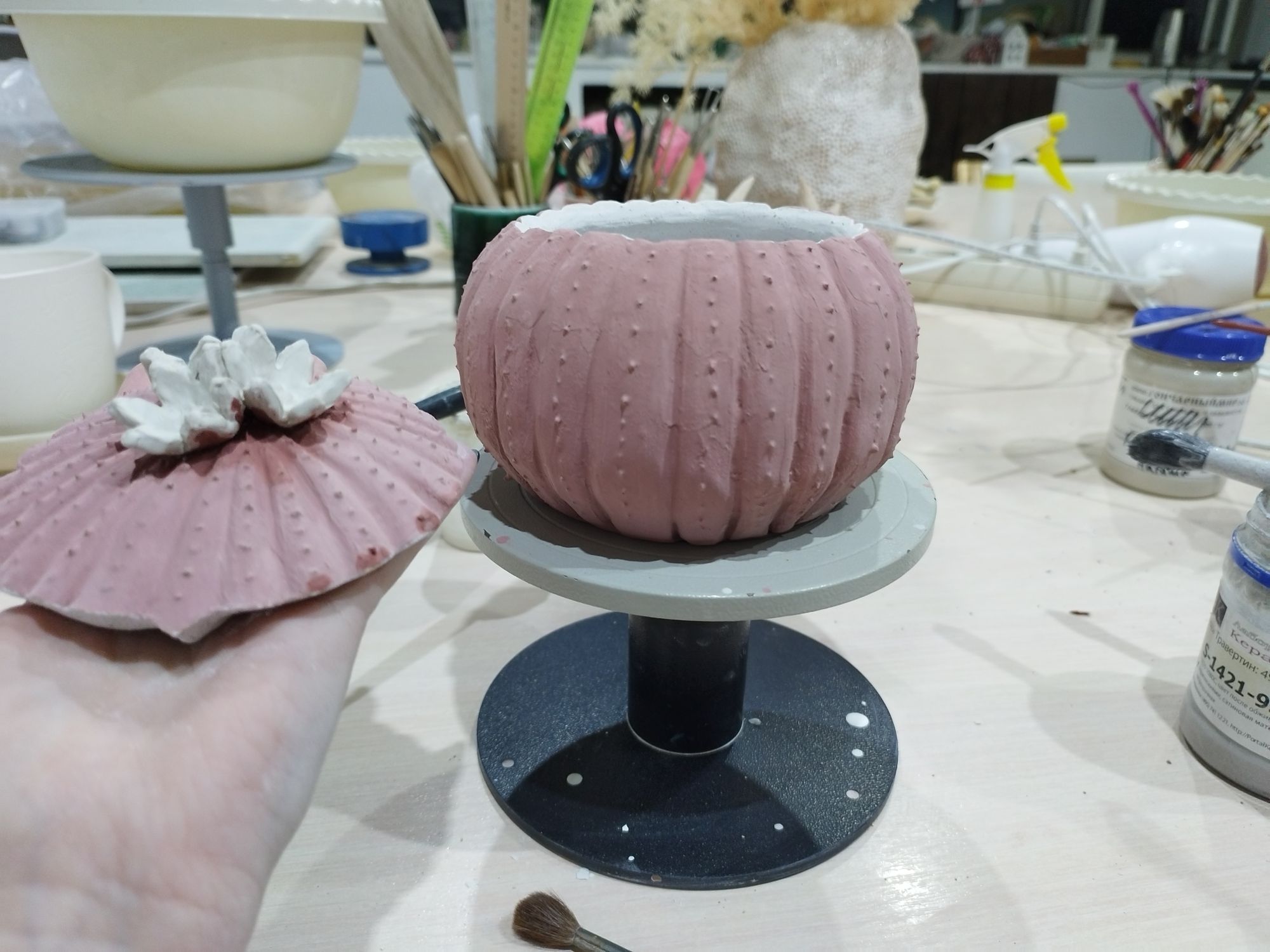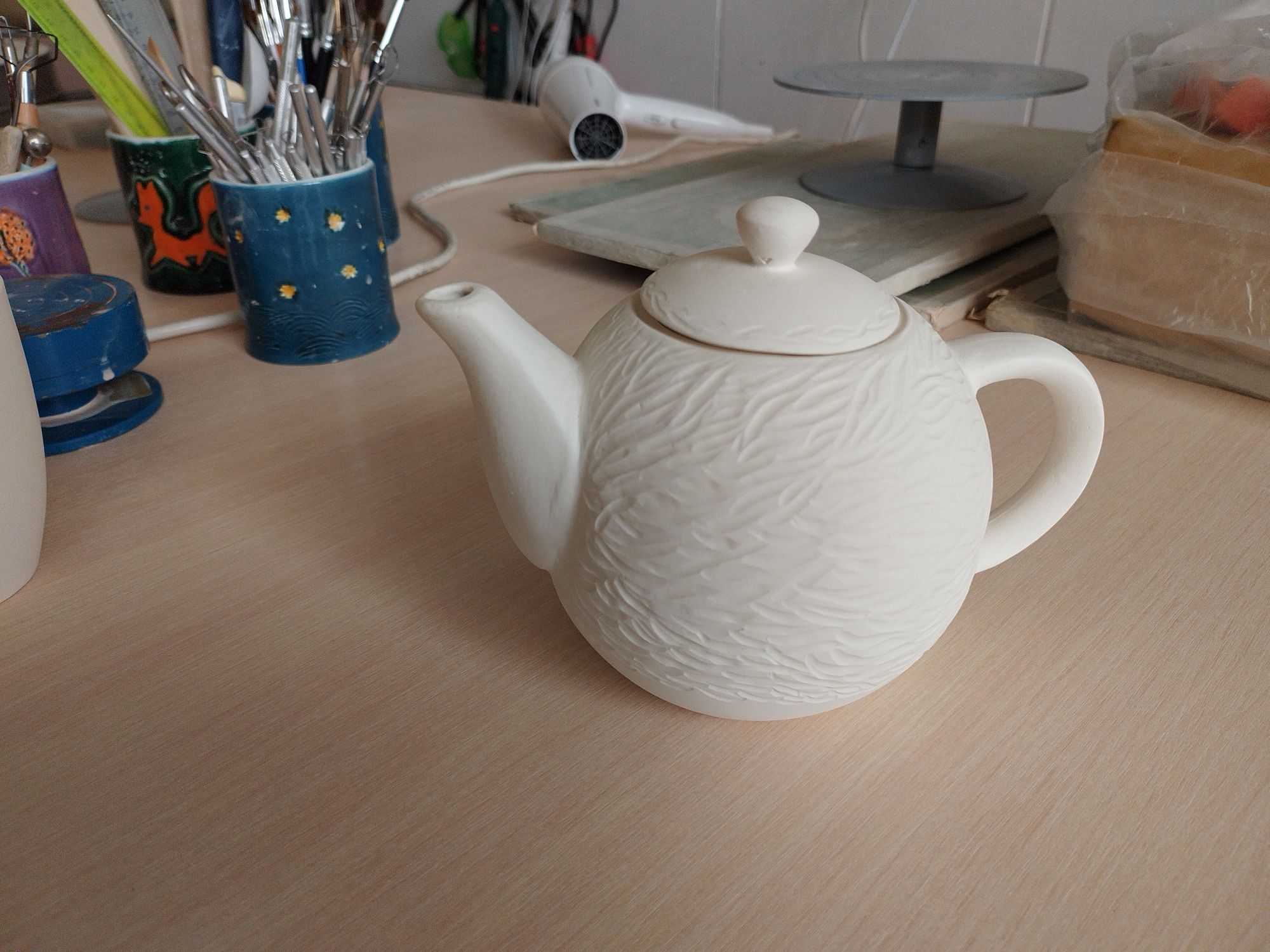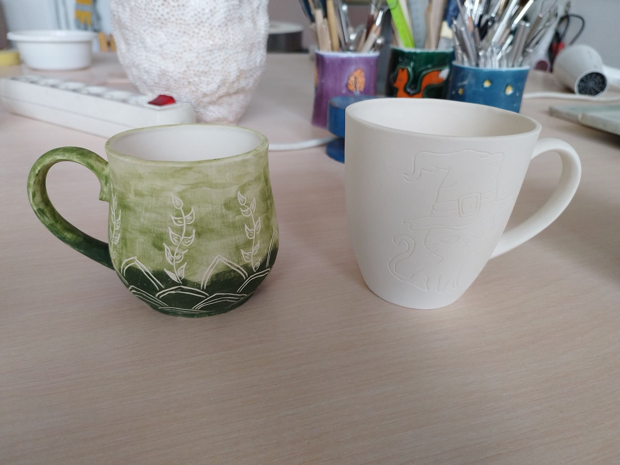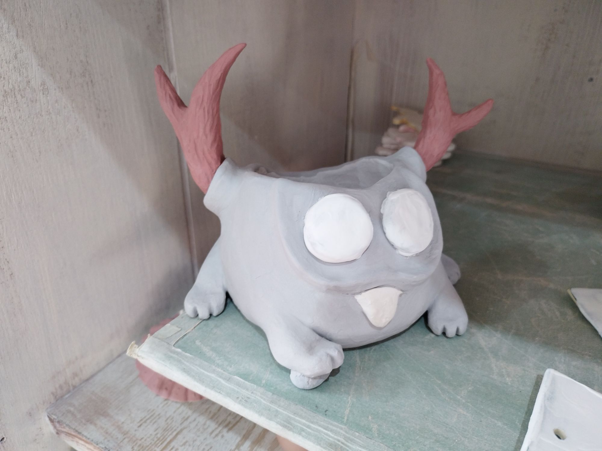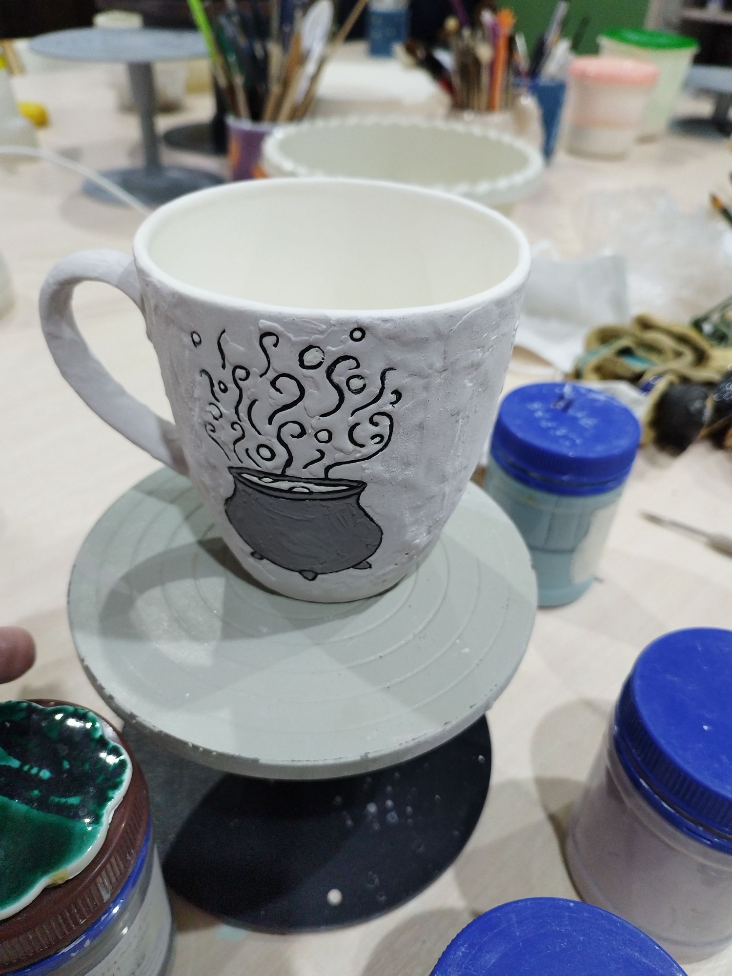 20 июня 2023 Всем привет! Спустя энное количество времени продолжаю рассказ про своё обучение) После обжига появилось несколько трещинок, но для обучения это всё равно в плюс, так как научилась их заделывать. Оказалось всё гораздо легче, чем я думала. А после покрытия глазури их совершенно не видно. Но в целом все изделия всё хорошо пережили, прилично усели и наступил момент глазурования)) Вот они, обожженные, ждут финишного покрытия)) На словах "можете выбирать один день" (подчёркиваю ОДИН), мы посмеялись и выбрали ДВА дня. Изделий прилично, некоторые достаточно сложные, опыта нет, в сутках время ограниченно ... В общем 11 и 12 июня я с утра и до ночи заделывали трещинки, выравнивали, а потом глазуровала изделия... В первый день сначала мы изучали покрытие белой и прозрачной глазури максимально быстрым способом, залить, прокрутить и вылить. Но по ходу я недолевша, упорно крутила в другую сторону из-за чего образовались небольшие проплешинки. Будь глазурь более видна на изделии, то можно было бы подкрасить кисточкой, но увы, что имеем)) Далее покрывали изделия уже кисточками. После адского нанесения кисточкой прозрачной и белой глазури, все остальные показались просто раем) Она застывала толстой каплей, не тянулась, бугрилась... ррр... Правда в готовом изделии всё прилично выглядит До первого итогового обжига совершенно не было понимания по толщине глазурного слоя. Моя логика, пигмент яркий, всё изделие покрыл - значит всё ок! А по факту надо 2-3 таких слоя... до обжига посл обжига в глазури до обжига итог На второй день делала свою жабочку и чашку с котом. Лёгких путей я ни когда по ходу не искала. Да и нужно же попробовать разные техники, инструменты, материалы, что бы понимать, что мне нужно, что нравится. В итоге это привело к тому, что с превеликим удовольствием процарапывала кота и пар от котелка, выбрав достаточно сложный, многоэлементный рисунок. И как же я запарилась всё это глазуровать в итоге Не, ну кто же мог подумать, что сначала все линии нужно обвести, что на подглазурную краску отлично затекает глазурь и всё надо по новой счищать и обводить, что есть резерв, но его нужно ооочень аккуратно наносить, тк он не стирается. Правда резервом мне работать понравилось гораздо больше, а линии и так старалась аккуратно наносить. В процессе работы думала, ну почему же я не могла выбрать рисунок попроще, с 2-3 цветами, например как на наклейке приведение с сердечком... За день не успела доделать, приходила ещё 13-го после работы. Работы заглазуровала и оставила на обжиг. В пятницу пришло сообщение с фото и видео работ Чашка с котом получилась плоховато, да и жабку тонко покрыла... В итоге в субботу приезжала на повторное покрытие. На удивление, наносить было гораздо удобней, чем по утилю. Так что в итоге потратила 3,5 дня на это всё. Жду теперь фотографий итоговых, любопытно же!))) А вот что уже готово)) Не всё вышло идеально, есть недочёты, мой перфекционизм, эффект "ожидание-реальность", мало опыта, ограниченный выбор глазури. Но в любом случае это бесценный опыт и старт для дальнейшего развития. Когда начала дома делать первое самостоятельное изделие, пришло ещё больше понимания по инструментам. Без чего могу обойтись, а что мне необходимо. Появились вопросы, которые не возникали на курсе. Вот зарождается моя первая самостоятельная работа)) Маленький, увесистый)) bersit