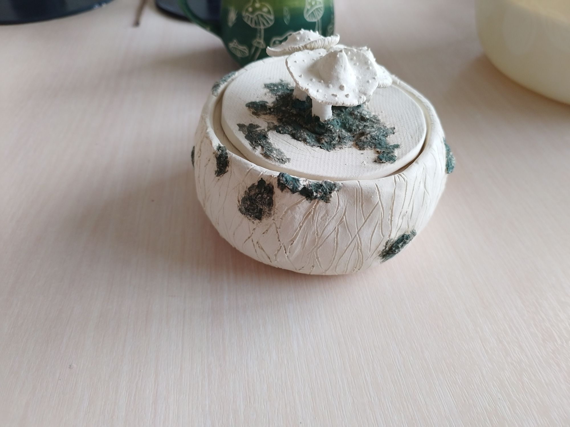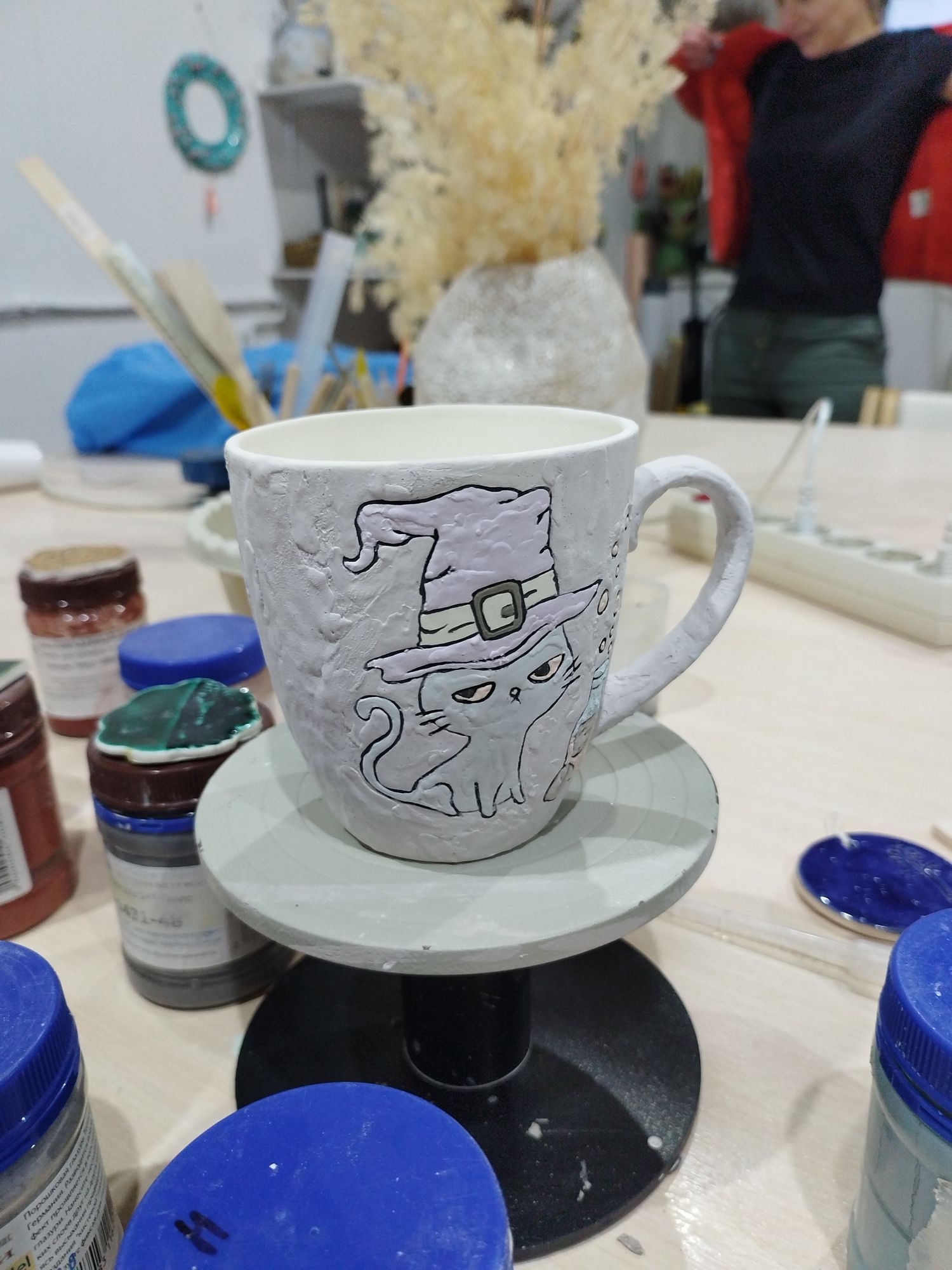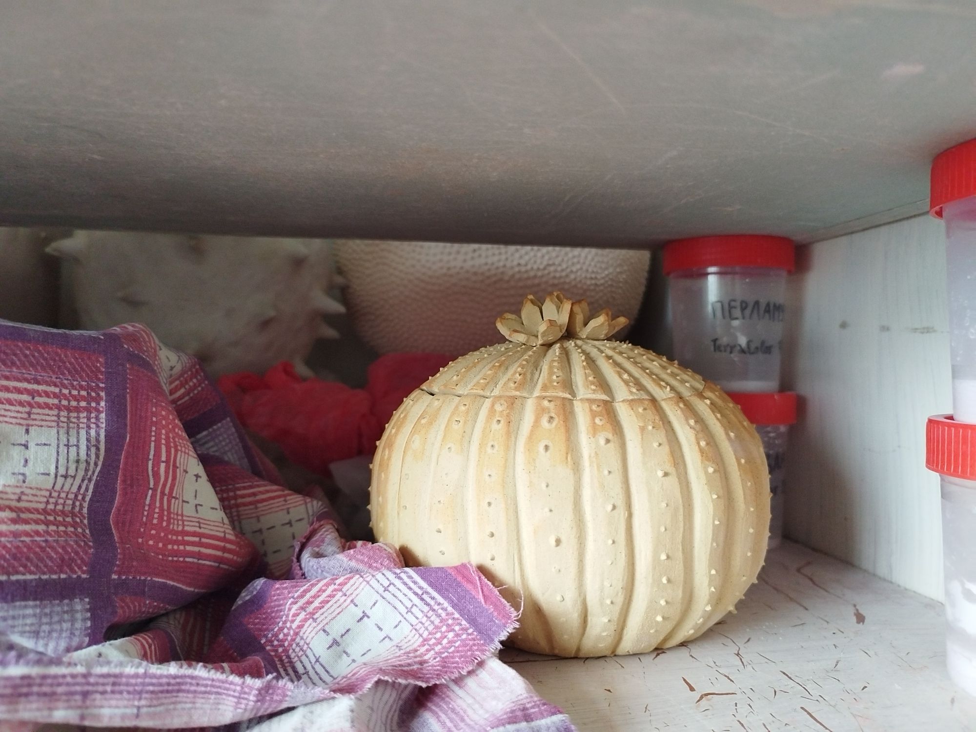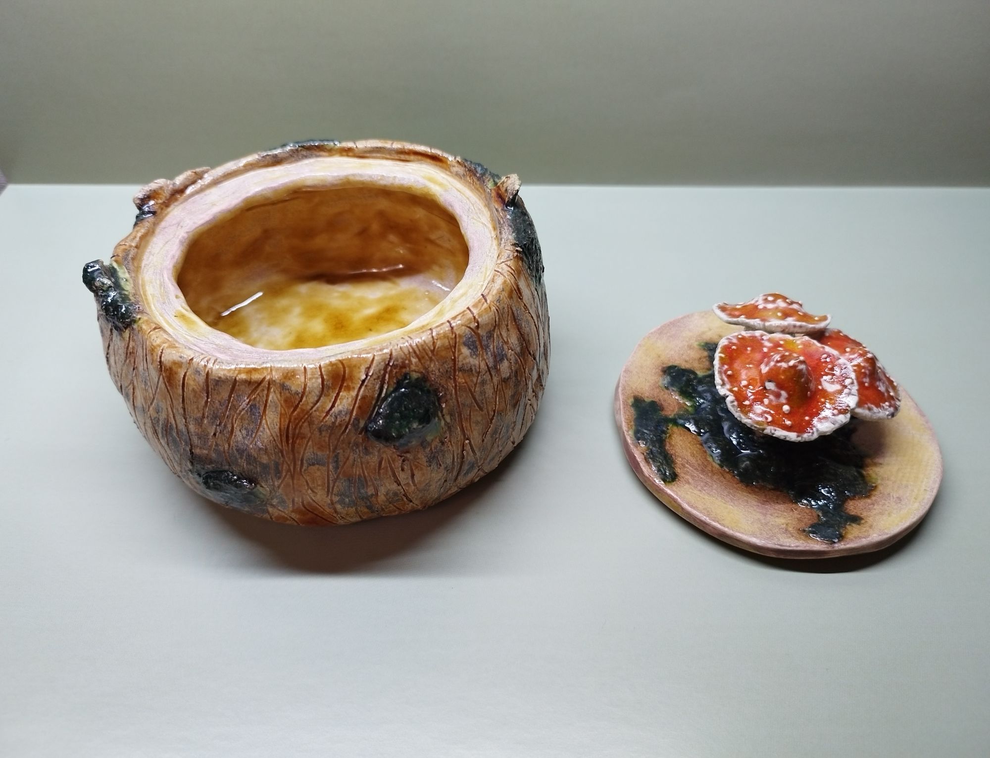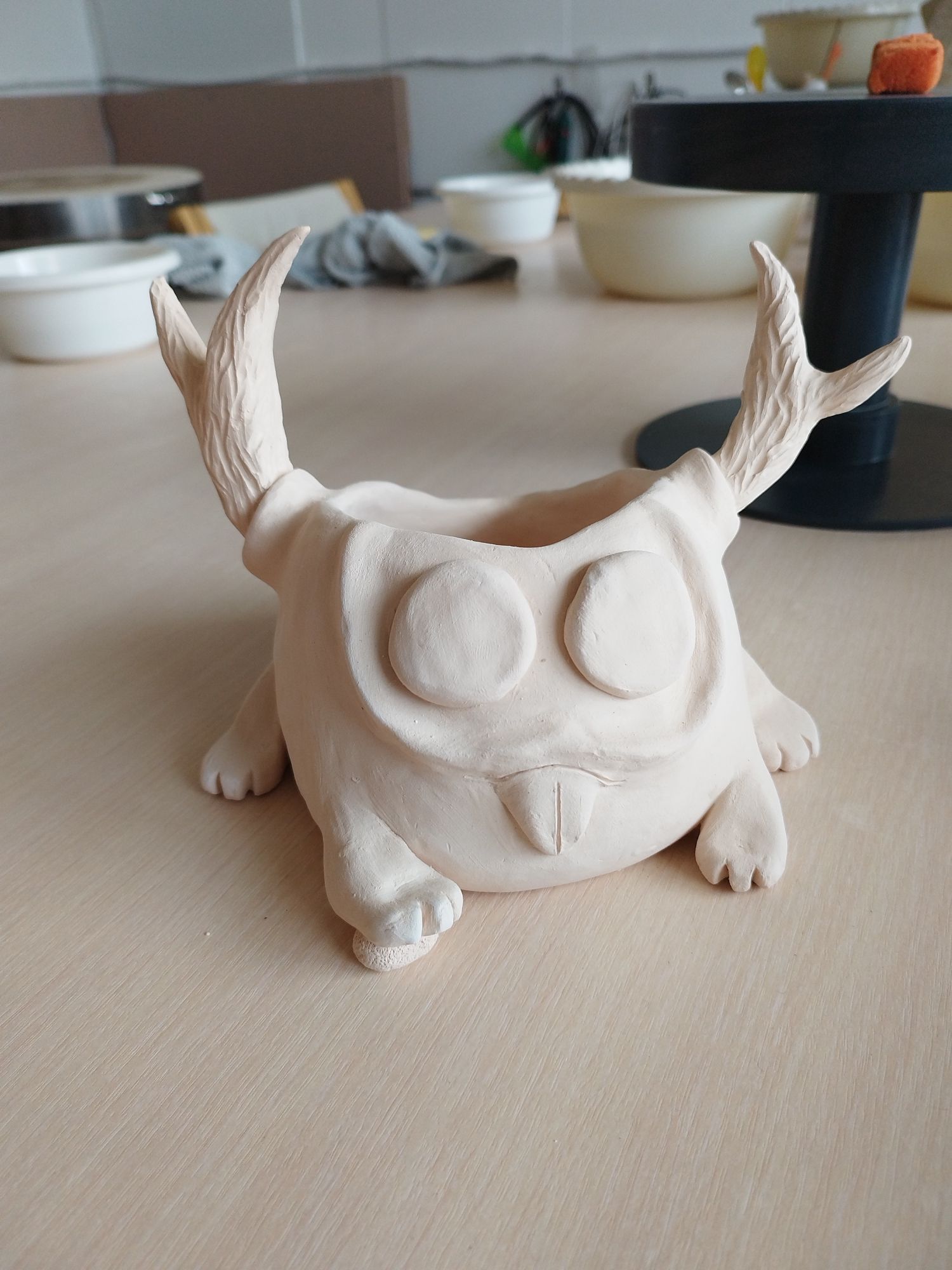 20 июня 2023 Всем привет! Спустя энное количество времени продолжаю рассказ про своё обучение) После обжига появилось несколько трещинок, но для обучения это всё равно в плюс, так как научилась их заделывать. Оказалось всё гораздо легче, чем я думала. А после покрытия глазури их совершенно не видно. Но в целом все изделия всё хорошо пережили, прилично усели и наступил момент глазурования)) Вот они, обожженные, ждут финишного покрытия)) На словах "можете выбирать один день" (подчёркиваю ОДИН), мы посмеялись и выбрали ДВА дня. Изделий прилично, некоторые достаточно сложные, опыта нет, в сутках время ограниченно ... В общем 11 и 12 июня я с утра и до ночи заделывали трещинки, выравнивали, а потом глазуровала изделия... В первый день сначала мы изучали покрытие белой и прозрачной глазури максимально быстрым способом, залить, прокрутить и вылить. Но по ходу я недолевша, упорно крутила в другую сторону из-за чего образовались небольшие проплешинки. Будь глазурь более видна на изделии, то можно было бы подкрасить кисточкой, но увы, что имеем)) Далее покрывали изделия уже кисточками. После адского нанесения кисточкой прозрачной и белой глазури, все остальные показались просто раем) Она застывала толстой каплей, не тянулась, бугрилась... ррр... Правда в готовом изделии всё прилично выглядит До первого итогового обжига совершенно не было понимания по толщине глазурного слоя. Моя логика, пигмент яркий, всё изделие покрыл - значит всё ок! А по факту надо 2-3 таких слоя... до обжига посл обжига в глазури до обжига итог На второй день делала свою жабочку и чашку с котом. Лёгких путей я ни когда по ходу не искала. Да и нужно же попробовать разные техники, инструменты, материалы, что бы понимать, что мне нужно, что нравится. В итоге это привело к тому, что с превеликим удовольствием процарапывала кота и пар от котелка, выбрав достаточно сложный, многоэлементный рисунок. И как же я запарилась всё это глазуровать в итоге Не, ну кто же мог подумать, что сначала все линии нужно обвести, что на подглазурную краску отлично затекает глазурь и всё надо по новой счищать и обводить, что есть резерв, но его нужно ооочень аккуратно наносить, тк он не стирается. Правда резервом мне работать понравилось гораздо больше, а линии и так старалась аккуратно наносить. В процессе работы думала, ну почему же я не могла выбрать рисунок попроще, с 2-3 цветами, например как на наклейке приведение с сердечком... За день не успела доделать, приходила ещё 13-го после работы. Работы заглазуровала и оставила на обжиг. В пятницу пришло сообщение с фото и видео работ Чашка с котом получилась плоховато, да и жабку тонко покрыла... В итоге в субботу приезжала на повторное покрытие. На удивление, наносить было гораздо удобней, чем по утилю. Так что в итоге потратила 3,5 дня на это всё. Жду теперь фотографий итоговых, любопытно же!))) А вот что уже готово)) Не всё вышло идеально, есть недочёты, мой перфекционизм, эффект "ожидание-реальность", мало опыта, ограниченный выбор глазури. Но в любом случае это бесценный опыт и старт для дальнейшего развития. Когда начала дома делать первое самостоятельное изделие, пришло ещё больше понимания по инструментам. Без чего могу обойтись, а что мне необходимо. Появились вопросы, которые не возникали на курсе. Вот зарождается моя первая самостоятельная работа)) Маленький, увесистый)) bersit