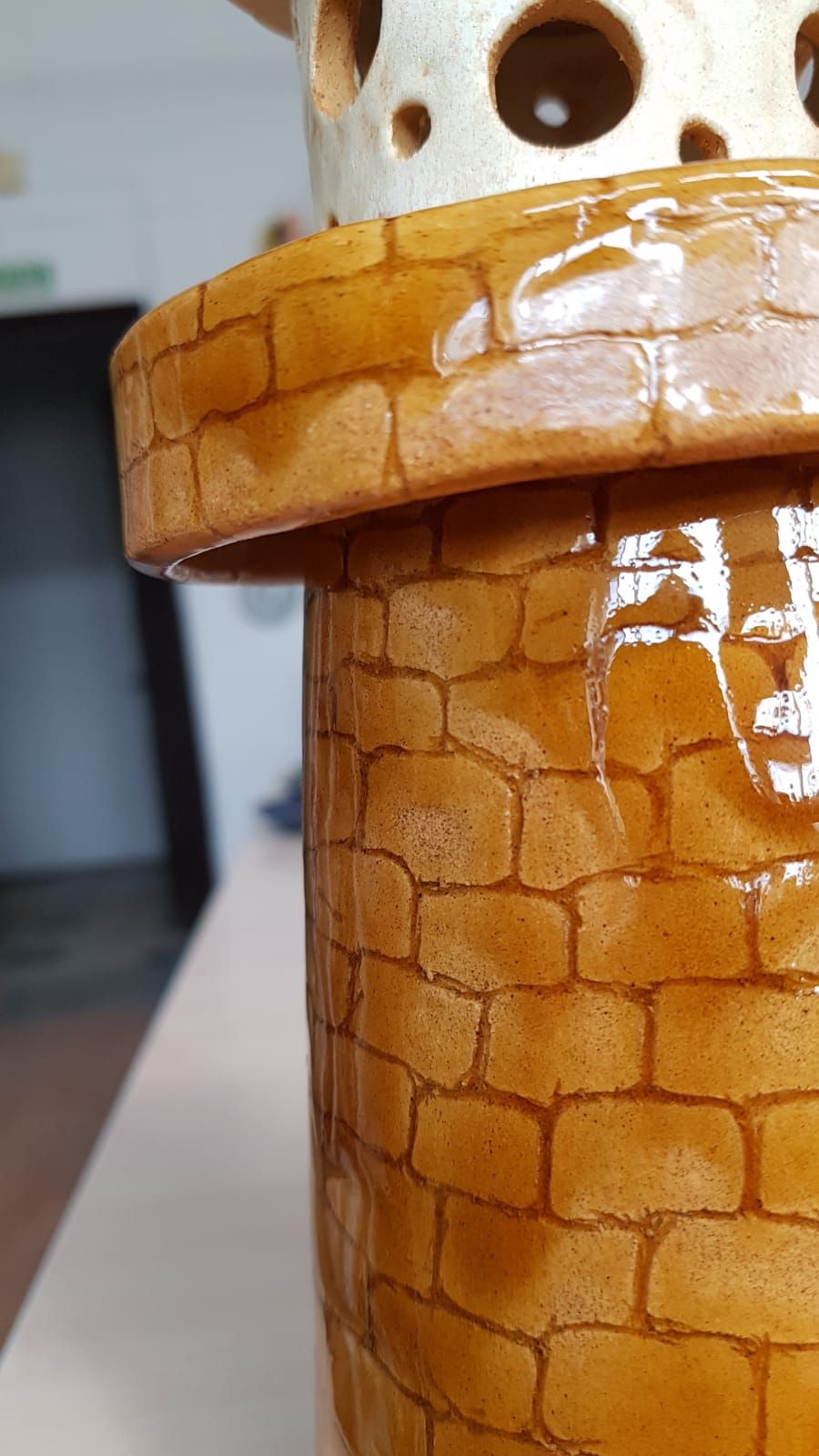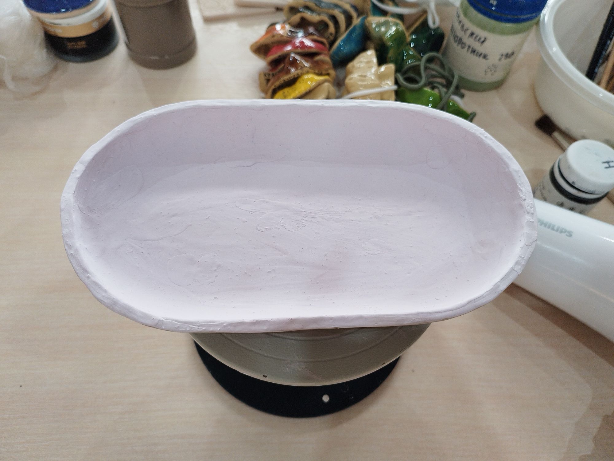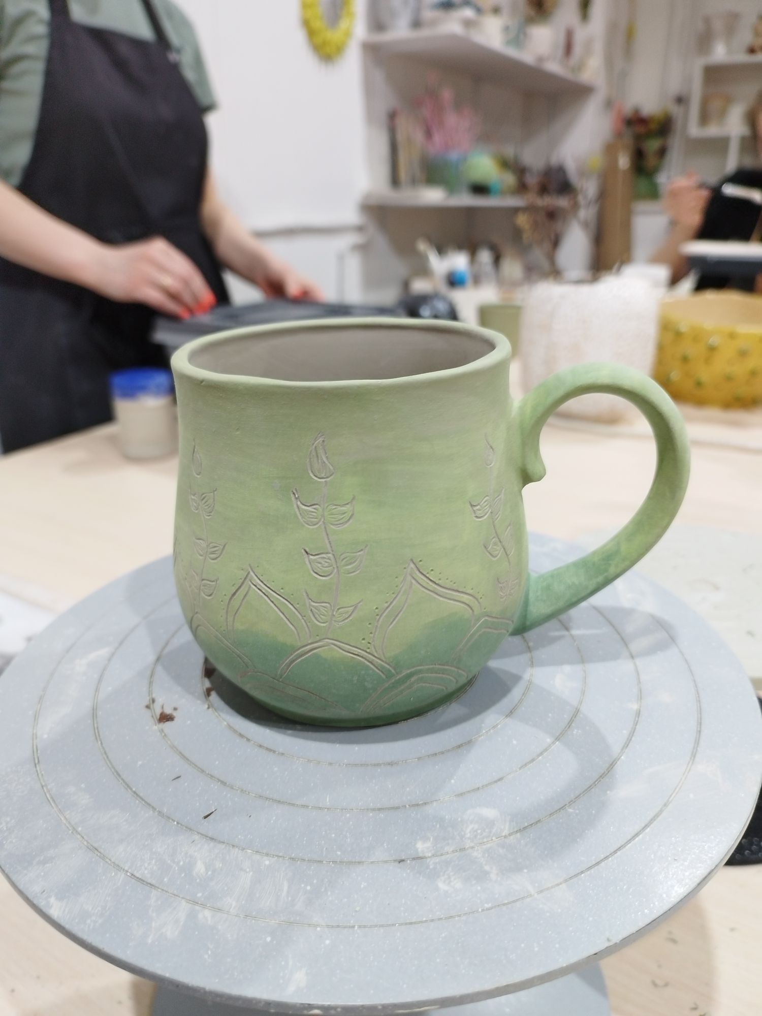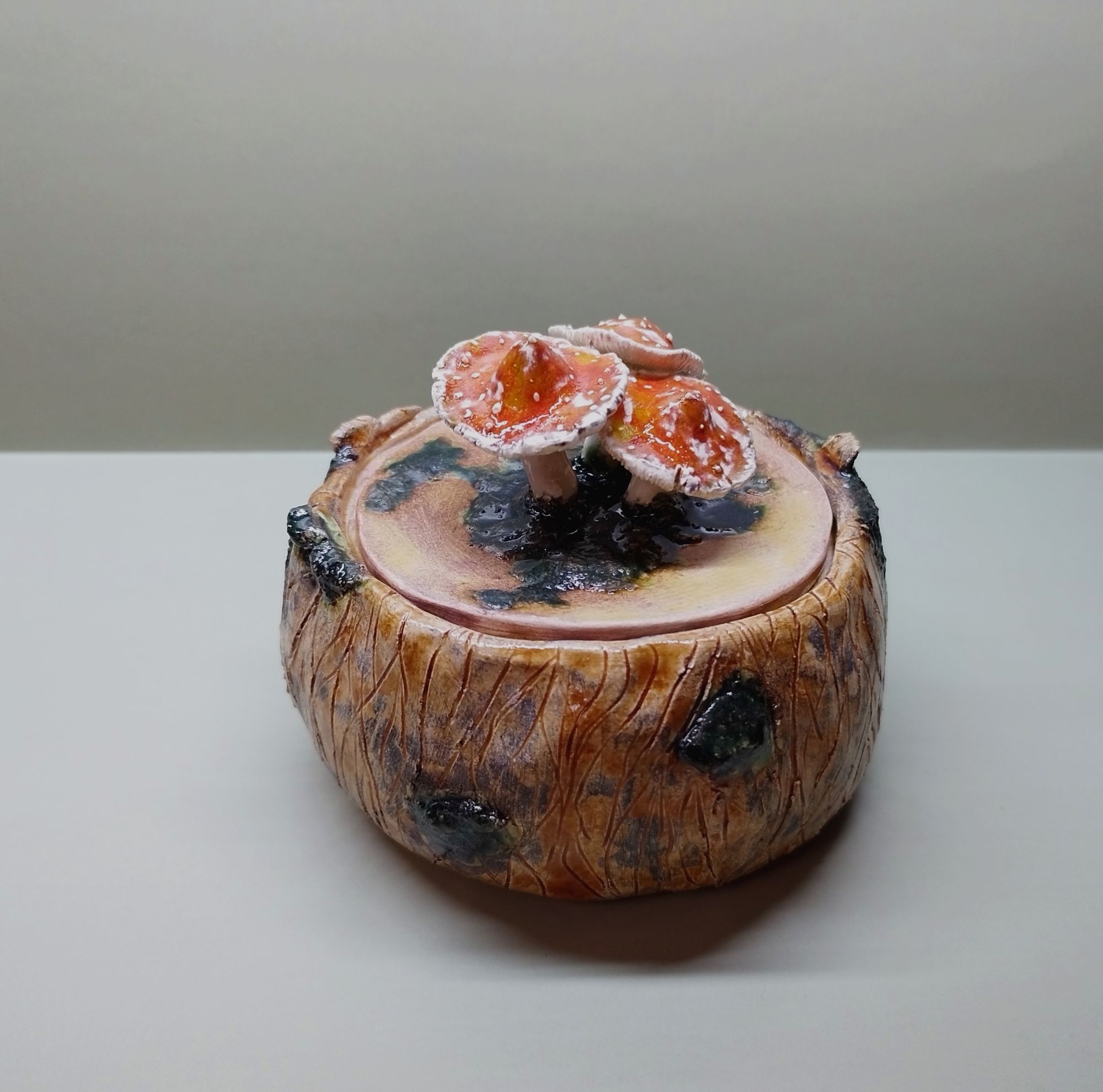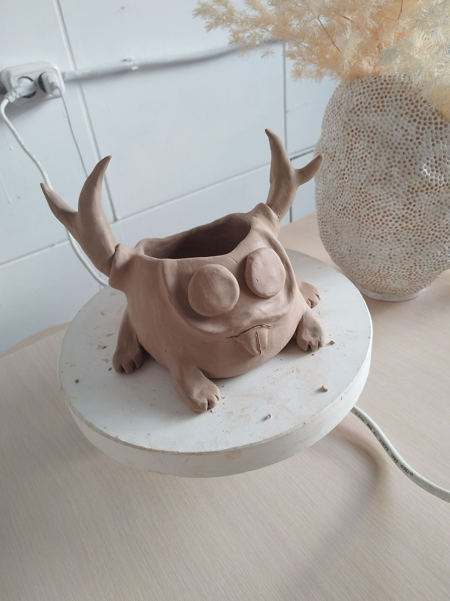20 июня 2023 Всем привет! Спустя энное количество времени продолжаю рассказ про своё обучение) После обжига появилось несколько трещинок, но для обучения это всё равно в плюс, так как научилась их заделывать. Оказалось всё гораздо легче, чем я думала. А после покрытия глазури их совершенно не видно. Но в целом все изделия всё хорошо пережили, прилично усели и наступил момент глазурования)) Вот они, обожженные, ждут финишного покрытия)) На словах "можете выбирать один день" (подчёркиваю ОДИН), мы посмеялись и выбрали ДВА дня. Изделий прилично, некоторые достаточно сложные, опыта нет, в сутках время ограниченно ... В общем 11 и 12 июня я с утра и до ночи заделывали трещинки, выравнивали, а потом глазуровала изделия... В первый день сначала мы изучали покрытие белой и прозрачной глазури максимально быстрым способом, залить, прокрутить и вылить. Но по ходу я недолевша, упорно крутила в другую сторону из-за чего образовались небольшие проплешинки. Будь глазурь более видна на изделии, то можно было бы подкрасить кисточкой, но увы, что имеем)) Далее покрывали изделия уже кисточками. После адского нанесения кисточкой прозрачной и белой глазури, все остальные показались просто раем) Она застывала толстой каплей, не тянулась, бугрилась... ррр... Правда в готовом изделии всё прилично выглядит До первого итогового обжига совершенно не было понимания по толщине глазурного слоя. Моя логика, пигмент яркий, всё изделие покрыл - значит всё ок! А по факту надо 2-3 таких слоя... до обжига посл обжига в глазури до обжига итог На второй день делала свою жабочку и чашку с котом. Лёгких путей я ни когда по ходу не искала. Да и нужно же попробовать разные техники, инструменты, материалы, что бы понимать, что мне нужно, что нравится. В итоге это привело к тому, что с превеликим удовольствием процарапывала кота и пар от котелка, выбрав достаточно сложный, многоэлементный рисунок. И как же я запарилась всё это глазуровать в итоге Не, ну кто же мог подумать, что сначала все линии нужно обвести, что на подглазурную краску отлично затекает глазурь и всё надо по новой счищать и обводить, что есть резерв, но его нужно ооочень аккуратно наносить, тк он не стирается. Правда резервом мне работать понравилось гораздо больше, а линии и так старалась аккуратно наносить. В процессе работы думала, ну почему же я не могла выбрать рисунок попроще, с 2-3 цветами, например как на наклейке приведение с сердечком... За день не успела доделать, приходила ещё 13-го после работы. Работы заглазуровала и оставила на обжиг. В пятницу пришло сообщение с фото и видео работ Чашка с котом получилась плоховато, да и жабку тонко покрыла... В итоге в субботу приезжала на повторное покрытие. На удивление, наносить было гораздо удобней, чем по утилю. Так что в итоге потратила 3,5 дня на это всё. Жду теперь фотографий итоговых, любопытно же!))) А вот что уже готово)) Не всё вышло идеально, есть недочёты, мой перфекционизм, эффект "ожидание-реальность", мало опыта, ограниченный выбор глазури. Но в любом случае это бесценный опыт и старт для дальнейшего развития. Когда начала дома делать первое самостоятельное изделие, пришло ещё больше понимания по инструментам. Без чего могу обойтись, а что мне необходимо. Появились вопросы, которые не возникали на курсе. Вот зарождается моя первая самостоятельная работа)) Маленький, увесистый)) bersit