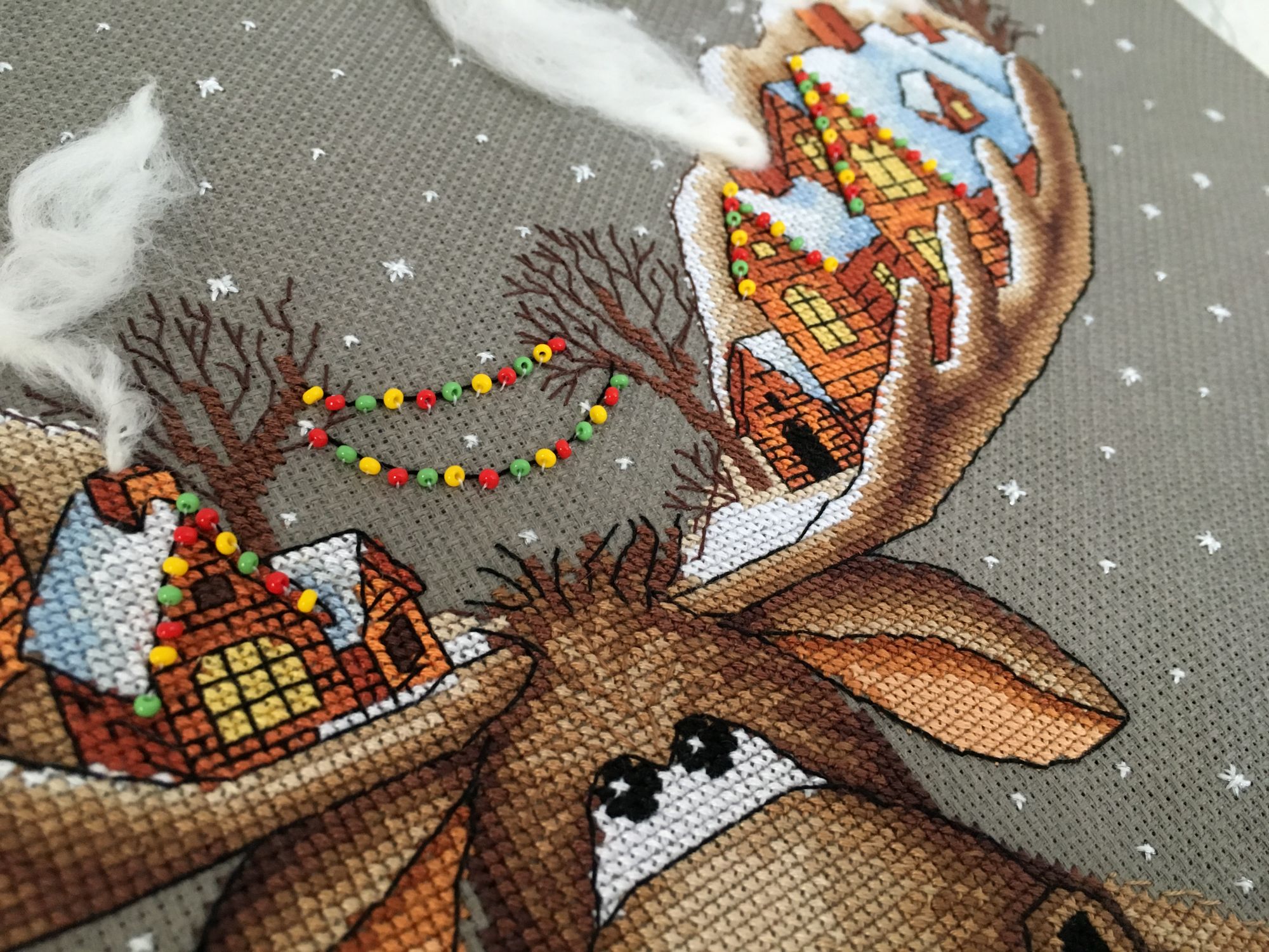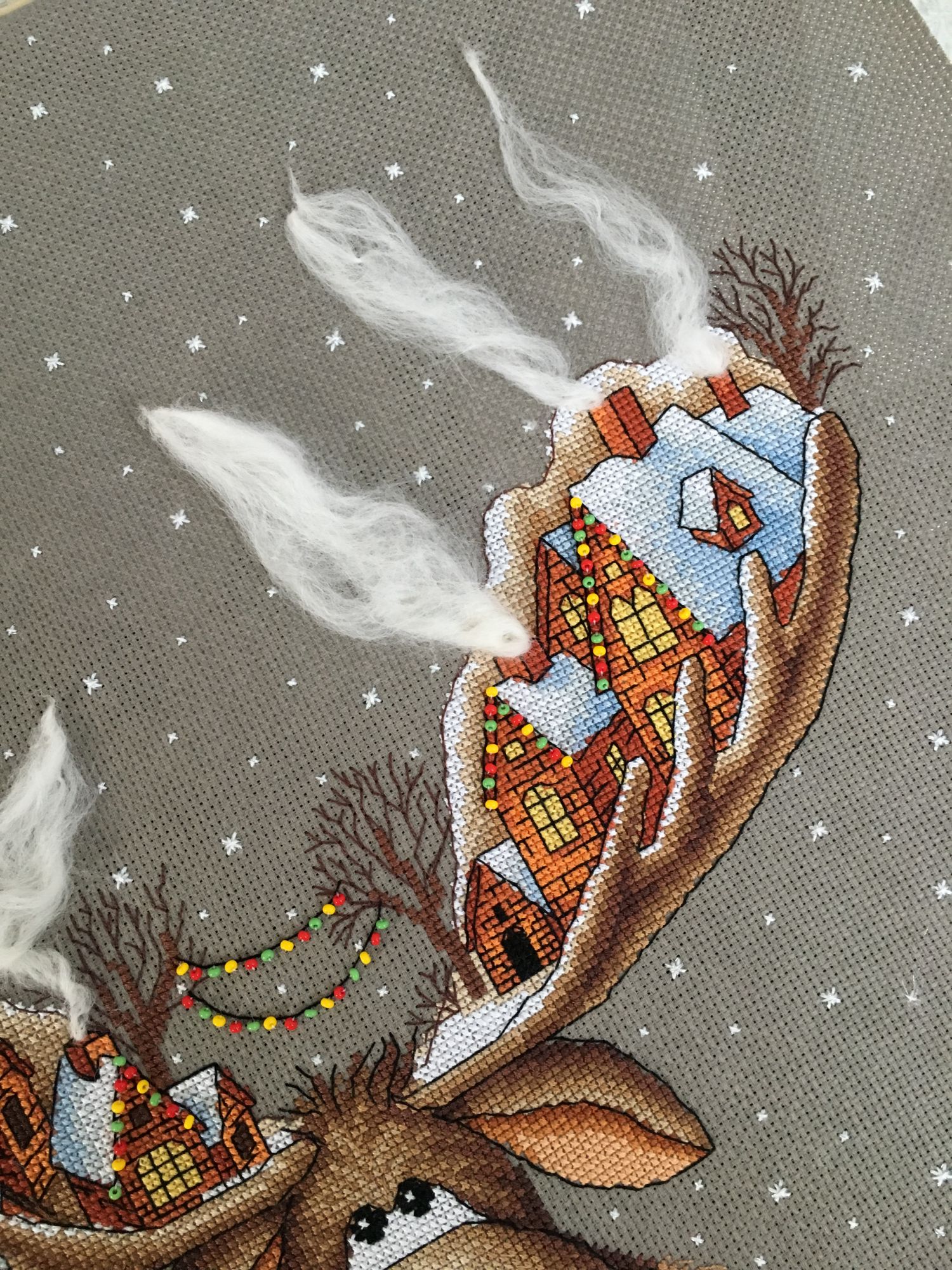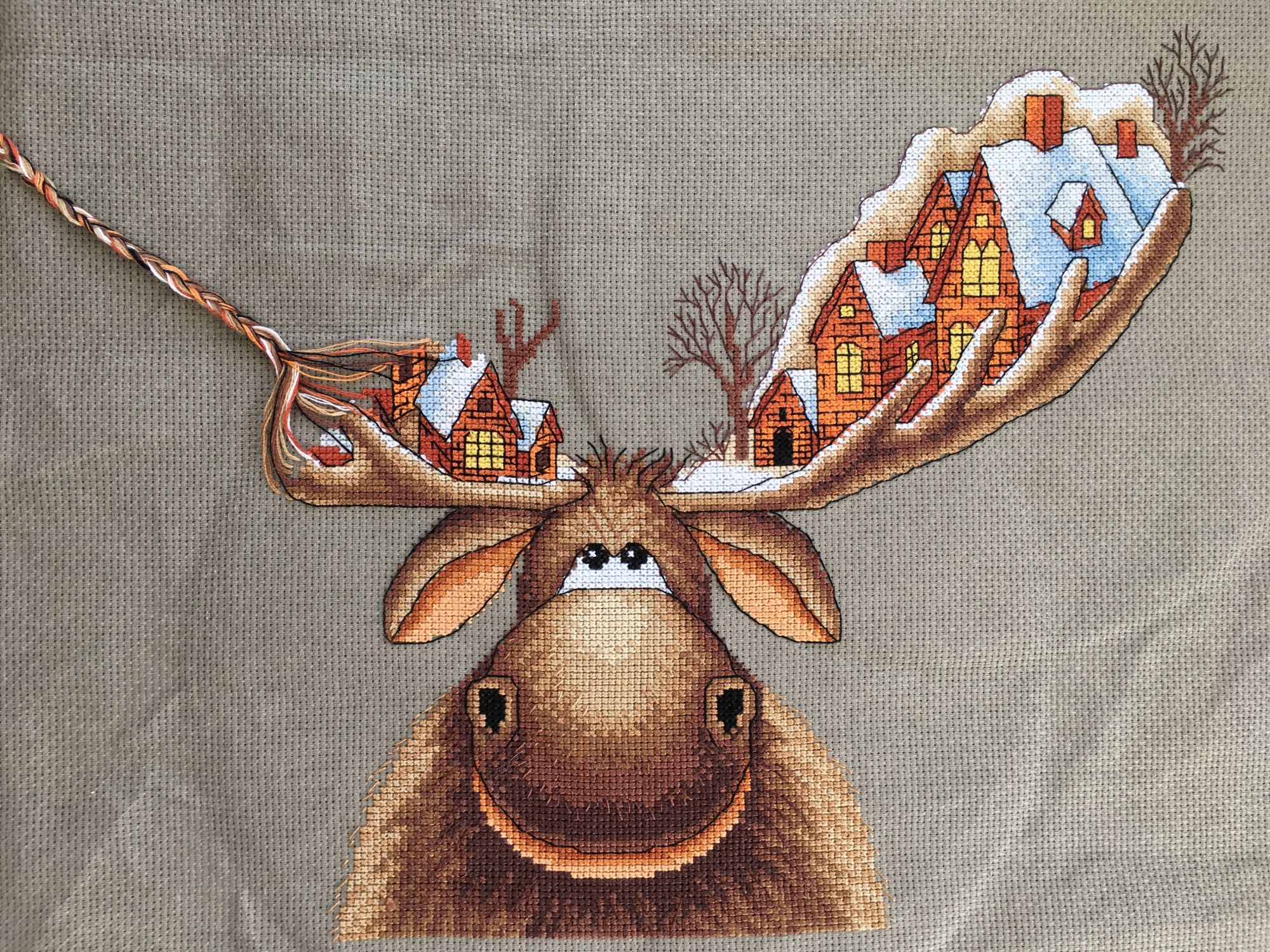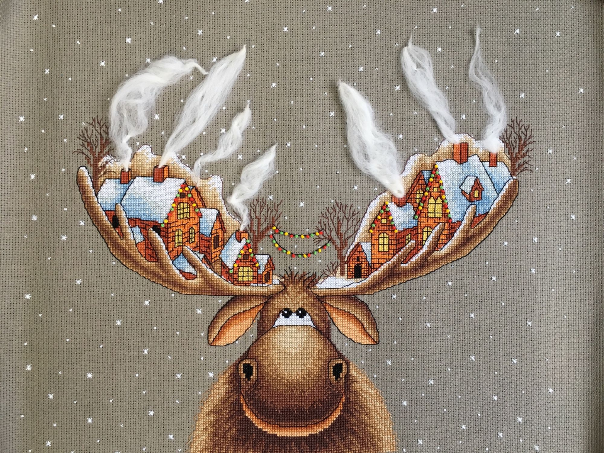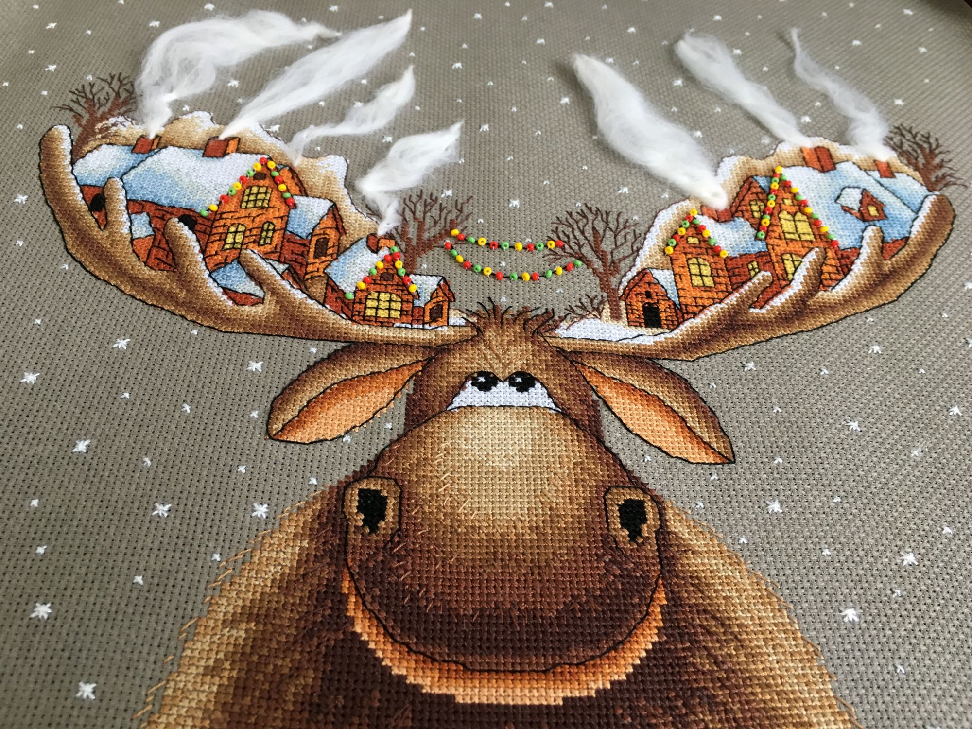 26 марта 2019 Вот и готов мой Рождественский лось, 28х33см,18 цв мулине Гамма хб , аида 16 графит( по моему цвет),3 цв бисера и шерсть,2иголочки,счетный крест-моя любовь любовь Кач во набора хорошее( как и у всех наборов от Панны - мне нравится ,претензий нет! )Только показалось ,что канва тоньше,нитки почему то немного пушились в конце -но это не критично!Осталось ниточек-нормально,бисер тоже остался ,а шерсти -куча )еще на 20 лосей хватит)Вышивала с 23.01.-25.03. Почти каждый день по 2ч примерно.Процесс очень интересный ,даже бэк ( который не люблю) в этой работе за радость был) Дробила его ,по 3 кл максимум стежки -дабы) не провис при стирке ( был такой опыт(( )Бисер и дым начала сначала пришивать по схеме ,потом уже сама примерно на глаз по превью-так легче показалось .И ещё от себя в неск х местах добавила бэк,где его не было по схеме.Захотела чтоб Лосяшка был в снегу)-наляпала снежинок ( кажется переборщила немного) -шерсть Риолис 1нить Серебро металлизированная китай нить( конечно это была жесть)-этот тандем рвался ,пушился-но я это сделала!!!)Вообщем вышивался этот Чудик) на одном дыхании ! До сих пор смотрю и вздыхаю -как я его обожаю! Оформлю позже . maui сказал(а) спасибо Поделиться сообщением Ссылка на сообщение