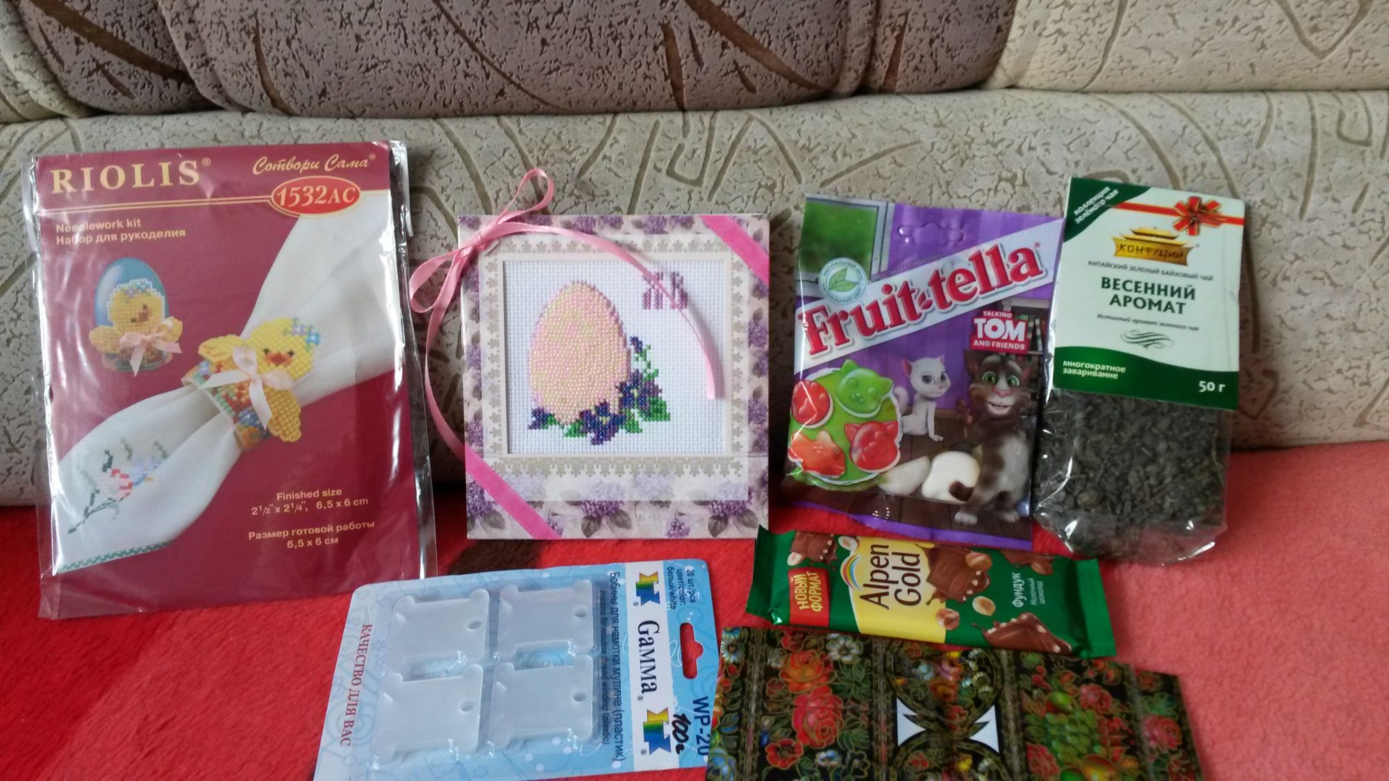 19 апреля 2016 Девочки, всем привет! Я с отчетом. Даже не думала, что буду первым получателем. Вчера еще мама с почты забрала пакет с сюрпризом, а принесла мне его только сегодня (неудобно мне с ребенком на почту ходить). Я в таком нетерпении была... Сюрприз-подарок приехал ко мне от Яны (belyasik). Первое, что я увидела это как раз рукоделка. Это замечательная пасхальная открытка с вышивкой крестом и бисером, и с душевными пожеланиями внутри Еще Яна мне подарила набор для изготовления пасхального украшения. Мне очень понравился. Еще успею к пасхе сделать замечательного цыпленка. Так же в посылке были очень нужные пластиковые бобинки жля мулине и термоэтикетки для яиц. Ну и конечно же сладкое к чаю: шоколадка с фундуком и мармелад. Яна, этом мармелад очень любит моя дочка . И сам чай зеленый китайский, а на внутренней стороне этикетки написано про пользу зеленого чая и про церемонию заваривания чая. Там написано, что первая заварка всегда дает лучший аромат, а вторая заварка - лучший вкус. Зеленый чай я пью. А китайский зеленый чай вообще не сравнить ни с какими другими. И общий вид подарка: Яночка, спасибо огромное за такой душевный подарок! Мне всё-всё очень понравилось! Спасибо за ощущение праздника! bukina88, dolli7, Чивава и 18 других сказали спасибо Поделиться сообщением Ссылка на сообщение