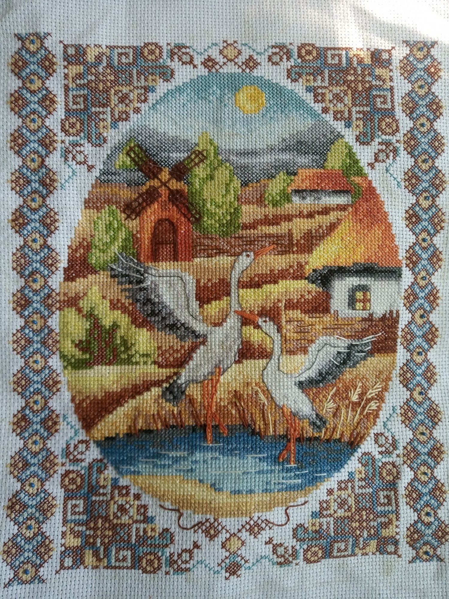 24 августа 2019 Чаривна мить ВТ-011 На заливных лугах Работа моей мамы. Поделюсь впечатлениями,. Канва хорошая, в меру плотная, я начинала шить этот набор еще 1,5 года назад, разметила канву водорастворимым маркером, и чудо - когда мама его дошила, маркер хорошо отстирался. Нитки Бестекс неплохие, во всяком случае не рвались, но не хватило номера 26 на органайзере, мы подобрали их запасов, остальных ниток было больше чем достаточно. Бисер... два цвета, в ключе на схеме все перепутано, нужно смотреть на обложку набора. Для темно-красного бисера - очень мелкого - вложенная в набор иголка не подошла, заморачиваться с покупкой иглы я не стала, поэтому глаза вышила французскими узелками, а в орнамент бисер не вшивала. Схема обычная глянцевая, мне уже такую шить сложно (в 38 лет заказала первые очки). Ну а история этой вышивки грустная, вышивка оказалась символичной. Когда мама дошивала - мы остались одни, умер папа... С оформление пока подожду, но в целом набором мы довольны bibiju, Loculus, Vika71 и 12 других сказали спасибо Поделиться сообщением Ссылка на сообщение