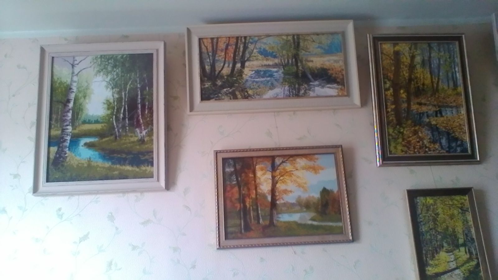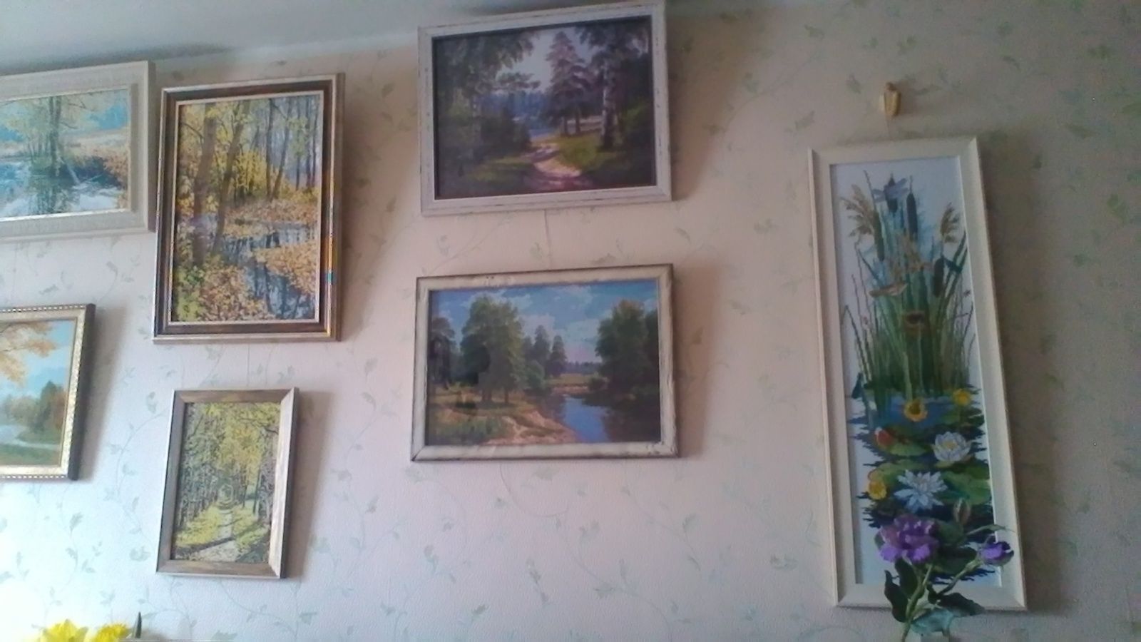 28 февраля 2018 . Показала в галерее, показываю и здесь, как мы разместили все пейзажи. Пришлось перевешивать все вышивки. Пейзажи поменяли прописку. Разместили на другой стене, прямо перед моим рабочним креслом. Теперь буду вышивать и любоваться. Раньше здесь висели семейные фотографии и некоторые вышивки. Теперь они переезжают на противоположную сторону. Если учесть, что есть еще и вышивки на подарки, то места на все катострофически не хватает. А я люблю, чтобы подарки некоторое время повисели передо мной. Я налюбуюсь, тогда дарю. Однажды отдала сразу, до сих пор жалею, что не насмотрелась, не налюбовалась. Сейчас у меня есть две "бесхозные " работы (Мадонна с младенцем и Поэзия). Возможно, если в субботу кому-нибудь понравятся, отдам. Пока повешу к пейзажам, чтобы успеть рассмотреть все как следует. Хозяйка смешных зверей, ОльгаВл, ЛюдмилаЕр и 14 других сказали спасибо Поделиться сообщением Ссылка на сообщение