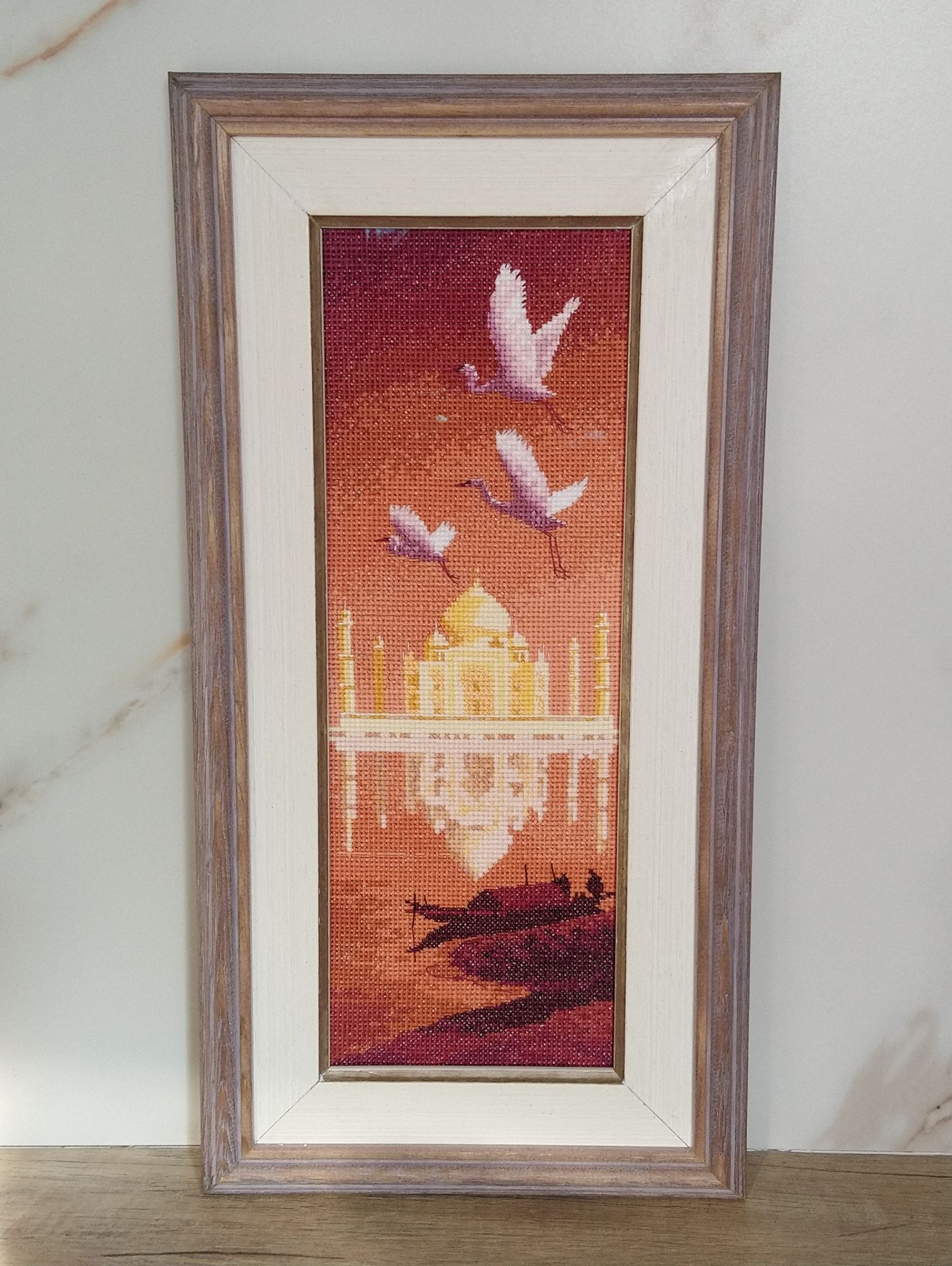 8 ноября 2022 Привет всем, кто заглянул на огонек! С последнего отчета прошло довольно много времени. Период неписанца сменялся невышиванцем, на смену ему спешил нечитанец, потом они смешивались и не торопились уходить. Сейчас все наладилось, но на работе такая вобла, что всегда очень хочется только спать. Впрочем, все это лирика, переходим к отчету. Все фото не в гайку Начну, пожалуй, с последней вышитой работы. Сейчас уже и не вспомню, с чего и как все началось, но попались мне в базе наборов эти сезонные миниатюры от Риолис, были добавлены в хотелки, найдены на Авито, и почти куплены. Потом прошло время, я переключилась на поиски чего-то другого. Вот этот поиск все же привел к тому, что набор был куплен за 100 рублей с самовывозом в Питере. Дело было в мае, но увиделись мы только в октябре)), когда дочка приезжала в гости. Потом я нашла подходящую рамочку из готовых в Багет Идея (Оля, узнешь багет?), ждала ее, чтобы точно определиться с размером работы и вышила за рекордные 6 дней. Вложенную канву 10 каунта, заменила на равномерку, размер, пришлось подгонять, конечно. Зато небо стало выше, а лес гуще)) Размер получился 12*14 см. Для меня это Карелия. Солнечная, гостеприимная, светлая и чистая, умытая первым весенним ливнем. Сморю на нее и радостно на душе. Ну, а до этого был период завершения начатого. Мечта о Зеленой Гайке не давала покоя Стояла задача максимум завершить 4 процесса. И если подсолнухи от Милл Хилл вышивались споро и весело то Ангел Домашнего очага откладывался до последнего. Дело в том, что с ним произошел казус, он декапитировался и имел очень жалкий вид. Оказалось, что заготовки очень хрупкие и попытка немного выровнять положение головы закончилась трагедией. Я все думала-гадала, как его отремонтировать, с Олей решили спасать заготовку малярным скотчем. Ну и еще, для надежности клеем Момент. Все прошло удачно. Ангел вышит . Но продолжения серии не будет)) Третьим претендентом на завершение стал силуэт от Херитаж. Тут можно вообще ничего не говорить - обожаю фирму, схемы, сюжеты. Готова терпеть и прощать, в общем, безусловная любовь вышивальщицы как она есть Правда, вышивать фирменные узкокрестики на канве не понравилось. Равномерка для этих целей оправдана на 100% И, наконец, Ланарт, мучимый уже почти год. Все дело в неправильной организации процесса, схеме, отрисованной вручную, необходимости стыковать листы схемы, отсканированные в разном масштабе. В общем, бррр... Хотя, процесс совсем не сложный, даже интересный, а результат радует, конечно. Наконец, вышила себе дочек)) Оформила Тадж Махал. Багет составной, кант у светлого багета матовое серебро, правда, это плохо видно. Осенние фотографии, конечно, яркостью и достверностью красок не блещут. И, напоследок, еще одна неожиданная любовь . "Зацепила" работа, показанная в Галерее, добавлялась- убиралась в хотелки, в итоге заказалась и поехала со мной в отпуск. Идеальный дорожный процесс для меня оказался - крупная канва, надежная бумага и печать схемы, малый размер, сочные яркие цвета, огромная и толстенная иголка, которая, умудрилась укатиться с балкона. Минусы тоже были, конечно - вышивать в 3 нити и нарезать их с дурацкой новой намотки на плашки не особо понравилось. Но это все мелочи. Фотографии процесса нечаянно были удалены, мной же)) осталось только это, наверно, лучшее и сами Гранаты Муж, увидев, с