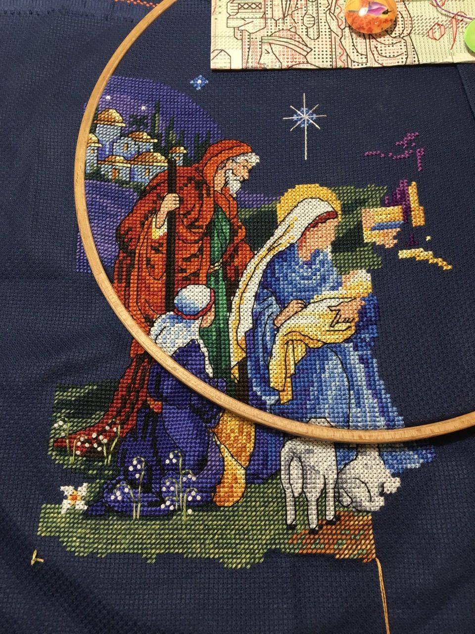 10 февраля 2019 Девочки, всем привет! Показываю продолжение Рождества: Хочу сказать, что схема проработана обалденно! Бэк изумительный! ( Я в восхищении! Королева в восхищении! (с). Храм на заднем плане с кипарисами и пальмой меня потряс - пока вышивала, не задумывалась, что получается: ясно только, что зеленым вышиваю деревья. Но когда отодвинула на расстояние вытянутой руки и увидела, как из нескольких разнесенных крестиков получилась пальма, была в восторге! Сразу накрутила фрузелки -получились ландыши. Наверное, это какие-то другие цветы, надо бы почитать, может, есть какие-то упоминания, но похожи на ландыши. В звезду над головой Марии добавила серебристый крейник, теперь она очень красиво поблескивает))). Маленькие звездочки буду делать бисером, но это больше от лени-крепить отдельно каждый фрузелок мне неохота, а тянуть нить под синей канвой -будут видны протяжки. Надпись решили оставить, в нее тоже добавлю золотого крейника. Процесс доставляет большое удовольствие и очень легко шьется. nogres, ОльгаВл, irina4221 и 34 других сказали спасибо Поделиться сообщением Ссылка на сообщение