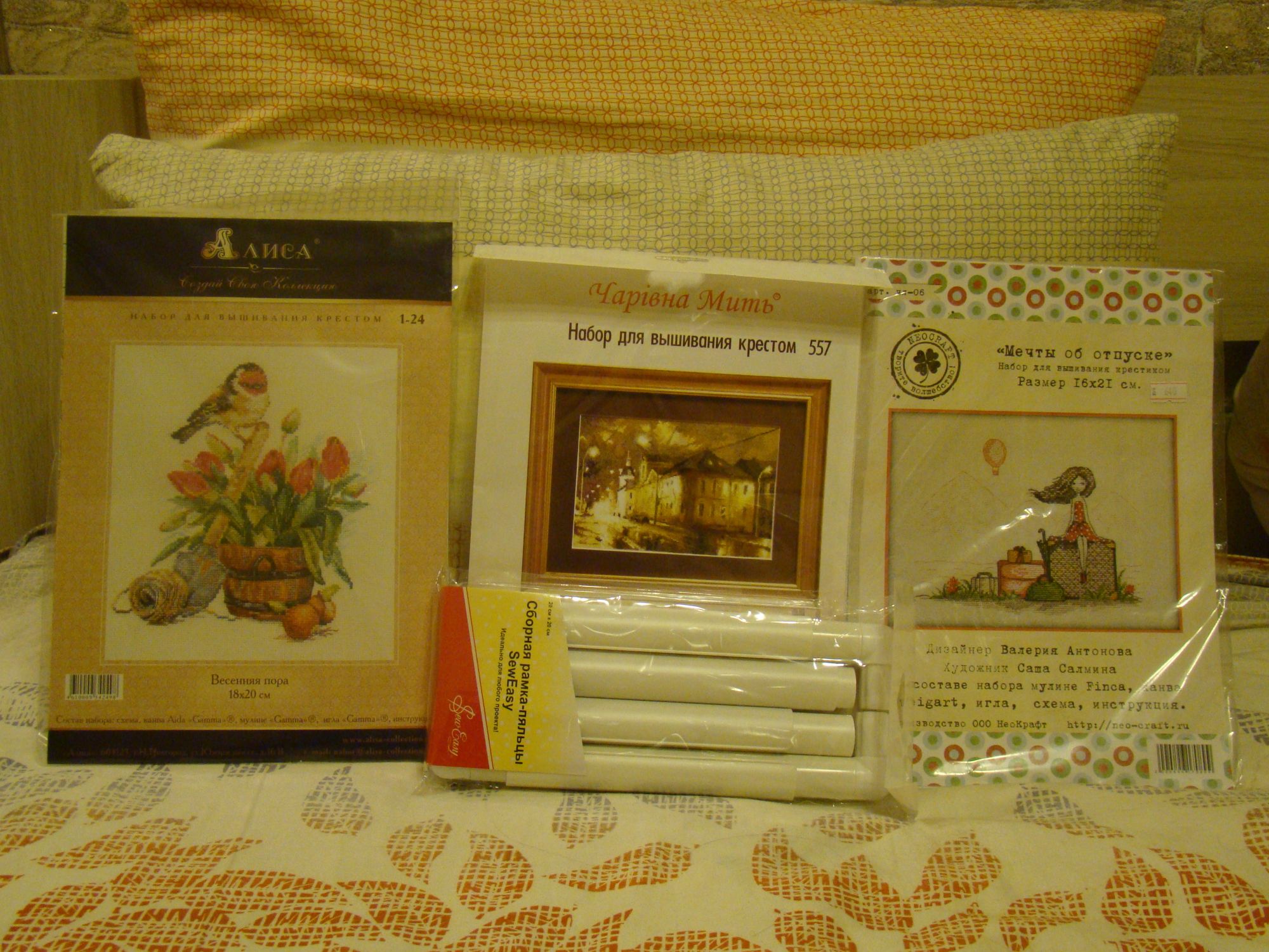 4 апреля 2016 Пока меня еще не выгнали за наглый взгляд и непочтительность треп не по теме притопала я показать чем обернулся для меня нервный срыв моего смирного и не злобливого Хомы :))) Сперва собственно уже показанная ранее и совсем неожиданная для меня новинка Алисы "Весенняя пора" захотелось мне ее внезапно, но до трясучки, видимо очень уж весны хочется.... Спасибо всем, кто помогал определиться в вопросе замены канвы В вопросе более-менее разобралась, теперь буду с тоской и надеждой ждать з/п.... Вот если бы ни это прискорбное обстоятельство, я бы его точно сегодня же расковыряла и начала Далее на меня напали мои давние-давние хочушки, вот этот вот "Ночной проспект" долго не давал мне покоя, еще дольше отсутствовал в продаже, но не давал себя забыть В моем сознании он стойко ассоциируется с поездкой в Казань и первой вечерней прогулкой в этом замечательном городе - у нас по дороге от гостиницы были очень похожие домики, и такой же рассеянный свет, и были мы там в сентябре, и пусть мне сколько угодно раз расскажут, что это не Казань, для меня он все равно останется иллюстрацией к той поездке фотографий той улицы целиком не нашла, но есть вот такой фрагмент и еще одна мечта идиота Хомяка сбылась "Мечты об отпуске" называется... Рассказывать чем она мне так запала в душу и почему так срочно захотелось именно сейчас, наверное, не стоит :))) Ее я расковыряла дрожащими руками еще в электричке, все пощупала, покрутила, рассмотрела, прочитала и испугалась, что я с ней кажется не справлюсь :((( и задумалась, что я все-таки боюсь равномерки... а вдруг я где-нибудь просчитаюсь??? С какой стороны к ней подходить я еще не решила.... Так и косимся друг на друга, с опаской и недоверием.... Ну и с чего все началось! С трагедии! Не, не так, началось все с ТРАГЕДИИ! Жизнь, а точнее мои любимые пяльцы, дали трещину! Попросту лопнули! Проверенные десятилетиями! Надежные, советские, школьные еще!!! Исполненный мной в этот момент вой раненного бизона посрамил бы и стадо этих мирных животных! Отгоревав положенный срок я обошла все два четыре магазина, которые у меня есть в доступе и не нашла ничего подходящего, потом оценив ваш опыт, которым вы так щедро делитесь, полезла в интернет-магазин на предмет изучения снапов :))) ну вот, теперь они у меня есть, мои первые снапики, как только куплю тряпочку для тюльпашек, так и опробую, кажу их на общем фото моего покупательного загула На этом наша передача "Для тех, кто не спит" заканчивает на сегодня свою трансляцию, диктор пойдет исполнять свой рукодельный долг и тренировать силу воли шить лошадь! Nata_Struchkowa, Июньская, Prutenok и 14 других сказали спасибо Поделиться сообщением Ссылка на сообщение