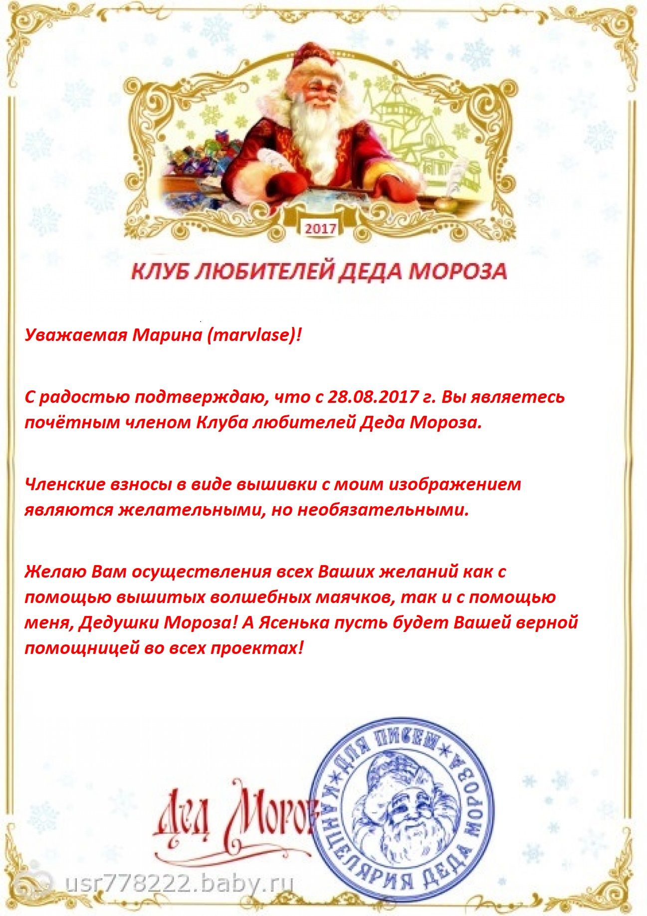 28 августа 2017 Марина, под звон бокалов с шампанским торжественно вручаю от имени Деда Мороза Свидетельство о членстве в Клубе любителей его имени! Урааа!!! agapenok, АлёNка, svenlanos и 8 других сказали спасибо Поделиться сообщением Ссылка на сообщение