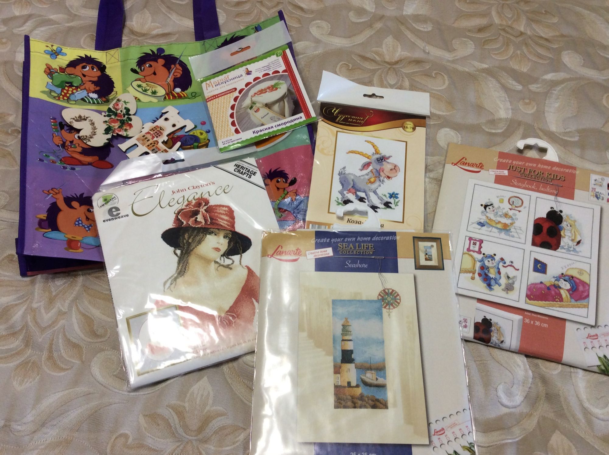 1 октября 2017 Всем привет!!! У меня сегодня совсем не вышивальный отчёт. Нет, я конечно вышивала, но совсем не много так что и особо показать то нечего. Немного продвинула Розы кто не видел вот они фото не для гаечки!!!!! Я их тут не показываю , так как они в совместнике шьются. Варежки новогодние совсем не много повыбивала, я их только при дневном свете могу вышивать, а с этим сами понимаете проблема, в будние дни это невозможно, а выходные чего то не очень получается днём посидеть. Но очень нравится процесс так красиво смотрятся яркие нитки на синей канве, постараюсь немного ещё вышить и вам показать более приличный кусок. Цветочки димовский миник я отложила пока ( будет у меня время вне дома их вышить). Ну в принципе о вышивальном все. Многие знают о моих злоключениях с уже готовыми работами, повторятся не буду все написала вот в этой теме Сейчас все погладила вроде все нормально. Маяк буду переделывать пока не очень отпарился он у меня, ну главное без пятен. Вот они мои страдальцы.. Стресс я получила капитальный. Из новостей я ездила как и многие на ФР. Фото не стала делать их Девочки много сделали и очень качественно. Мне конечно многое понравилось, да и вообще это конечно грандиозное событие для увлечённых людей! Такая хорошая атмосфера на этом празднике творчества, чего там только нет!!! Для себя я утвердилась в том что хочу Стеклянную фантазия от Овна, я ее очень хотела посмотреть в живую. Многим понравившиеся букеты от ССР ... на меня произвели впечителение масштабом, да очень красиво, но не мое, вернее я люблю цветы но их не хочу. Прогулка от Алисы раскритикованная тут, мне очень понравилась, очень хорошая проработка мелких деталей, что то есть в этой работе от Дим. Понравились замки от ЧМ на тонированной канве, тёплая осень и зимний пейзаж подобный от Риолис, йорка от РТО хотела купить но его там не продавали. Кстати сыну показала и он его раскритиковал и сказал нам такое не надо. Подумаю. В целом все очень и очень здорово!!! Я люблю такие мероприятия! Ну не обошлось конечно без покупок и подарочков. это общая кучка и знаменитые ежики на сумке, с которыми ходили все посетитель( ну подавляющее большинство) Вот таки миники в подарок от МИи ЧИ Этот набор куплен скорее из за компелектующих по смешной цене 400 руб , там равномерке только полметра на полметра, ну а сюжет имеет место быть в дальнейшем для следующее покаления . Такой маяк наверное есть у многих мне он нравился и тут я его купила тоже по распродаже. а nogres, yuss, АлёNка и 21 других сказали спасибо Поделиться сообщением Ссылка на сообщение