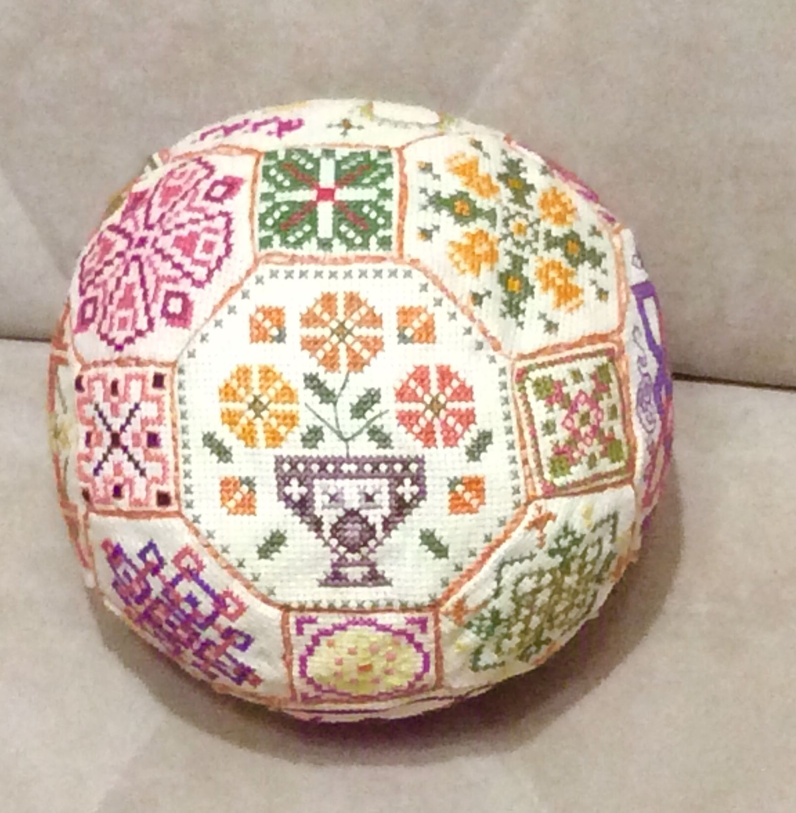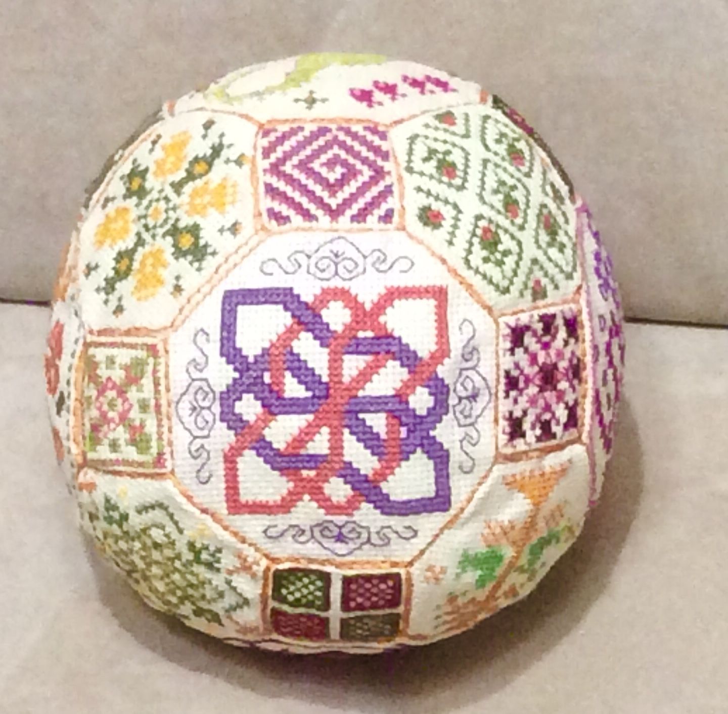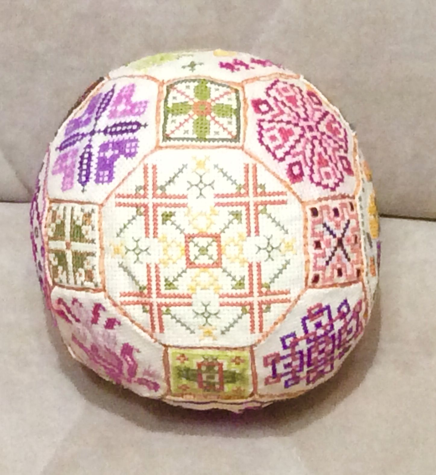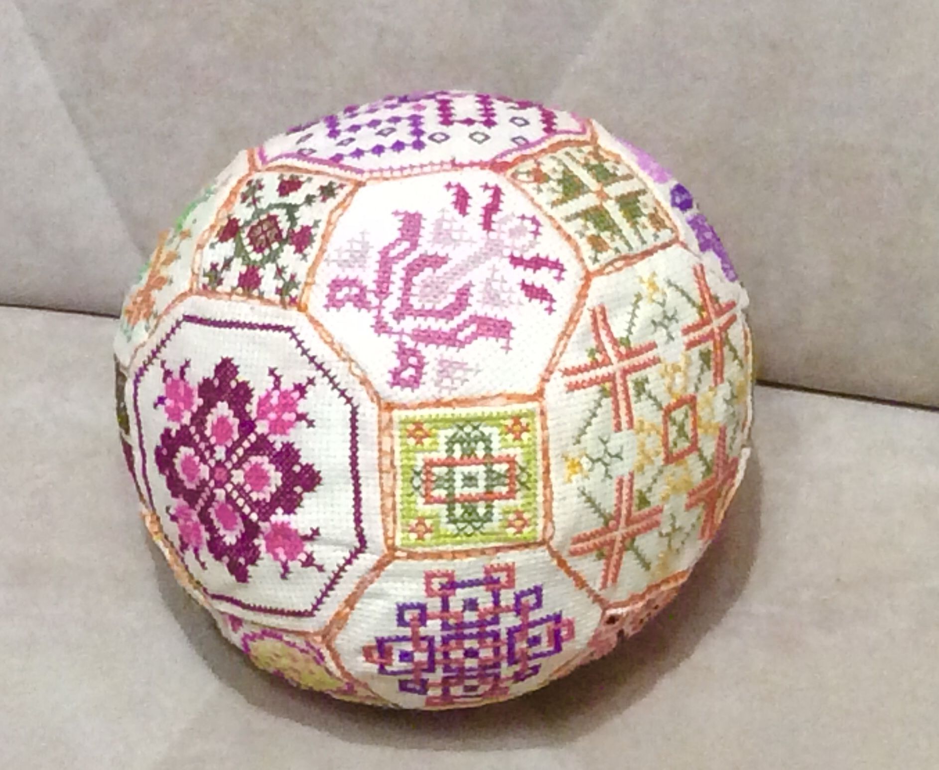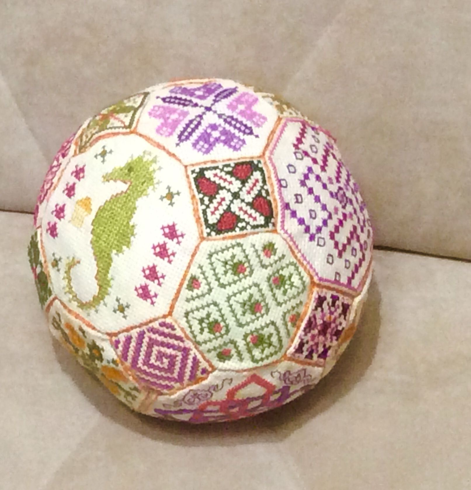 19 ноября 2017 9 часов назад, Raduga777 сказал: Уже "завтра" настало! Ну вот и я с обеденным показом. Но сразу скажу что снеговик не готов. Я не знаю на что все приклеивают пластиковую канву к фетру... у меня не приклеивается ничего. А ещё я жутко расстроена похоже игрушка испорчена... короче пока ничего не высохло после попытки очередного склеивания. Ну потом покажу если все получится. А сейчас я вам покажу первый и похоже последний в моей практике квакерский шар. Судьба у него не простая нужно сказать. Я его в принципе вышила пару лет назад и даже практически все сшила, оставалось только набить и зашить окончательно, но тут я начала ремонт и он благополучно был куда то запихан до лучших времён. Потом я про него вообще забыла и вот неделю назад я его нашла. Он подвергся стирке и в ообщемто очень пострадал. Канва там использовалась не самая лучшая и вышивался он из остатков старых кировских ниток. В процессе стирки канва начала разъезжаться и в итоге сегодня я его пыталась заново стянуть и не очень конечно все хорошо вышло. Но раз уж обещала то нужно показать. Не судите строго я знаю насколько он не совершенней, но он уже нашёл своего хозяина. Маленькая девочка дочка соседки сегодня не выпускала его из рук, а Яся жутко ревновала и пыталась его отнять и спрятать. Так что он ещё и пострадал в процессе всех их разборок. Raduga777, АлёNка, Ponochka и 9 других сказали спасибо Поделиться сообщением Ссылка на сообщение