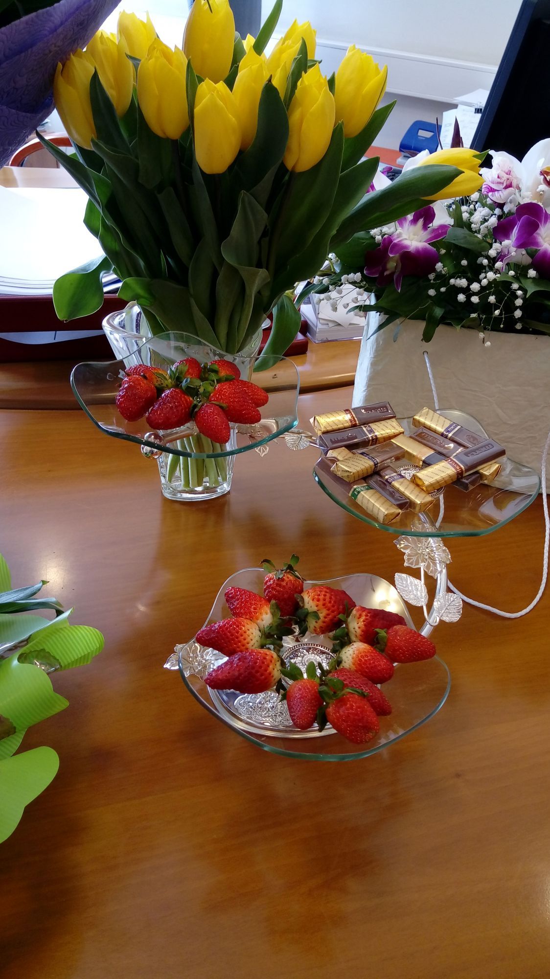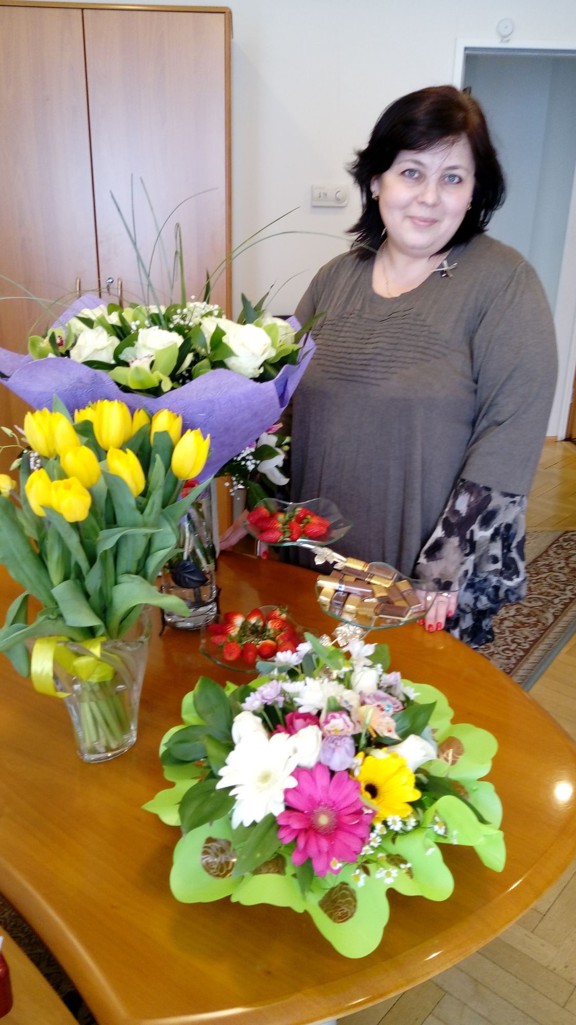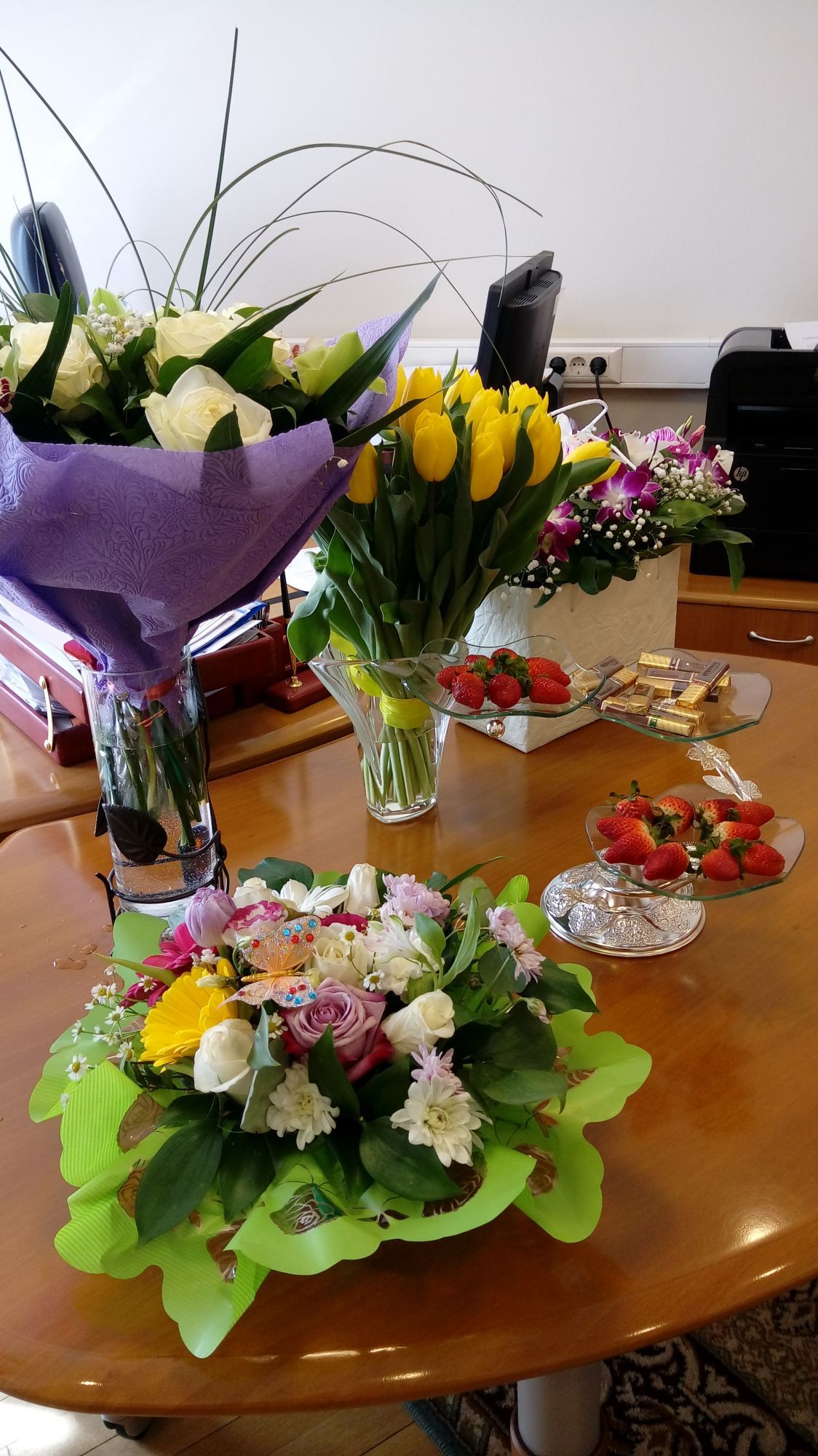 10 апреля 2018 41 минуту назад, marvlase сказал: Девочки, Елена, Вика, Маргарита, Лена, Ольга, Света, Наташа, Марина,Аня, Ольга Владимировна, Леночка, Людмила,Наташа, Татусечка- Татьяна,Ника, Александра, Алена, Ольга,Юля, Ольга ОГОРОМНОЕ СПАСИБО ЗА ПОЗДРАВЛЕНИЯ! Девочки, это так приятно утром зайти на форум и получить поздравления от вас! Вот вам угощение! Эту красоту мне смастерила коллега по работе! Вкусно! Сегдня было много поздравлений и на работе и от друзей и от родных и от вас! Сегодня солнечный и тёплый день! Пусть у нас все будет замечательно! И немного фото с работы! Коллега- Молодец! А какая клумба!!! Вот это поздравили! Коллеги такие внимательные! Но, уверена, что это все потому, что ты замечательный человек, дарящий тепло и излучающий свет! marvlase, АлёNка, ОльгаТольна и 1 другой сказали спасибо Поделиться сообщением Ссылка на сообщение