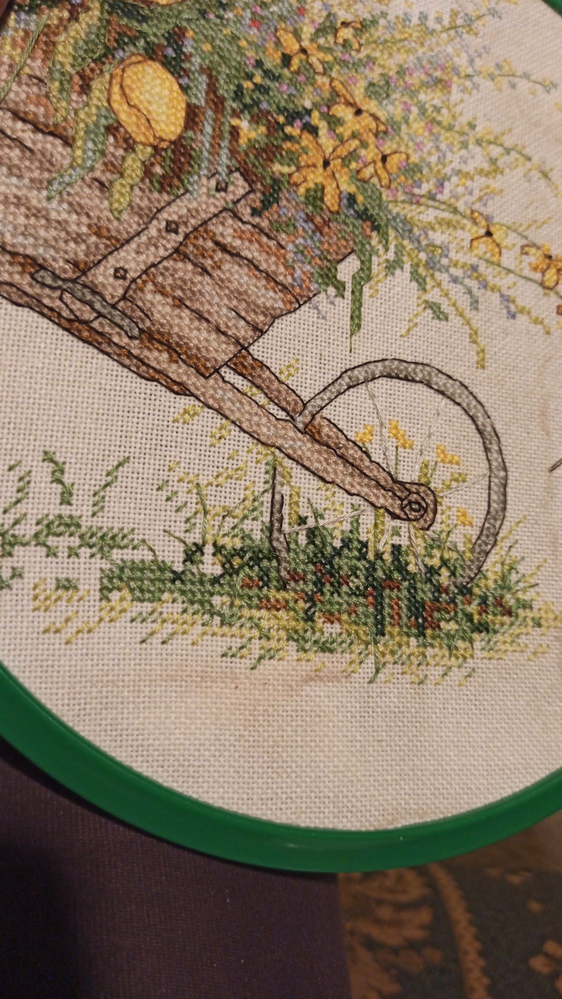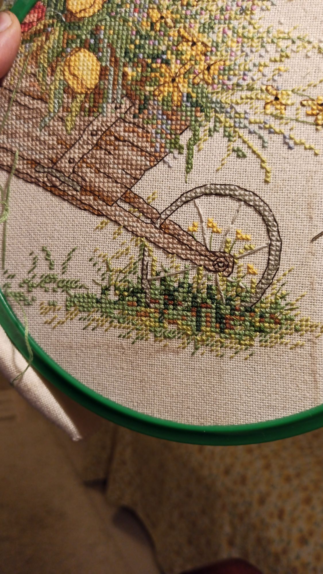 20 июля 2022 Девочки привет! Я-таки начала цветочницу с тележкой... ага, как и у девочек на лавочке, бесконечная смена нити, в карусельке такого не было... Bucilla 43783 Девочка с тележкой цветов Шью уже с начала мая, если не с апреля, а вышила только саму тележку... ) Правда летний дачный сезон, вышиваю маловато, но и сложнейше идёт, да ещё нет возможности штриховать, шью с экрана... Правда это не мешает мне получать от неё удовольствие и любить...и говорить доброму человеку спасибо! Тому, который не поленился сфоткать схему, и я теперь имею возможность вообще вышить этот редчайший набор, которого даже на ебее давно нету... Извиняюсь за дурацкие фотки, со мной бывает, за замызганную канву, у неё на даче не было других шансов...)) Цвета правильно передаёт первая фотка, которая при солнечном свете! Палитра абсолютно моя, естественные нежные цвета, не раздражает... Наверное поэтому не раздражает и сама работа, несмотря на всю сложность... Теперь буду переходить к колесу, чтобы побыстрее разобраться с травой... lefkorosida, OlyaKslv, Хозяйка смешных зверей и 22 других сказали спасибо Поделиться сообщением Ссылка на сообщение