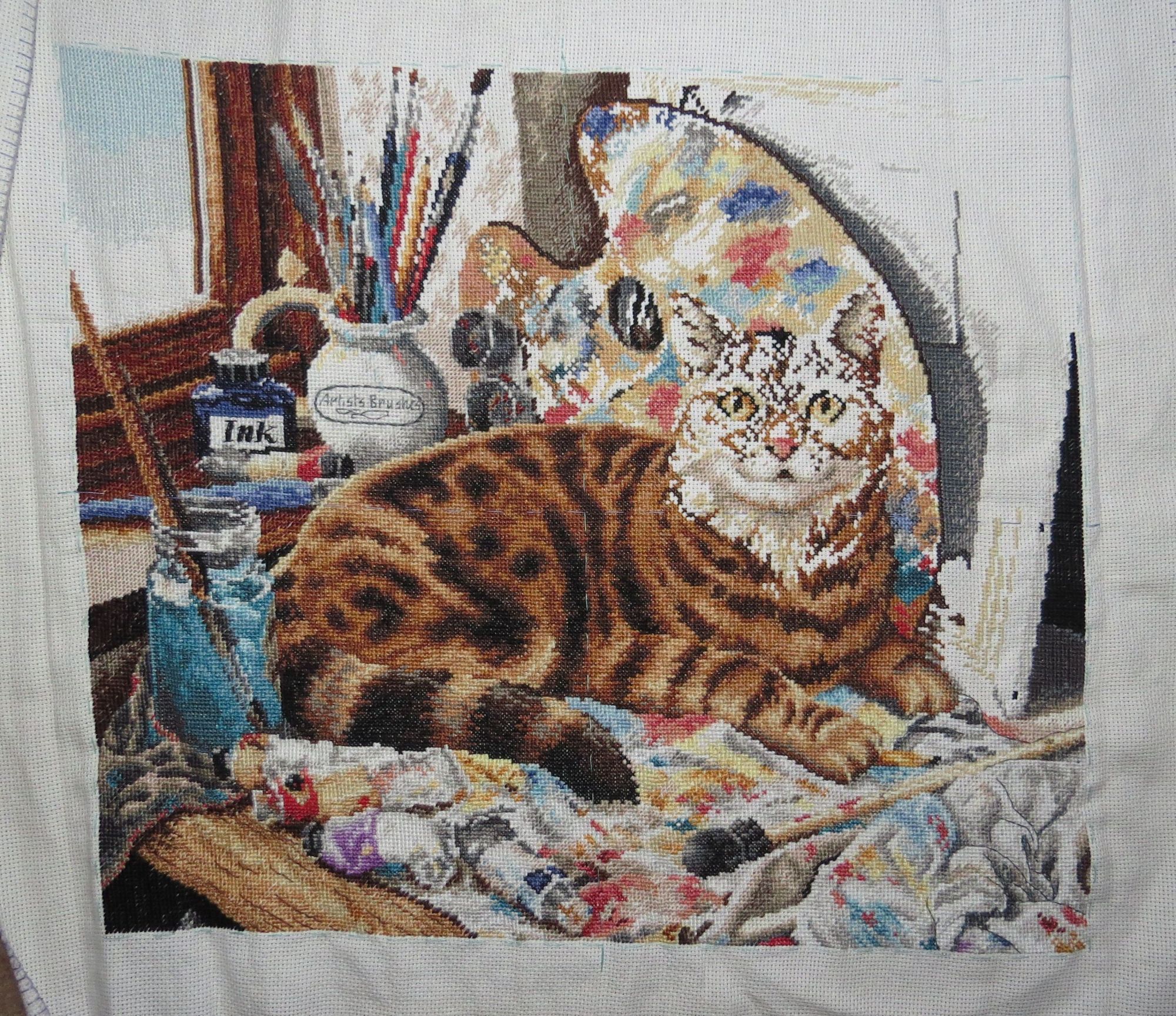 18 января 2018 Друзья, начну сегодня с новостей котизма. Мы наивно считали, что кот грызет только кактусы, и не прятали от него орхидеи. Оказалось, что мы ошибались. Виноватое лицо подозреваемого, застигнутого на месте преступления. Как было вкусно! Теперь два новых процесса. Первый начала несколько месяцев назад и забросила, достала оживить в районе нового года, чтобы уж если шить, то тематическое. Dimensions 08657 Playing with the Trimmings И новый процесс - монохромная отдыхалка (нужно было поправить нервы после леонардовой тряпки) Heart and Cats 3 Все, кто видит этого, надо признать, излишне антропоморфного котика, говорят, что это макака. Может, когда вышью усики, не так будут глумиться. Должно получиться вот такое (схема куплена на etsy) Когда достаю этот гобелен семейство сбегается посмотреть, до того необычно натуралистичная получается картинка готово два листа из восьми. Очень, конечно долго, но такое мелкое не получается помногу шить. И главная новость! Закончена последняя леонардова тряпка! Сколько крови она мне попила, сколько нервов вымотала Осталось лицо кота, мольберт, рамы, и конечно бэк, но после тряпки даже он меня не страшит. Муняша, Killwale, irisheckin и 34 других сказали спасибо Поделиться сообщением Ссылка на сообщение