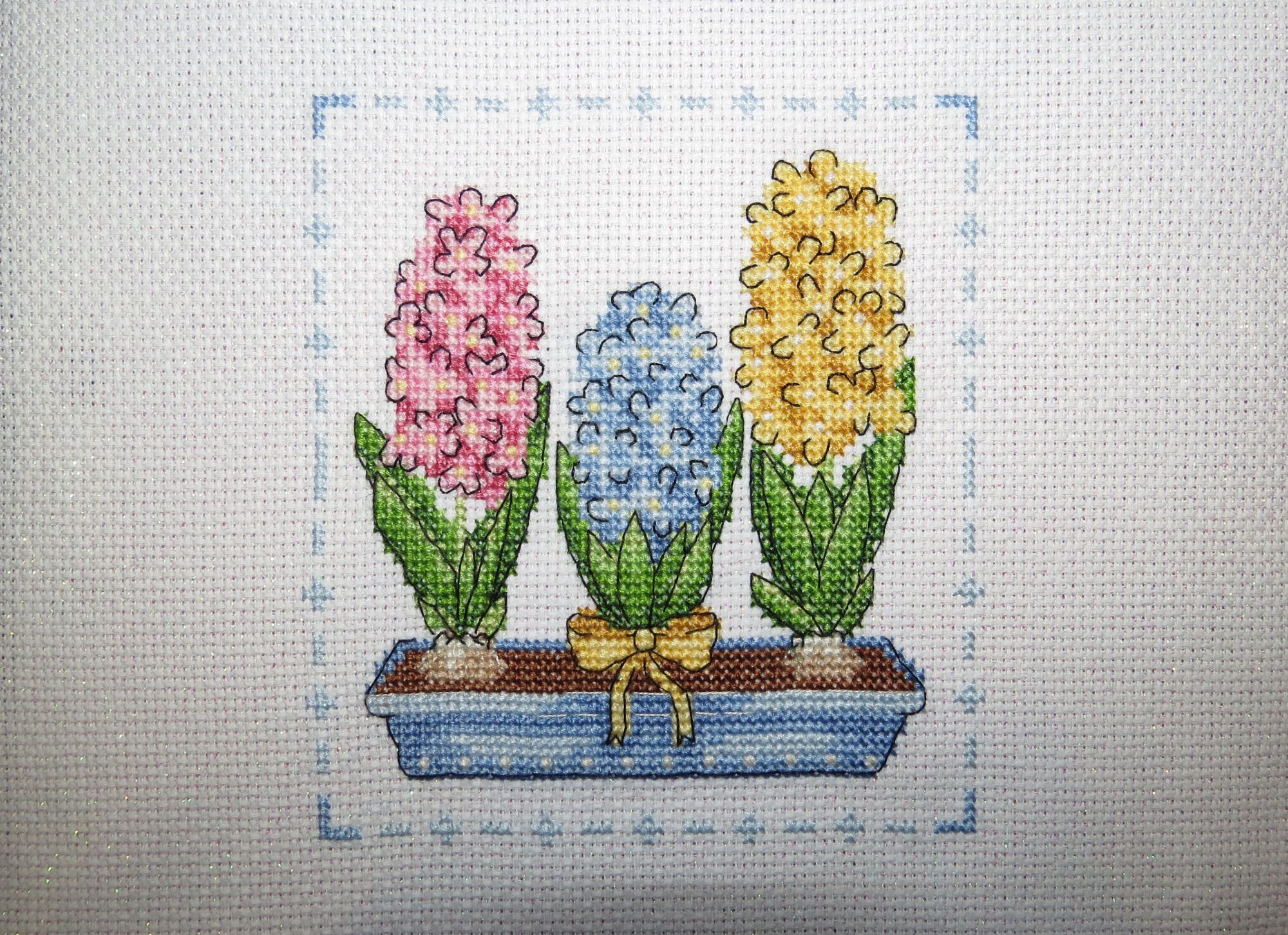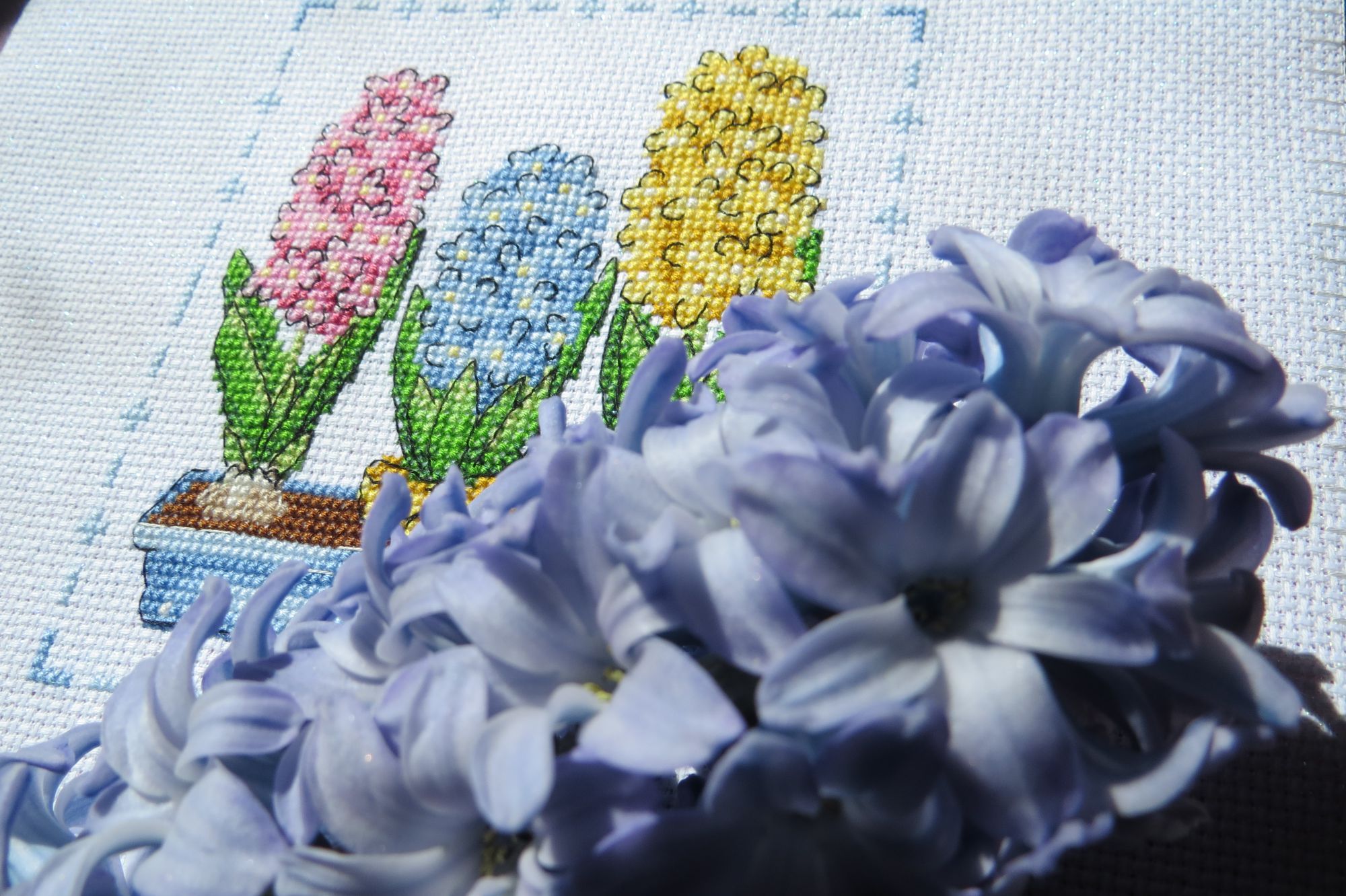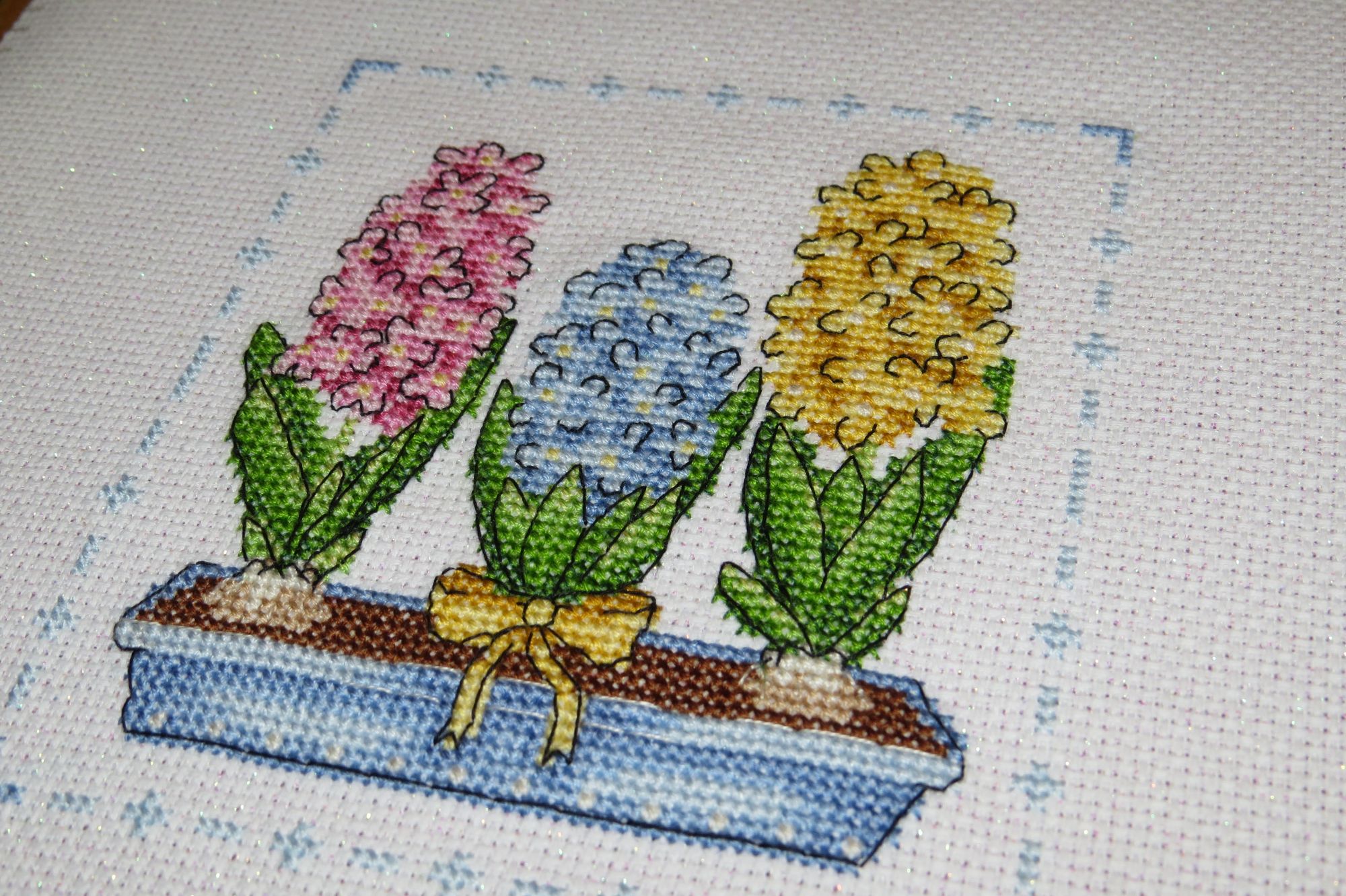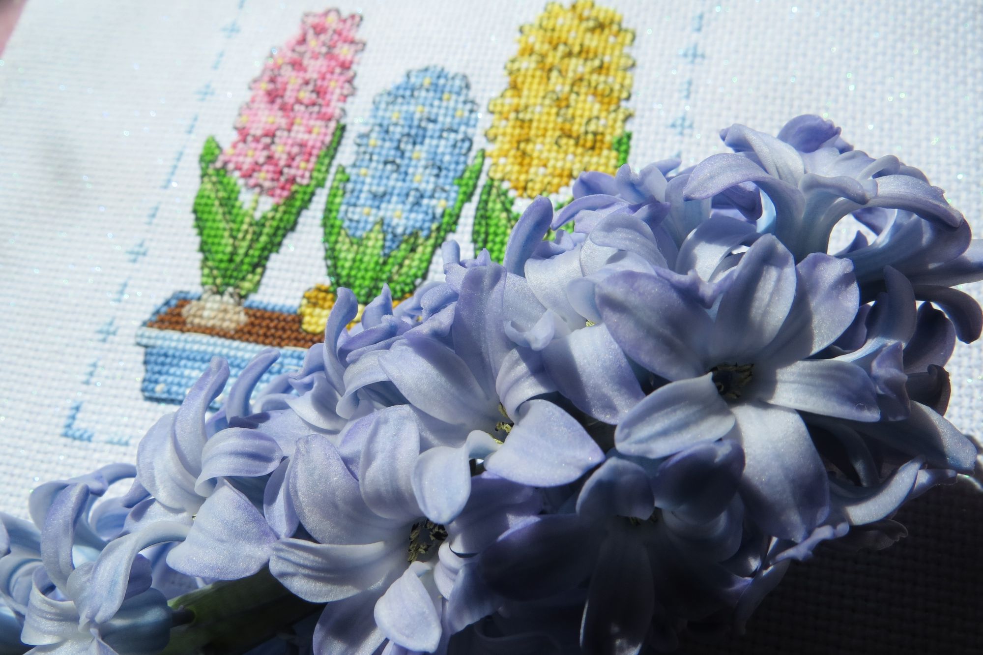 24 марта 2018 Даже не знаю с чего начать, столько всего накопилось. Пожалуй начнем с окончаний. Начала и уже закончила мини процесс. Схема без названия, или Гиацинты (бесплатная, вкладывали в заказы магазина 7 пететь в прошлом году). Несмотря на то, что куча незаконченных процессов отягощают совесть, так хотелось что-то сочное, яркое, весеннее. Можно сказать, что я призывала весну этим процессом. К сожалению, весна так и не пришла, зато пришла африканская буря Страшный день был вчера, небо закрыли желтые облака, все заволокло неестественным жутким желтым светом , и с неба шел ярко-желтый снег. Сама не фотографировала, перепугавшись бегала выясняла, что это за апокалипсис, мож хим атака, месть нам за отравленного в Лондоне шпиёна, тем более попала под этот снег и пришла домой в желтых пятнах и боялась, а было вот так ( Сочи той же ерундой накрыло). Оказалось к нам пришла песчаная буря из Сахары. Песок Сахары подхватило бурей принесло к нам, и это точно не то, что я ждала от весны, выйти из дома и обсыпаться желтым снегом вперемешку с африканским песком. Так родилась новая вышивальная примета - вышить гиацинты - к песчаной африканской буре. Канва с зеленым перламутровым блеском, на фото это ни фига не видно, разве что чуть, где под наклоном в расфокусе. Тадаммммм! Гвоздь программы - Леонардо и его тряпки. Козлячья выкладная еще и обвисла. баночка самая живописная Кисточки! Моя мучительница тряпка Этим глазам все прощу! Глава вторая. Продолжения процессов. новогодние котики Кошачье сердце Терезин дракончик Глава третья, окончательно разоблачающая качество китайских подделок. Может кто помнит мою эпопею с ужасного качества "аналогом" димовских раритетных котов? Она получила продолжение. Вполне логично было предположить, что тяпляпство конфигурации того аналога (нечитаемая ксерокопия схемы, нитки на мятой картонке подписанные от руки) не ограничивается только качеством комплектации, но затрагивает так же и качество подбора. Добрейшая Света @eutamias отдала мне остатки и схему от своего оригинала (и еще чудесные буклетики ) И теперь у меня есть возможность сравнить нитки из оригинала и то, что подобрали жители берегов желтой реки Хуанхэ. Некоторые хотя бы слегка смахивают на оригинал, хоть и плохо, но большинство и близко не похожи. Мне кажется так плохо подобрать можно только не видя ниток вообще. Подобрано по принципу общего сходства с цветом, без малейшей попытки попасть в тон, насыщенность и цветовой подтон. Смотрите сами, что мы покупаем у китайцев. Благодаря Светиным ниточкам, я смогу хоть часть набрать родными димоскими, остальные подберу на глаз, и будет точнно намного лучше, чем от китайских друзей. У кого как, а у меня теперь с китайцами дружба врозь. И на основании опыта, за который я еще и немало заплатила юаней рублей, снова советую не связываться с подделками, а стараться раздобыть остатки от набором и подбирать. Слишком много открытий возникает при сравнивании димовских ниток с китайским подбором. Глава четвертая - покупки, в основном, почему-то новогодней тематики. Очень красивые игрушки Design works, витражные. Витражи - моя тема У димовского котика не хочу вышивать гамак. Интересно, если без него, слишком дико будет выглядеть подушка висящая в воздухе? Карманный котик на водорастворимой канве, и пасхальное яйцо - вот интересно, если буквы не выш