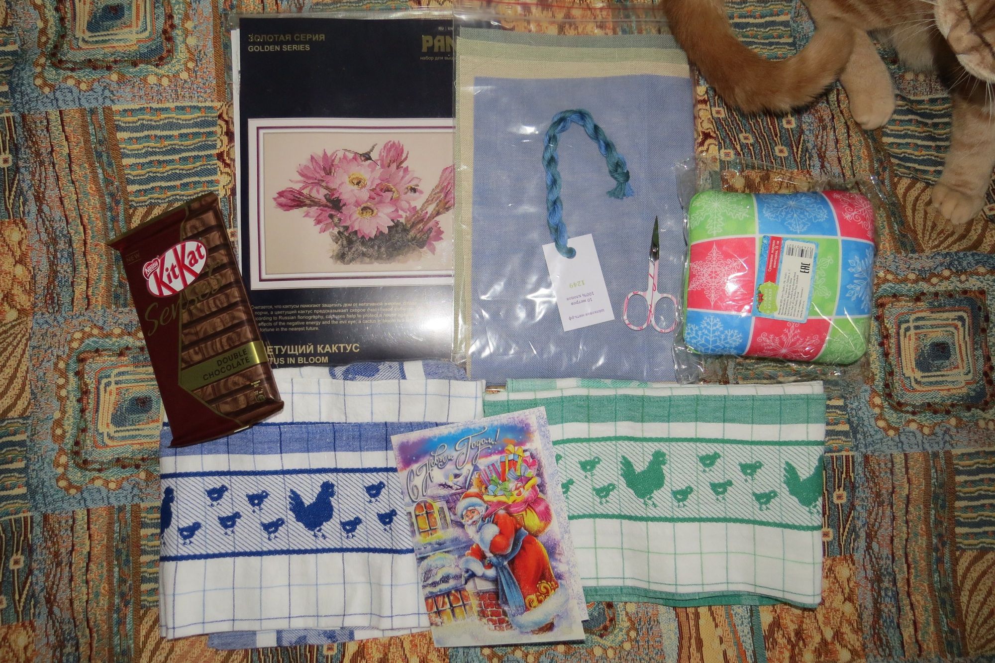 8 января 2019 Часть третья вышивальная. обновок никаких у меня не было - сейчас в режиме экономии, но снегурочка @irisheckin не дала мне пропасть! И это даже и не все, потому что часть растащили страждущие, некоторые вкусняшки не смогли дожить до фотографирования Целая гора сокровищ, и прекрасный кактус, который я сначала открыла посмотреть, а там такие красивые ниточки, развернула канву, а она уже оверложена. Оглянуться не успела, уже цветочек начат! Скоро будет новый процесс, спасибо, Ирочка Законченное - несчастная теина гортензия. Совершенно садистская схема, несколько раз путала цвета, приходилось распускать. Шьешь стрелочку повернутую влево, а потом смотришь, шьешь той же ниткой уже стрелочку вправо, и пару стрелочек вверх прихватываешь. красиво смотрится только издали, вблизи мешанина, еще и блеклая как изнанка из-за того что в одну нитку. Новый процесс! Satsuma street Cactus cat Все самое лучшее вместе, и кактусы и коты! Продвижение - димовский коврик. Три нитки и повторяющиеся фрагменты пьют мою кровь Killwale, ЛюдмилаЕр, apanjul и 22 других сказали спасибо Поделиться сообщением Ссылка на сообщение
