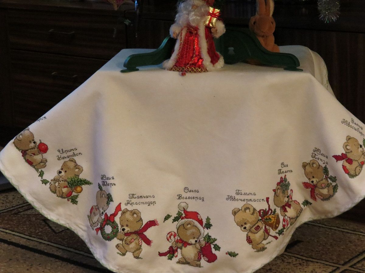 14 января 2018 Девочки, привет А я решила показать, как получилась наша с вами юбочка))) Фотки мутные, к сожалению, но лучше не получилось. И фото изнанки Канву проклеивала флизелином, снизу хлопок, а край обшит кружевом. Вот так незатейливо, но елочка очень нарядная. Раньше мы просто клали белую скатерть, а теперь такая красота)))) Ещё раз всем спасибо Vakuli-olga, Г@лина, Lakis и 5 других сказали спасибо Поделиться сообщением Ссылка на сообщение