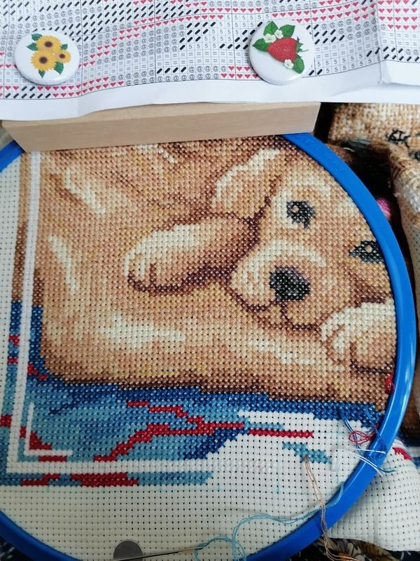 10 июля 2020 Часть вторая. Процессоначинательная. Ага-ага. Как ни странно, несмотря на обилие начатых процессов, случилось ещё два. Первый - это подушка от Риолис "Выше облаков" После панновских собак дочка стала просить "ещё подушечку". А т.к. эти мышки были уже у меня припасены, то, конечно, начала именно их. Процесс шерстяной, в жару идёт не очень. Зато до безобразия простой и позволяет таскать куда угодно. Дочка занимается, а я тем временем тык-тык на скорую руку. Растянется надолго, конечно, но капля и камень точит, поэтому хоть по чуть-чуть, но двигаем. Заодно проходят испытания пластиковые квадратные Нурге. Пока очень довольна. Не надо с уголками возиться. Ну и второй процесс стал большим удивлением для меня самой. А всё началось с кактусов Иры @АриЯ В списке желаний у меня давно был аналогичный набор с фиалками. И как истинный фиалковод я очень бы хотела иметь такой сюжет вышитым у себя на стене. А тут ещё наткнулась на вышивальном ютубе на ролик не помню кого с рассказом об аналогичном процессе "Дары осени". Т.е. из этой же серии полок. Решение купить окончательно было укреплено совершенно безсовестной скидкой в Рукоделове. В итоге этот набор мне обошёлся почти на 800 рублей дешевле его средней стоимости. Когда получила посылку и увидела нитки, потеряла дар речи окончательно. Тут же набор был вскрыт, запихнут в прямоугольные Нурге №4 и начат. Неудобно, конечно, такую большую работу на пяльцах шить, но там размер канвы почти 70 см, а такой рамы у меня нет. Повторять свою ошибку с "Гимном любви", когда я начала шить работу не вдоль, а поперек, больше нехочу. Поэтому пяльца. Сейчас вышито уже гораздо больше. Процесс непростой, но весьма интересный. Millanka, Catopuma, Leutnant Ripley и 19 других сказали спасибо Поделиться сообщением Ссылка на сообщение