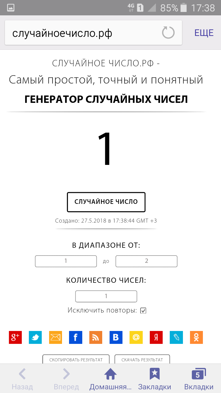 28 мая 2018 10 часов назад, АриЯ сказал: Всем привет! Уже вечерок!!! На работе творится незнамо что. Ничего не понятно. Суета и круговерть. Так что, пока могу разыграю. Потом, боюсь времени не будет. Отправлю в ближайшие выходные. татьяна0674, - 1 Nata_Struchkowa, -2 В связи с моим недоверием к рандомным розыгрышам, я решила сгенерировать число на разных сайтайтах и будет три попытки - вот что вышло: со мной такое второй раз - чистая победа! !!! Таня, поздравляю и жду арес в личку Ирочка спасибо большое, я очень рада Мне очень редко везёт в выигрышах. Буду ждать с нетерпением. Хозяйка смешных зверей, apanjul, Agusia и 7 других сказали спасибо Поделиться сообщением Ссылка на сообщение