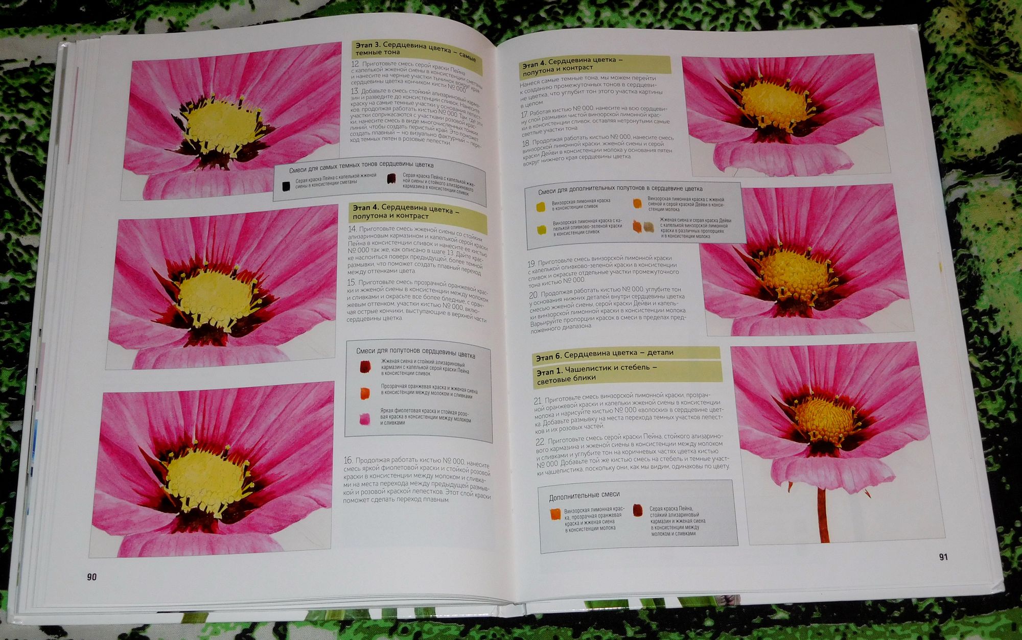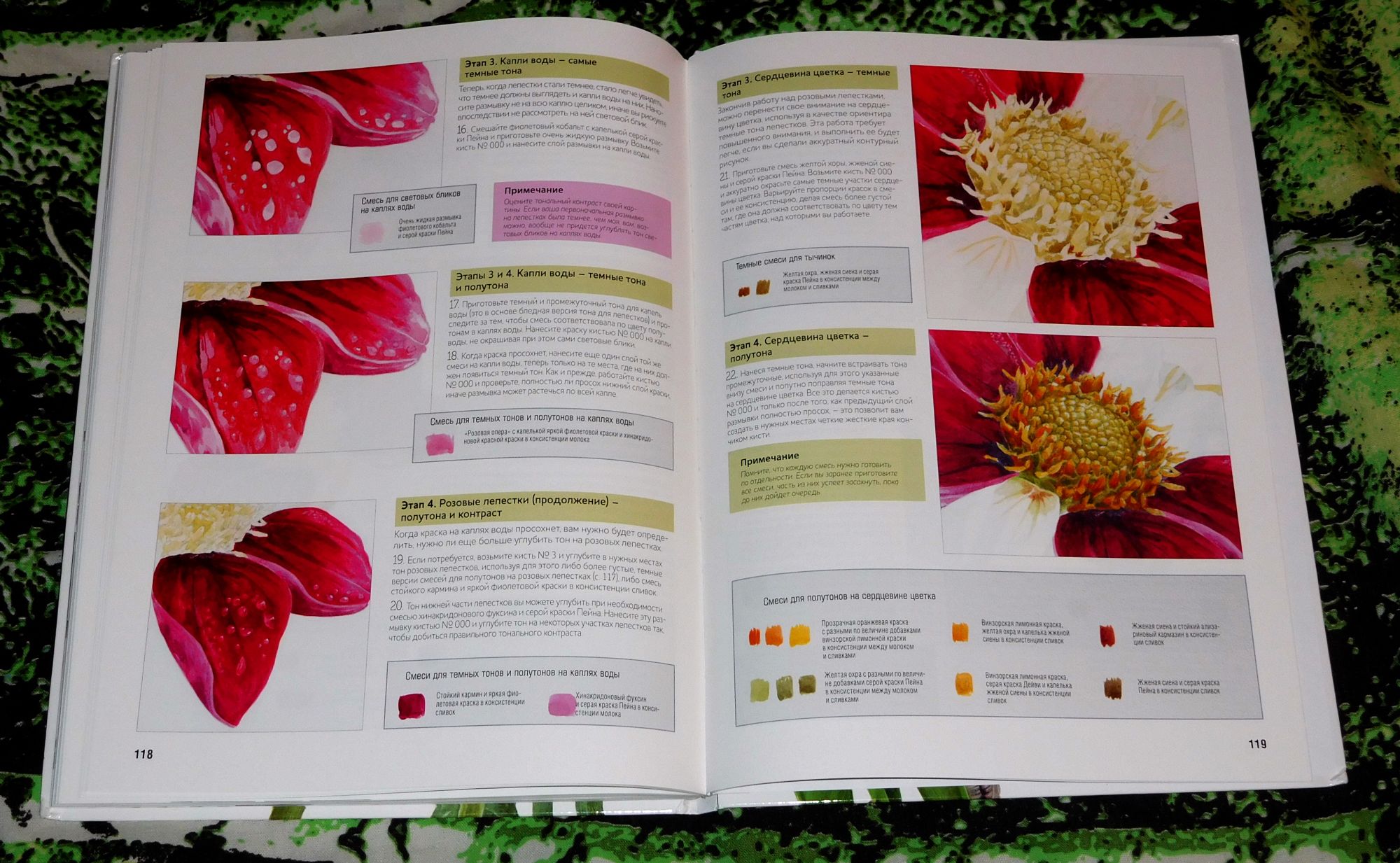 2 июля 2018 Ура!!! Готов второй бутон!!! Вот он получился ооочень нежный. Покажу ветку Фейхоа, которая зацепилась за канву и купилась Какая-то мешанина соцветий, но мне так нравится!!! Видела в лавке для художников картину - абстракция. Мне пытались объяснить что изображено, что хотел показать автор - чего-то почти глобальное. Но я упорно видела цветущий луг и феечек, которые летали возле бутонов. Короче - неправильный у меня взгляд на вещи... это я к тому, что ветка чем-то похожа на ту абстракцию. Пусть отдаленно, но похожа. и книга Вот куда она мне!? Зачем!? Но такие цветы классные, тоже хочу так. С раскрасками по номерам не сложилось, тут тоже вряд ли, но так классно. Вот несколько страниц.Показан поэтапный процесс рисования. Даже не верится, что это обычная акварель, которую мы знаем с детского сада. Рассказывается: о цвете, как подобрать нужный оттенок; какие инструменты необходимо иметь; Как сочетаются цвета ( вот тут я ничего не поняла толком)))); с чего и как надо начинать. Один минус - все в общих чертах и лишь немного углубляясь. Если решусь попробовать - обязательно покажу результат. Вот и все!!! Всем спасибо за минуту внимания!!!! Каори, курочка, tessykat и 31 других сказали спасибо Поделиться сообщением Ссылка на сообщение