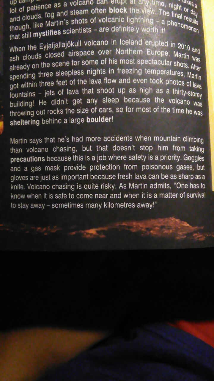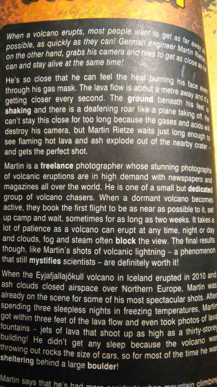 15 сентября 2017 Натусик, спасибо!) Мы с сестрой стараемся))) Я уже свой долг выполнила, а она пока не собирается останавливаться на достигнутом))) Девочки! Не могу не поделиться - наконец-то у ребенка стал интересный английский) папа с утра говорит - мама, а почему бы тебе не проверить у ребенка английский, за который он хвастается, что хорошую оценку получил. Дело происходило утром, нам уже пора было выезжать. Говорю - перешли мне по вотсапу. На работе добралась до компа и не отвисла, пока до конца не дочитала. А потом посчитала, что этот кусочек текста достоин, чтобы им поделиться) пришлось юзать прогу для распознавания текста и запихивать в переводчик, чтобы не набирать с листа. Вот что было: а это текст, кому тяжело читать на черном и перевод (с гугла, но сглаженный и относительно художественный) When the volcano erupts, most people want to get as far as possible, as quickly as they can! German engineer Martin Rietze, on the other hand, grabs his camera and tries to get as close as he can and stay alive at the same time! He’s so close that he can feel the heat burning his face even through his gas mask. The lava flow is about a metre away and it’s getting closer every second. The ground beneath his feet is shaking and there is a deafening roar like a plane is taking off. He can’t stay this close for too long becaust the gases and acids will destroy his camera, but Martin Rietze waits just long enough to see flaming hot lava and ash explode out of the nearby crater – and gets the perfect shot. Martin is a freelancer photographer whose stunning photographs of volcanic eruptions are in high demand with newspapers and magazines all over the world. He is one of a small but dedicated group of volcano chasers. When a dormant volcano becomes active, they book the first flight to be as near as possible to it, set up camp and wait, sometimes for as long as two weeks. It takes a lot of patience as a volcano can erupt at any time, night or day and clouds, fog and steam often block the view. The final results though, like Martin’s shots of volcanic lightning – a phenomenon that still mystifies scientists – are definitely worth it! When the Eyjafjallajokull volcano in Iceland erupted in 2010 and ash clouds closed airspace over Northern Europe, Martin was already on the scene for some of his most spectacular shots. After spending three sleepless nights in freezing temperatures, Martin got within three feet of the lava flow and even took photos of lava fountains - jets of lava that shoot up as high as a thirty-storey building! He didn't get any sleep because the volcano was throwing out rocks the size of cars, so for most of the time he was sheltering behind a large boulder! Martin says that he's had more accidents when mountain climbing than volcano chasing, but that doesn't stop him from taking precautions because this is a job where safety is a priority. Goggles and a gas mask provide protection from poisonous gases, but gloves are just as important because fresh lava can be as sharp as a knife. Volcano chasing is quite risky. As Martin admits, "One has to know when it is safe to come near and when it is a matter of survival to stay away - sometimes many kilometres away!" Когда вулкан вспыхивает, большинство людей хотят быть как можно дальше и как можно быстрее! Немецкий инженер Мартин Ритце, с другой стороны, хватает свою камеру и пытается быть как можно ближе и остаться в живых! Он настолько близко, что чувствует, как жар обжигает его лицо даже через его противогаз. Поток лавы находится примерно в метре, и он становится все ближе. Земля под ногами трясется, раздается и оглушительный рев, как будто взлетает самолет. Он не может долго оставаться в этом, потому что газы и кислоты разрушат его камеру, но Мартин Риетзе ждет достаточно долго, чтобы увидеть пылающую горячую лаву и золу, которые взорвались из соседнего кратера - и получает идеальный снимок. Мартин - фотограф-фрилансер, чьи потрясающие фотографии извержений вулканов пользуются большим спросом в газетах и журналах по всему миру. Он является одной из небольшой, но преданной группы вулканических охотников. Когда спящий вулкан становится активным, они заказывают первый полет как можно ближе к нему, разбивают лагерь и ждут, иногда до двух недель. Требуется много терпения, поскольку вулкан может вспыхнуть в любое время, ночью или днем, а облака, туман и пар час