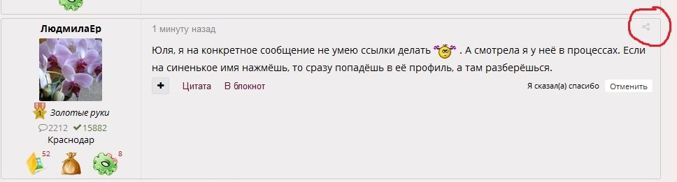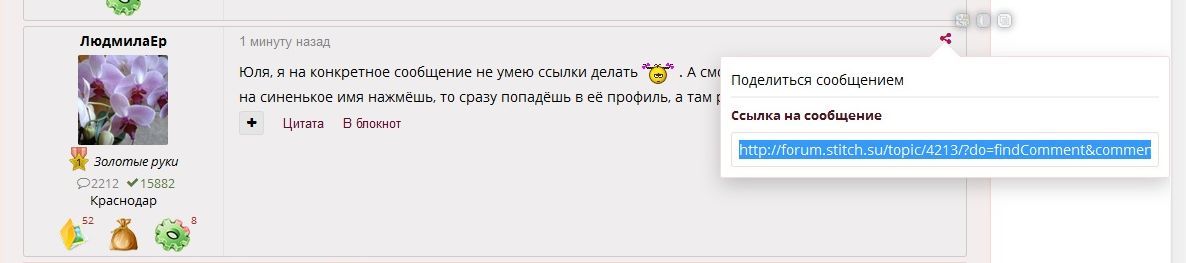 12 ноября 2016 4 минуты назад, apanjul сказал: Смотри, сверху у каждго сообщения есть такая рогулька На нее нажимаешь, и появляется ссылка, ее копируешь и вставляешь в свое сообщение. Все! Хорошо, когда умные люди подсказывают. Спасибо ! Проверка Сработало! оленек, Prutenok, Mara_ и 9 других сказали спасибо Поделиться сообщением Ссылка на сообщение