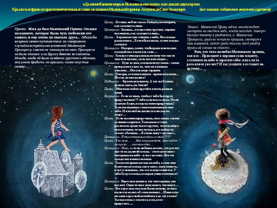 20 июня 2017 Ну и для тех, кто дочитает до конца: Вот так выглядит моя парочка рядом. и моя "Вышивальная сказка для взрослых" «Далекие близкие миры» Вышивальная сказка для взрослых или диалог двух картин Крылатые фразы и просто замечательные слова из сказки «Маленький принц» Антуана де Сент-Экзюпери (все лишние добавления выделены курсивом) Пролог: Жил да был Маленький Принц. Он жил на планете, которая была чуть побольше его самого, и ему очень не хватало друга... Однажды во время своего путешествия он совершенно случайно встретил во вселенной Маленькую Принцессу, совсем не похожую на него. Принцесса не была похожа и на других девочек ее планеты. Иногда, когда ей было особенно грустно и одиноко, она умела бродить по крышам, низко опустив голову…. Принц - Я очень люблю закат. Пойдем, посмотрим, как заходит солнце. Принцесса - Знаешь... когда очень грустно, хорошо поглядеть, как заходит солнце... Принц - Хорошо ночью глядеть в небо. Все звезды расцветают…Хотел бы я знать, зачем звезды светятся Принцесса - Наверно, затем, чтобы рано или поздно каждый мог отыскать свою… Принц - Звезды очень красивые, потому что где-то там есть цветок, хоть его и не видно... Принцесса - Будь то дом, звезды или пустыня - самое прекрасное в них то, чего не увидишь глазами… Искать надо сердцем. Принц - Смотри, вот моя планета - прямо над нами... Но как до нее далеко! Принцесса - Красивая планета. А что ты будешь делать здесь, на Земле? Принц - Мне надо найти друзей и узнать разные вещи Принцесса - Если хочешь, чтобы у тебя был друг, приручи меня! У тебя золотые волосы. И как чудесно будет, когда ты меня приручишь! Золотая пшеница станет напоминать мне тебя. И я полюблю шелест колосьев на ветру… Принц - Если ты меня приручишь, моя жизнь словно солнцем озарится. Твои шаги я стану различать среди тысяч других, твоя походка позовет меня, точно музыка, и я выйду из своего убежища… Я узнаю цену счастью!... Принцесса - И ты останешься здесь со мной???? Принц - Я не могу…….. Мне пора улетать, меня ждет моя роза….. она там одна…. Принцесса - Жаль, но если любишь цветок, что растет где-то на далекой звезде, - этого довольно: смотришь на небо - и ты счастлив. Все это загадочно и непостижимо. Принц - Ты посмотришь ночью на небо, а ведь там будет такая звезда, где я живу, где я смеюсь, - и ты услышишь, что все звезды смеются. У тебя будут звезды, которые умеют смеяться! … Принцесса - Взрослые думают, что там хорошо, где нас нет. Одни только дети знают, что ищут… Принц - Все взрослые сначала были детьми, только мало кто из них об этом помнит… И никогда ни один взрослый не поймет, как это важно! Ты навсегда в ответе за всех, кого приручил….. Эпилог: Маленький Принц сейчас иногда любит смотреть на звездное небо, всегда находит далекую близкую планету и улыбается, а Маленькая Принцесса, гуляя по ночам по крышам, смотрит в даль вселенной, видит среди тысячи звезд улыбку друга и ей совсем не одиноко……. Вам, кто тоже полюбил Маленького принца, как и я: - Приведите в порядок свою планету, взгляните на небо и спросите себя: жива ли та роза или ее уже нет? И вы увидите: все станет по-другому... irisheckin, CherepOlka, Цыпа и 33 других сказали спасибо Поделиться сообщением Ссылка на сообщение