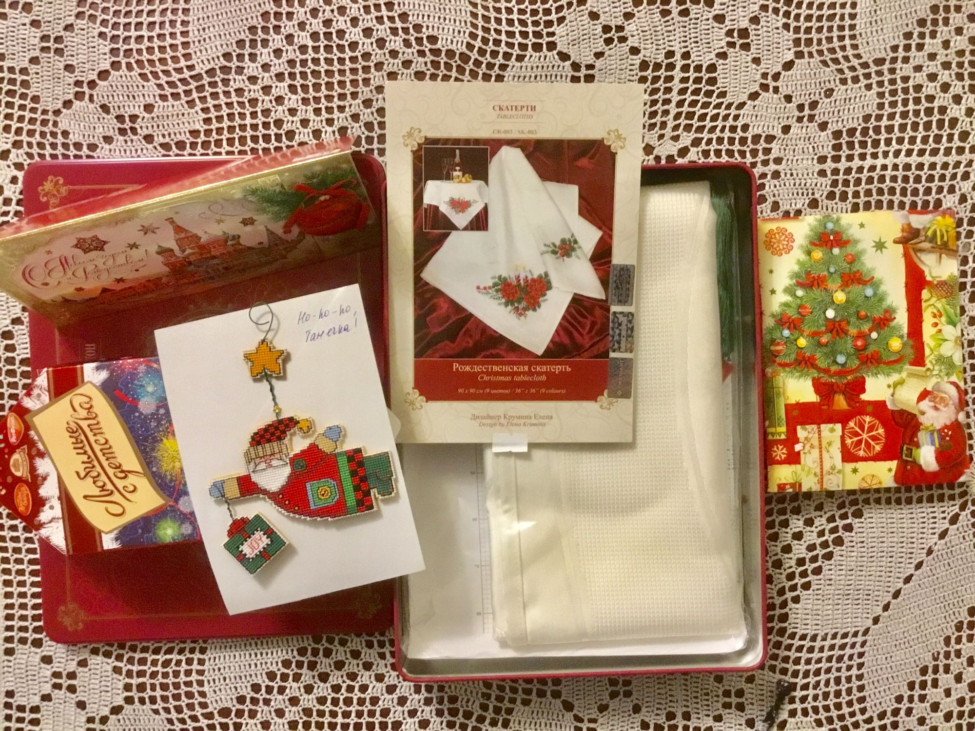 19 декабря 2018 Всем привет. А у меня уже начинаются праздники!!! Сегодня на меня волшебным образом снегопадом обрушился сюрприз подарков от Снегурочки по имени Ника!!!! И как только она уговорила Деда Мороза доставить мне огромную коробку новогодних подарков!!! Дорогие мои, это нечто такое, что в первые минуты я онемела от впечатления, когда открыла коробку. Смотрите какой изысканный сюрприз я получила в красных тонах металлическая коробка с надписью " подарочная коллекция" Золотое руно, открытка с самыми лучшими пожеланиями, конфеты с названием " Любимые с детства" и ещё волшебный конвертик. Начала я все это открывать , пританцовывать и охать от увиденного Какой Санта!!!! Я никогда в руках эти игрушки не держала, только в ваших темах читала и любовалась. А тут я просто обалдела от качества этой игрушки и поняла, что я пропала. Как же она будет украшать мою ёлку!!! Открыла коробку, а там опять сюрприз в виде готовой красивейшей скатерти, на которой ещё вышивается рождественский цветок. Ну не прелесть ли этот набор!!!? Снегурочка Ника, огромное спасибо тебе за все все все!! Настоящее новогоднее чудо!!! А ещё по секрету скажу, что ещё одна Снегурочка по имени Оля оплатила и прислала мне в подарок одну схему, которая мне понравилась на нашем годовом конкурсе работ ко Дню вышивальщицы. Схемы показывать у нас не принято, но нитки я уже заказала и когда вышью или хотя бы начну вышивать, тогда и покажу сюжет. Как же приятно внимание и сюрпризы всех феечек и Снегурочек. Я верю в то , что добро всегда возвращается и желаю вам всем исполнения всех желаний , верьте в чудеса, мечтайте и тогда жизнь засияет всеми красками радуги и огоньками на новогодней ёлке. Всем хорошего настроения и приятных сюрпризов под ёлочку от фей, снегурочек, дедов морозов и близких любимых людей. nogres, Цыпа, Mizeri и 31 других сказали спасибо Поделиться сообщением Ссылка на сообщение