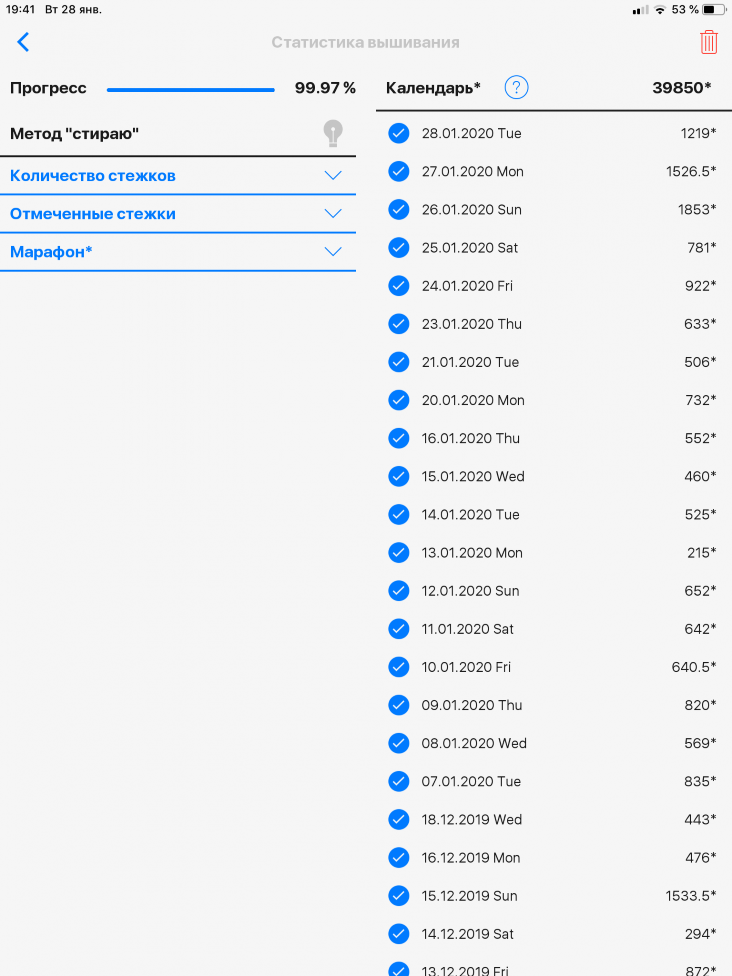 13 февраля 2020 1 час назад, olnikva сказал(а): быстро Оля, я её запланировала именно к 13 февраля вышить. В конце не успевала и пару дней просто как ненормальная спешила . Для примера последние дни вышивки по количеству стежков в день фото зато потом неделю иголку в руки не брала..... и с оформлением повезло.... оказалась одна планка в наличии на складе и не надо было ждать доставку... olnikva, irisheckin, apanjul и 3 других сказали спасибо Поделиться сообщением Ссылка на сообщение