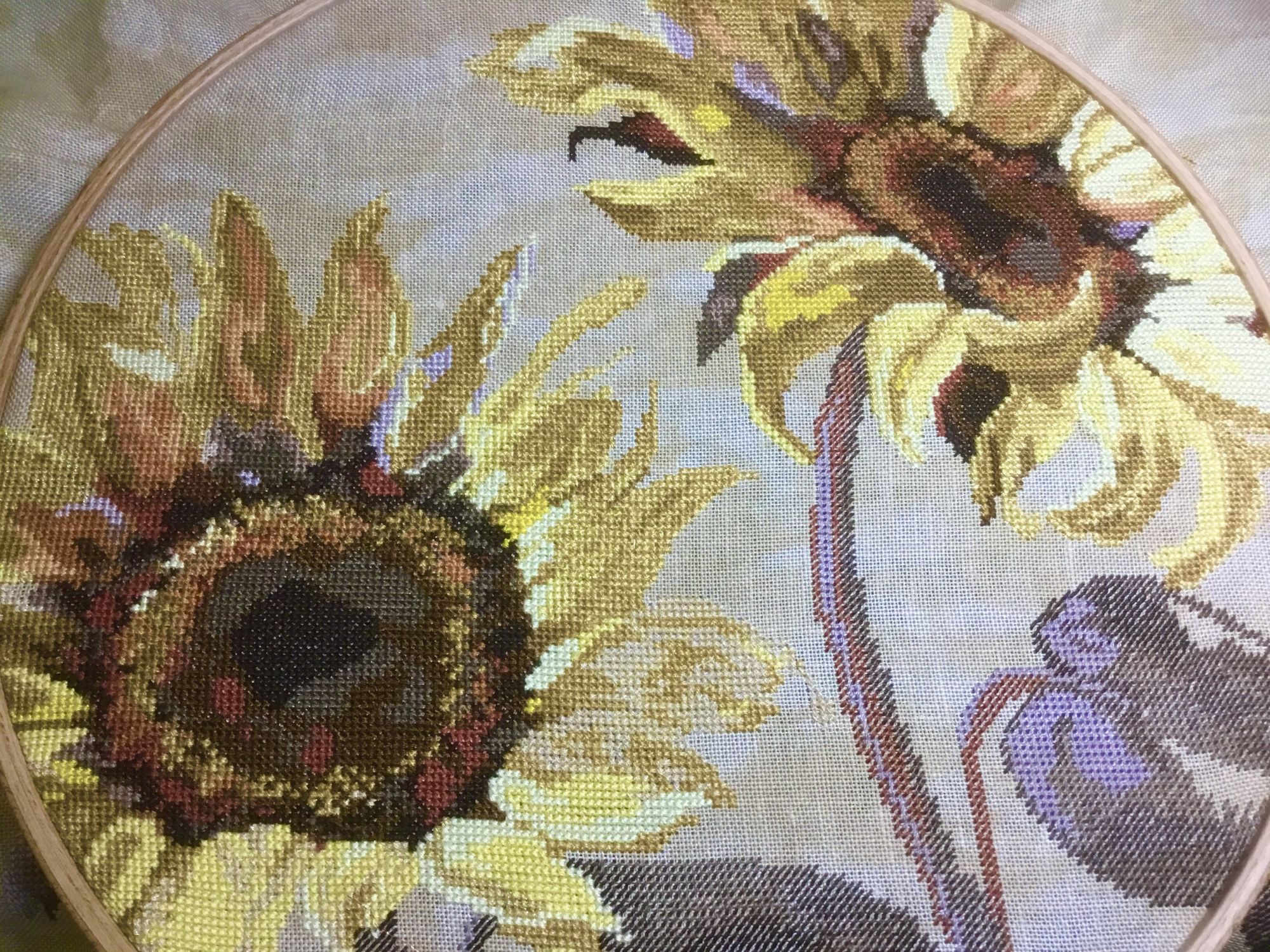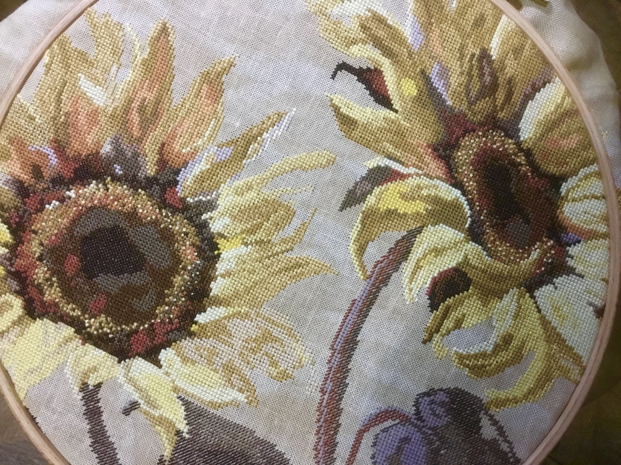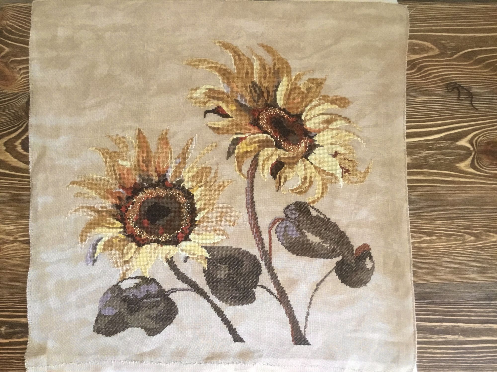1 марта 2020 Всем привет! С первым днём весны , солнышка, тепла и улыбок !!! Решила я показать сегодня свой Новый процесс. Он хоть и не весенний, но мне от него солнечно, потому что это цветок солнца.... Открываем и зеленим новую гаечку !!!! Anchor MAIA 5678000-01108 Coco Brazille II Подбор. Размер 230*230 клеток. Вышивка получилась 41*41 см. Канва кашель винтаж коричневый 50*50 см. Схема «родная» копия с оригинала. Нитки по ключу Анхор за исключением одного цвета. В ключе было указано metallic Perl. В инете нашла фото этого загадочного для меня цвета, но у нас не нашла. Попробовала заменить на металлик белого цвета ДМС. Кусочек вышила, но что- то не легло ...... в итоге заменила по наитию на ДМС светло-золотистого... он используется в бленде и в реальности на солнышке подсолнух светится очень солнечно. Как обычно на фото мне не удаётся поймать этот блеск, но уж как есть..... на головках подсолнуха должны быть фрузелки без фрузелков поближе. И фрузелки Общий итог На нашем форуме есть один отшив, но нет оформленной работы. У меня пока нет конкретных мыслей по этому поводу. Попробовала приложить в качестве подушки .... возможно будет и так.... Всем хорошего весеннего настроения Графиня, оленек, weron и 20 других сказали спасибо Поделиться сообщением Ссылка на сообщение