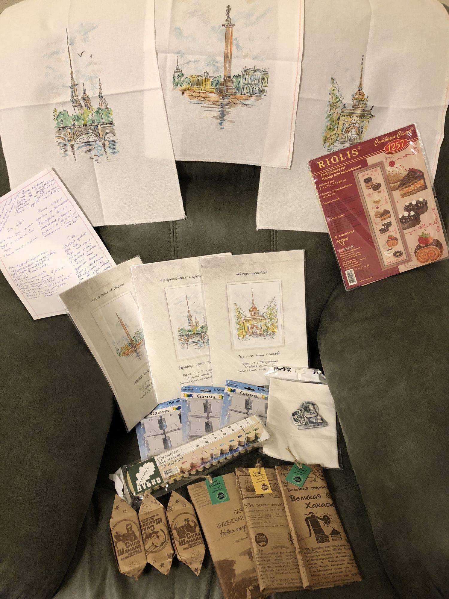 12 сентября 2018 Девочкииии! И я получила свой СЮРПРИЗ! Как здорово-то, оказывается, сюрпризы получать! Гораздо интереснее, чем заранее известный робин. Когда я увидела аж ТРИ картинки, то обалдела просто, от восторга! Триптих - суперкласс!! И сюжеты мне понравились ну прямо очень-очень: все узнаваемые здания, и не пасмурные, как я и хотела, такие будто бы акварельные рисунки. И я вообще в первый раз увидела эти сюжеты. Я же в дизайнерских разработках последних совсем не разбираюсь. То есть сюрприз получился абсолютный. И бобинки с органайзером - ниточки теперь свои намотаю на них. Равномерочка беленькая. И наборчик риолисовский с пироженками - его я тоже хотела! Вышью с удовольствием. И шоколада целая гора, Оля спасибо отдельное! Мы уже попробовали - очень вкусно, с ягодами и орешками сибирскими. Магнитик с шаманом - необычный, будто из камня. А пожелания ваши прочитала - аж слезы на глаза навернулись! Спасибо вам огромное, девочки, за добрые слова! За ваши пожелания, и за то, что пригласили меня в этот замечательный и душевный проект. За ваше терпение и доброту, за то что ждали меня, когда я терялась. Или «тормозила», вот как вчера. Этот триптих станет для меня самой дорогой и памятной вышивкой! Мой питерский талисман: когда его начинали, я еще была ТАМ, а когда закончили - я уже была ЗДЕСЬ! Я очень довольна и рада, сегодня у меня будто день рождения получился. Или новый год какой-нибудь, с подарками. Короче говоря - люблю вас всех; и обнимаю крепко-крепко! PrimaN, lamina-65, Marteire и 8 других сказали спасибо Поделиться сообщением Ссылка на сообщение