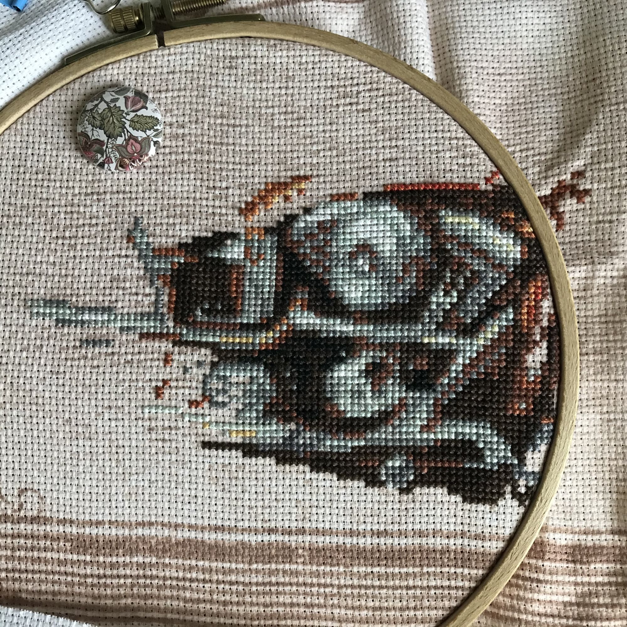 Врум-врум, товарищи! Мой мотоцикл сейчас проходит активную сборку) переставила пяльцы влево, и уже почти добралась до заднего колеса)