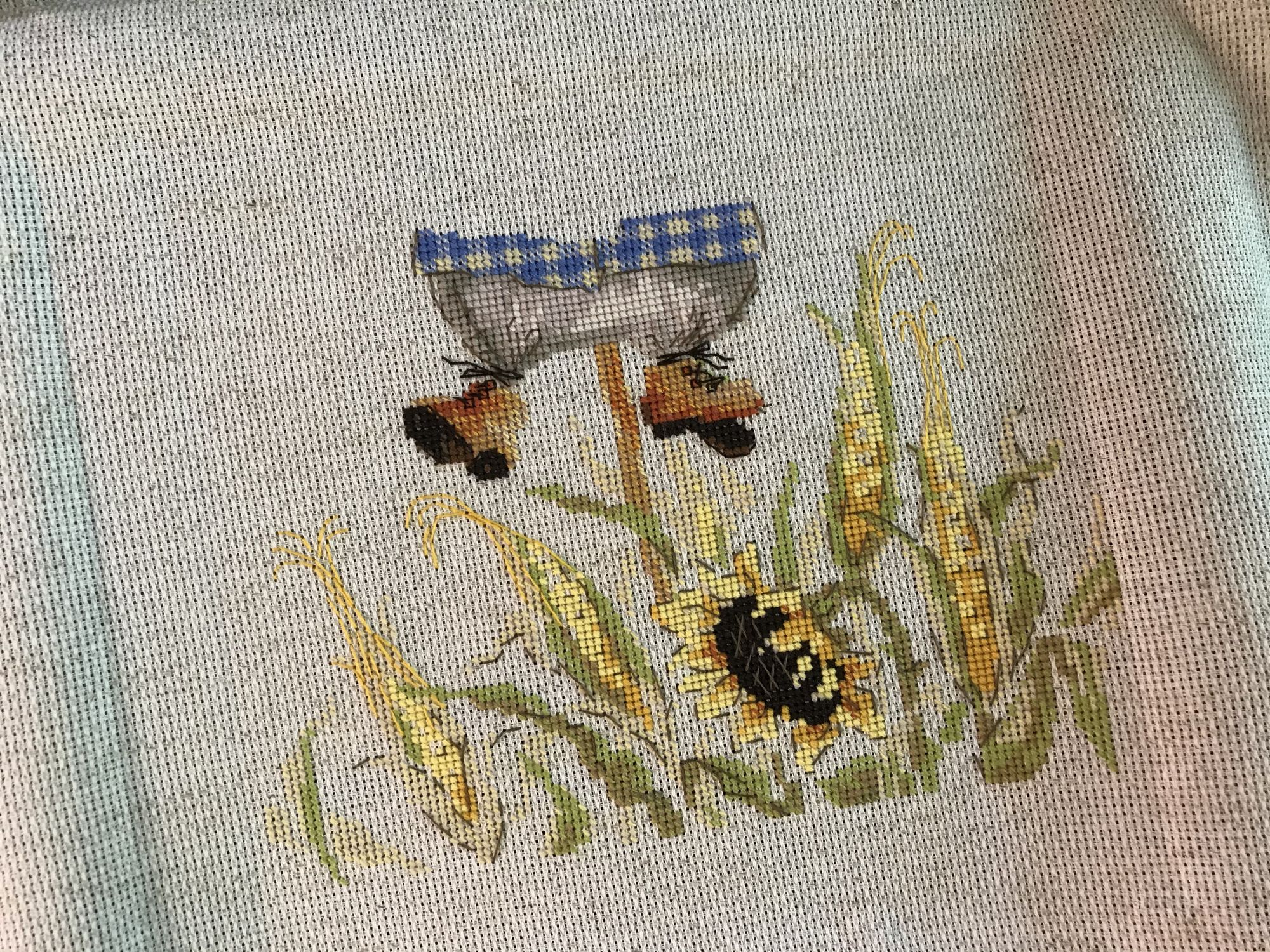 У меня половина работы готова. Осталось само пугало. Вышивается достаточно просто, много полукреста в работе. Из минусов, нашла ещё одну свою ошибку. Оранжевый шила крестом вместо полукреста, переделывать не стала.