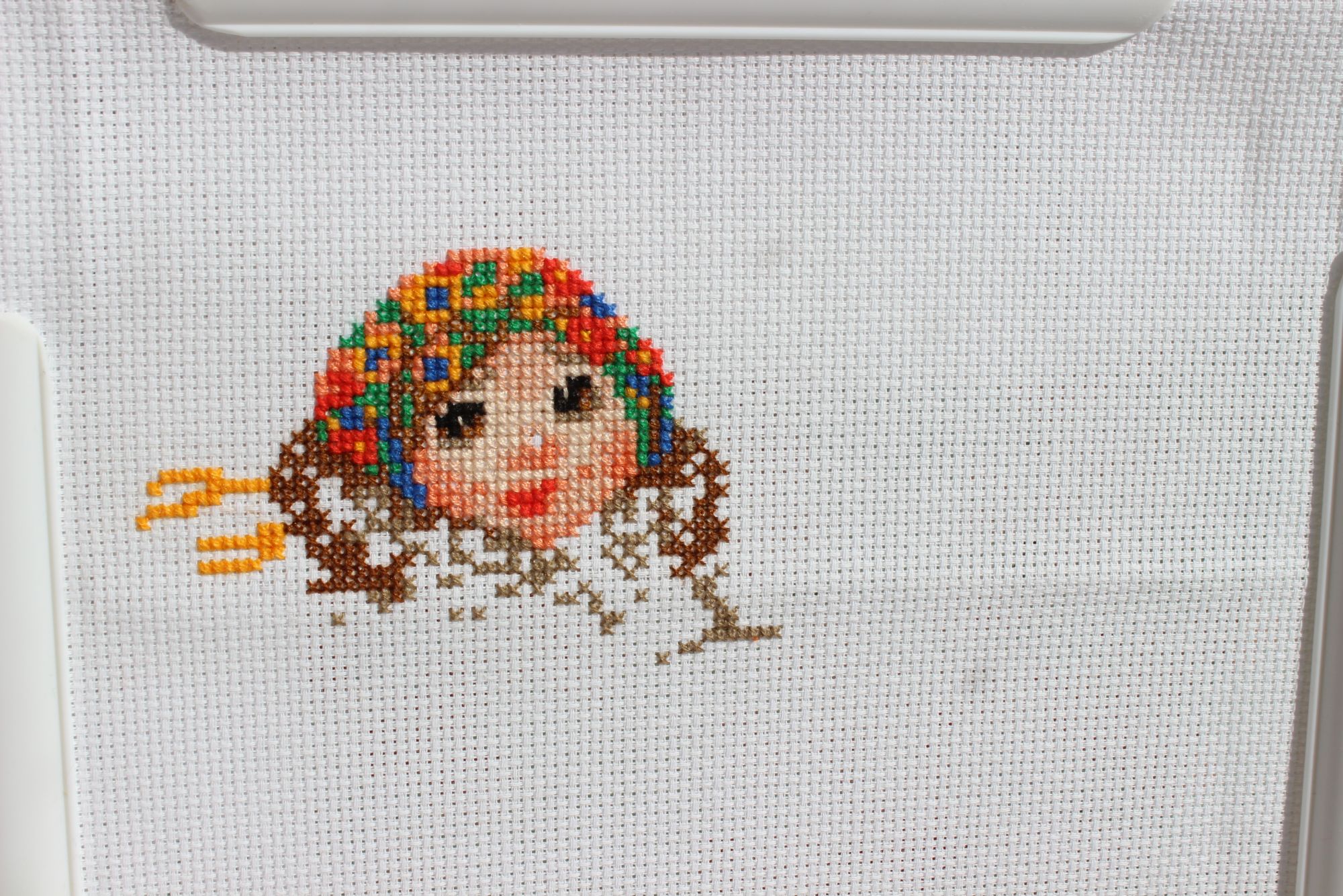 Как то так :blush: Простите за кривенькие крестики, они из шерстяных ниток у меня всегда такие, но я знаю, после стирки и отпаривания все встанет на свои места. Какое то безумное сочетание цветов, при этом для меня процесс медитативный, так как в эту жару не спешно ковыряю только его, отвлекаюсь и отдыхаю от Запоздалого лета. Все очень нравится, впрочем как всегда у Риолис.
