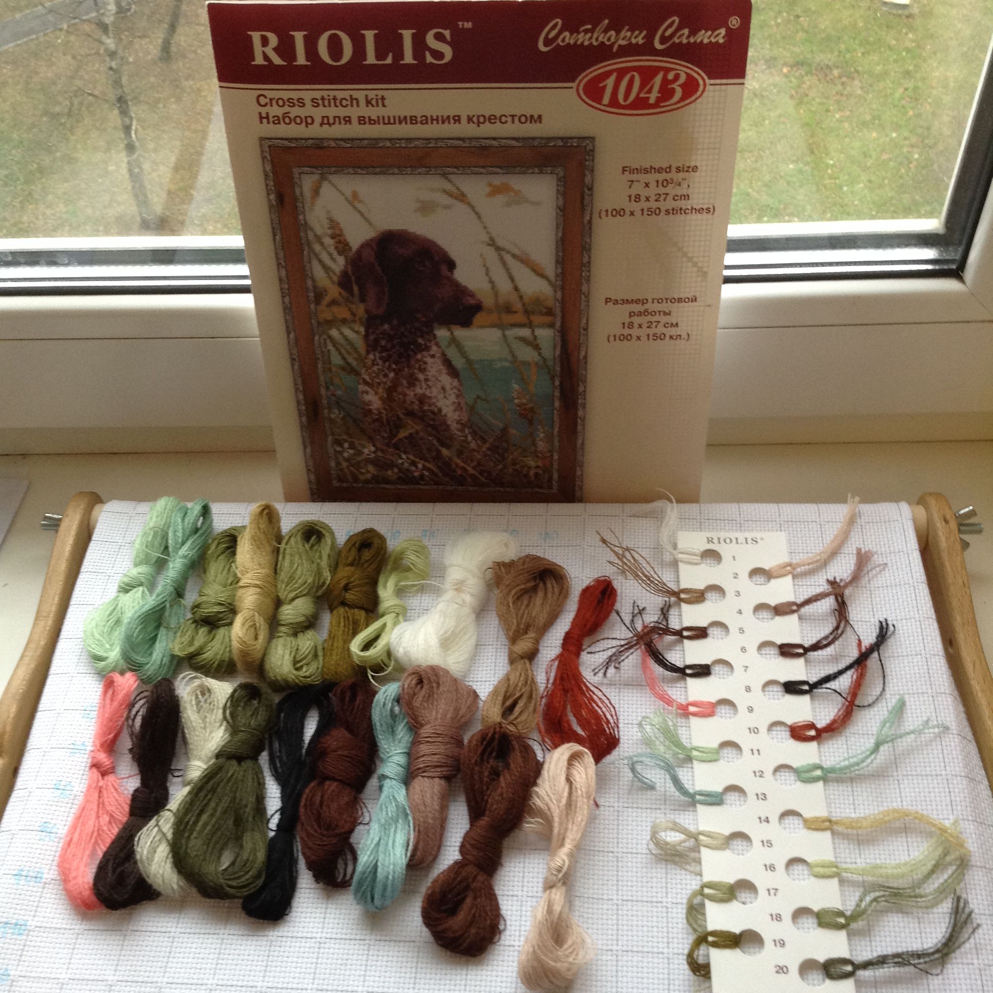 Начинаю вышивать  Курцхаара, артикул 1043. Копия собаки моей сестренки. Когда решила вышить этот набор, то выяснилось, что он снят с производства. Долго искала, нашёлся в небольшом интернет магазине, радости не было предела. Была осень, сразу все разложила запалила в пыльца, НО к новому году срочно понадобился другой пёсель и курцхаарчик встал в очередь. Теперь и его время пришло. Начинаю.