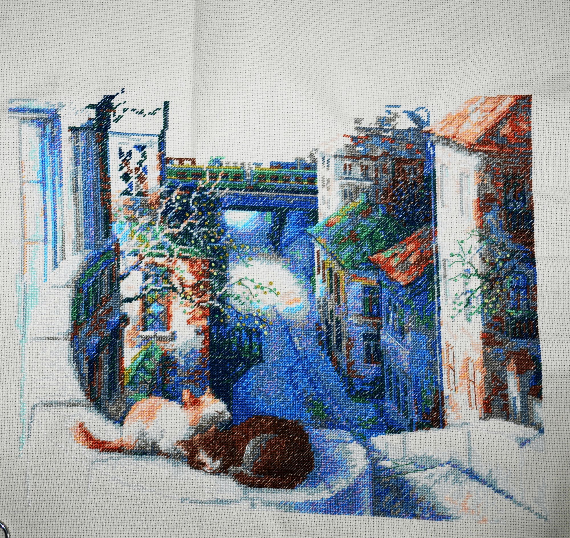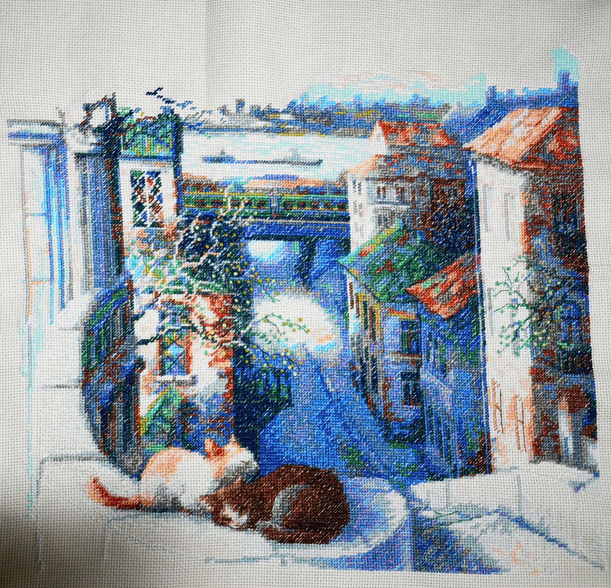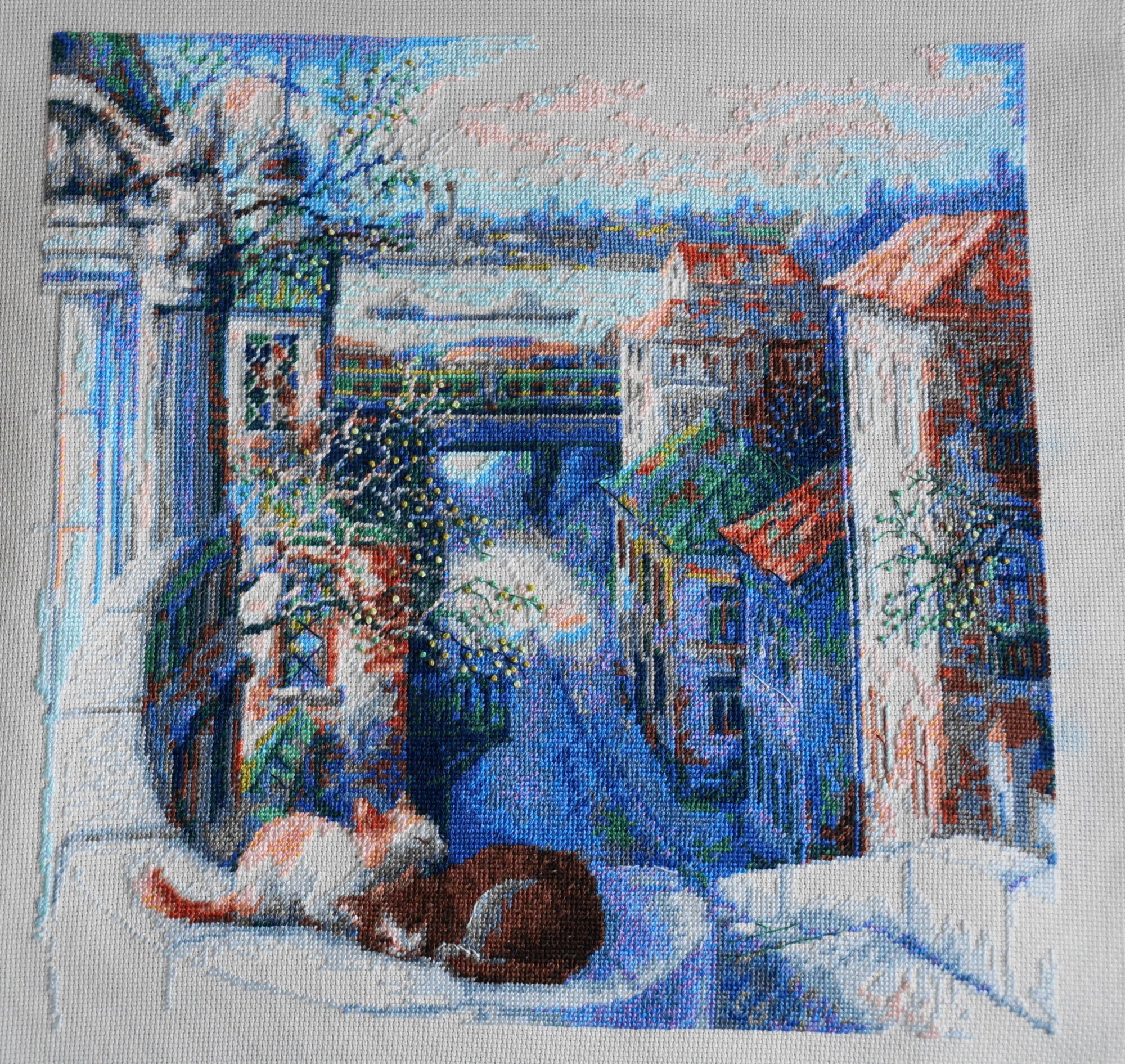 Добрый вечер, коллеги. :-) Я заканчиваю всё-таки свою долгоиграющую Площадь :-) Думаю, что осталось процентов 15, самое простое - по большей части небо. Шью на 20 беллане, полукрестом в 3,2 и 1 нить. Из-за того, что в дизайне используется и шерсть, и мулине (да ещё и стежки в разное сложение нити),  вышивка получается бугристой, это необычно.