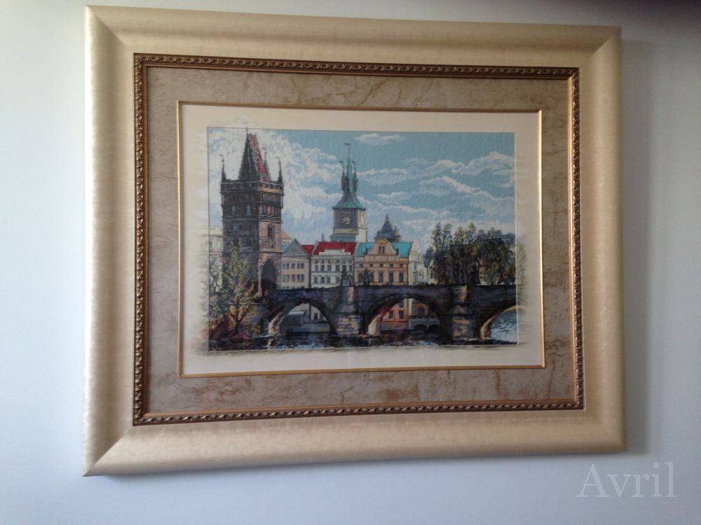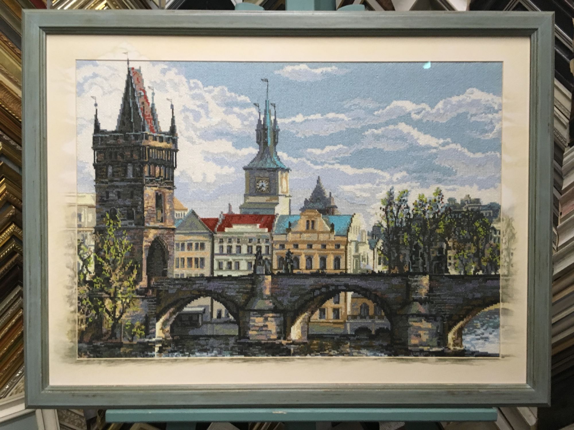 Покажу здесь переоформление Карлового моста. Вышивала моя мама несколько лет назад. Оформлено 8 лет назад, переоформлено в декабре 2018го. Состаренный деревянный багет и музейка.