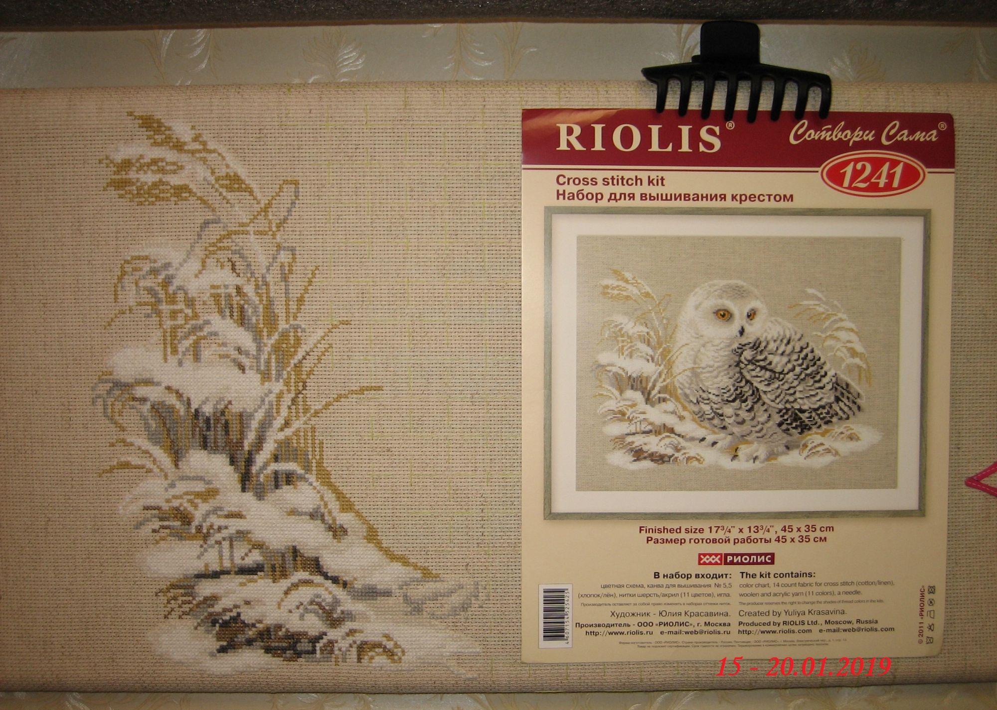 Но совушка и правда быстро шьётся. Знаешь, крыло, хвост, трава, да почти всё,  напоминает вышивку орнаментов; направление крестиков "вверх-вниз-вправ-влево", иногда 2-4 крестика по-диагонали,  нет никаких скачков, очередная группа крестиков - радом с отшитыми, на расстоянии, ну максимум 4-5 через другой цвет, одиночек нет вообще! Немного раздражала вышивка на голове, но в основном из-за убийственной схемы "Риолиса" - терпеть   не могу цветные, потому что не могу выделить, а потом зачеркнуть то, что вышила; на крыле много повторящихся фрагментов  каждого цвета. У меня было всего 2 вышивки риолиса, ёжиков вышивала первыми, сейчас уже и не помню, а вот с орлом - одни заморочки были, чего я и здесь ожидала, но..