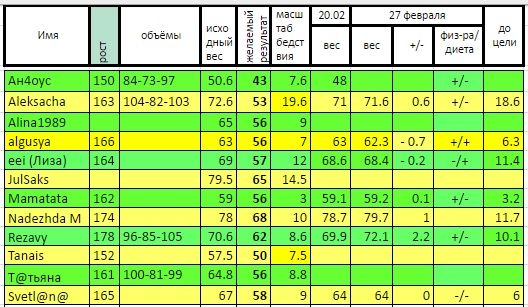 27 февраля 2017 Называется, зашла утром в тему отчитаться и пошли разговоры про приседания... Для меня тоже праздники бесследно не прошли. Но блинчики и шашлычок мы поели Как итог +0,6. Итого 71.6 Будем на этой неделе работать над собой algusya, Mizeri, Svetl@n@ и 2 других сказали спасибо Поделиться сообщением Ссылка на сообщение
