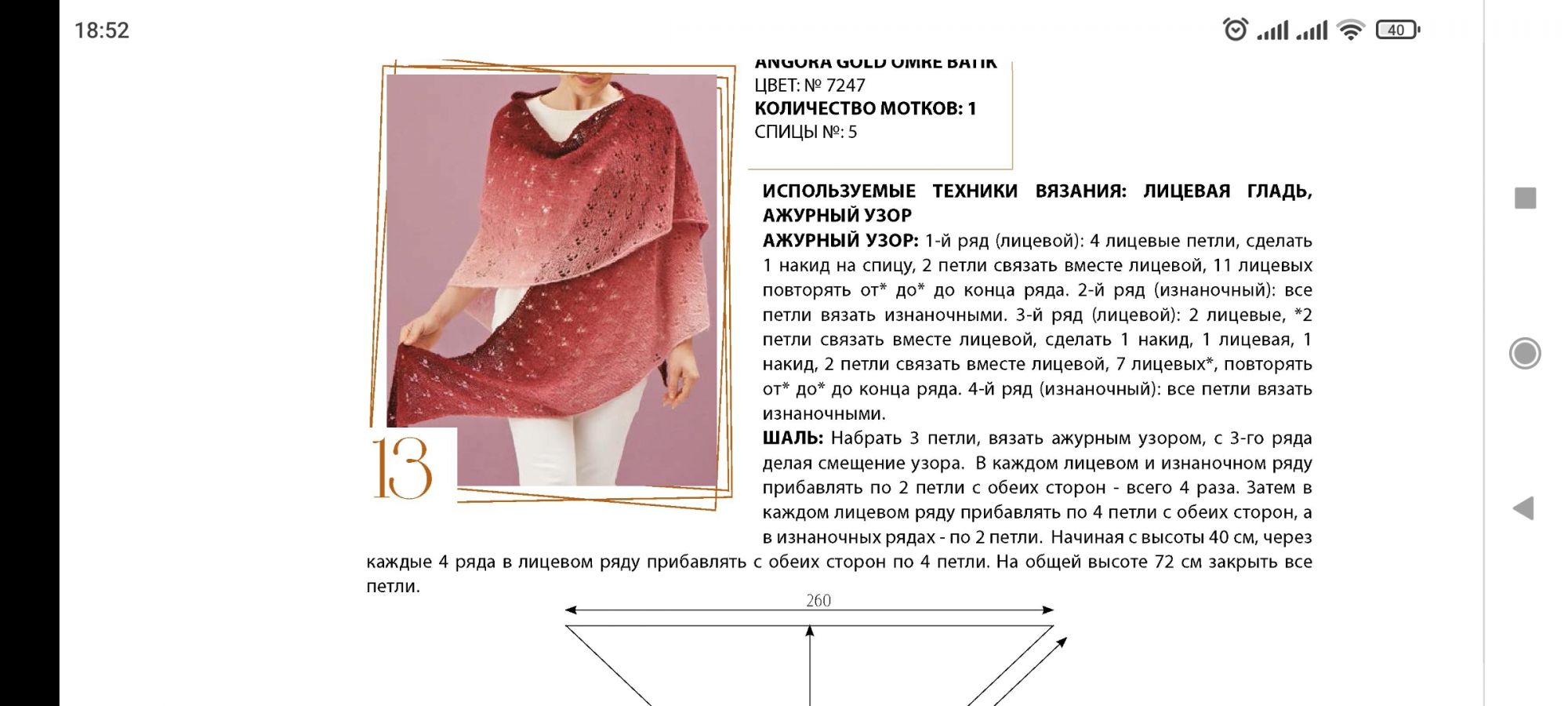 7 апреля 2022 12 часов назад, gryphea сказал(а): . Их вообще не особо много. Даже не обязательно в точности. По верхнему краю 2,60, как-то многовато. Если просто через ряд прибавки, как обычно, слишком треугольный и верхний край короткий. Может есть какой-то способ края удлинить и немного уменьшить по средней линии? Вот это мастерство . О таком даже мечтать не приходится. Как я вижу по фото, здесь нет никакого смещения узора, просто включаются прибавленные петли в рисунок и всё. Если попробовать прибавки в каждом лицевом и изнаночном сделать? Шаль должна быть треугольником с широким углом. Попробовать, как рисунок ляжет, может по 2 петли с каждого края прибавлять. Здесь всё дело в краях, шаль без центральной петли. (Вообще палантин связать). gryphea сказал(а) спасибо Поделиться сообщением Ссылка на сообщение