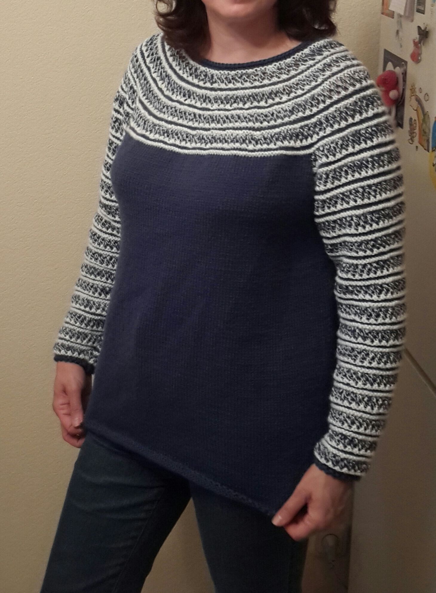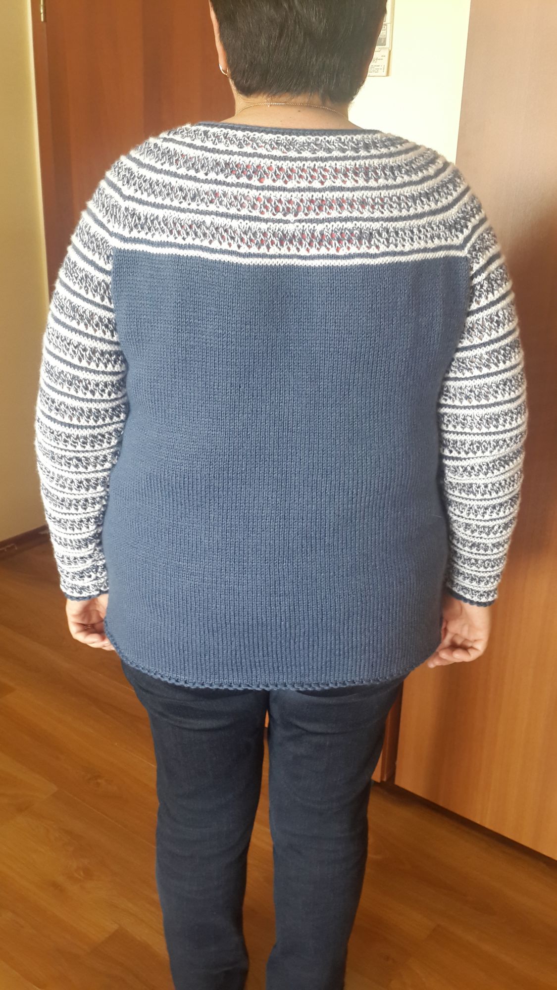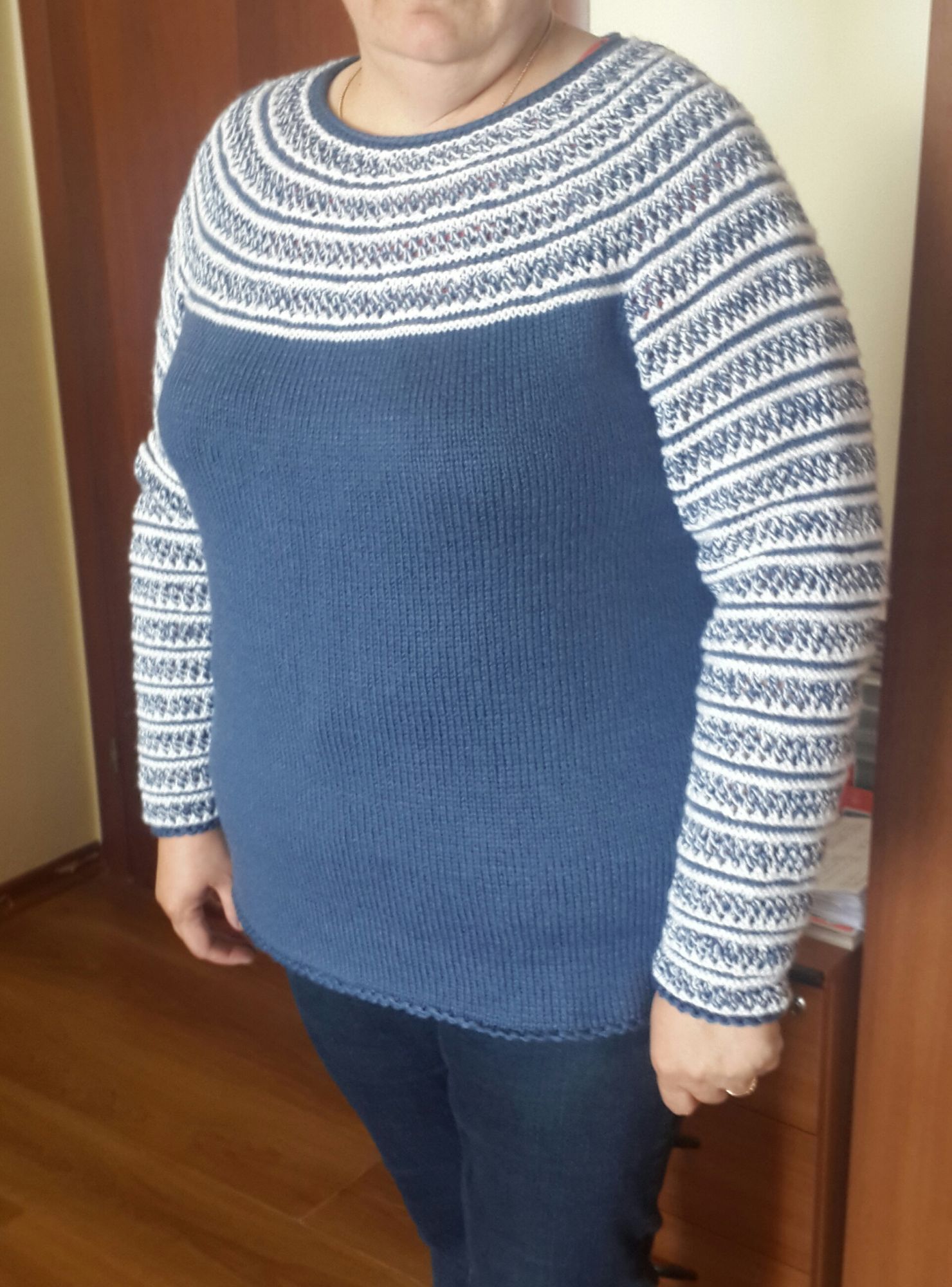 22 ноября 2017 Этой весной, после 15 лет "простоя", я снова начала вязать. Решила порадовать дочку. Выбрали в интернете свитер в морском стиле. Нитки подобрала вместо хлопка Пехорку шерсть мериноса и акрил 50/50 Кроссбред Бразилии в две нитки. Я решила увеличить кокетку горловины ещё на один ряд рисунка. Но после стирки накиды растянулись и я, видимо не учла еще и размер проймы после увеличения, тем самым размер свитера у меня получился больше задуманного. Сейчас молодежь любит носить чтоб свободно сидело...На работе следили за моими процессами и по вязанию. Примеряли свитер и выявили, что свитер подходит от 48 до 54 размера. Так как я очень давно не вязала, и в итоге свитер получился очень аккуратненький, красивый и теплый,то распускать не очень хочется.Что мне сделать, как исправить ошибку? Дочке не очень понравился свитер в готовом виде. До сегодняшенего дня не хотела меня огорчать. А для меня, видимо, нужно перевязывать, т.к. мне он великоват. А так хочется, чтобы свитер нашел свою хозяйку. Жду сотета от мастериц с опытом работы больше чем у меня. I_Konst, kgalimzyanova, Нюша812 и 5 других сказали спасибо Поделиться сообщением Ссылка на сообщение