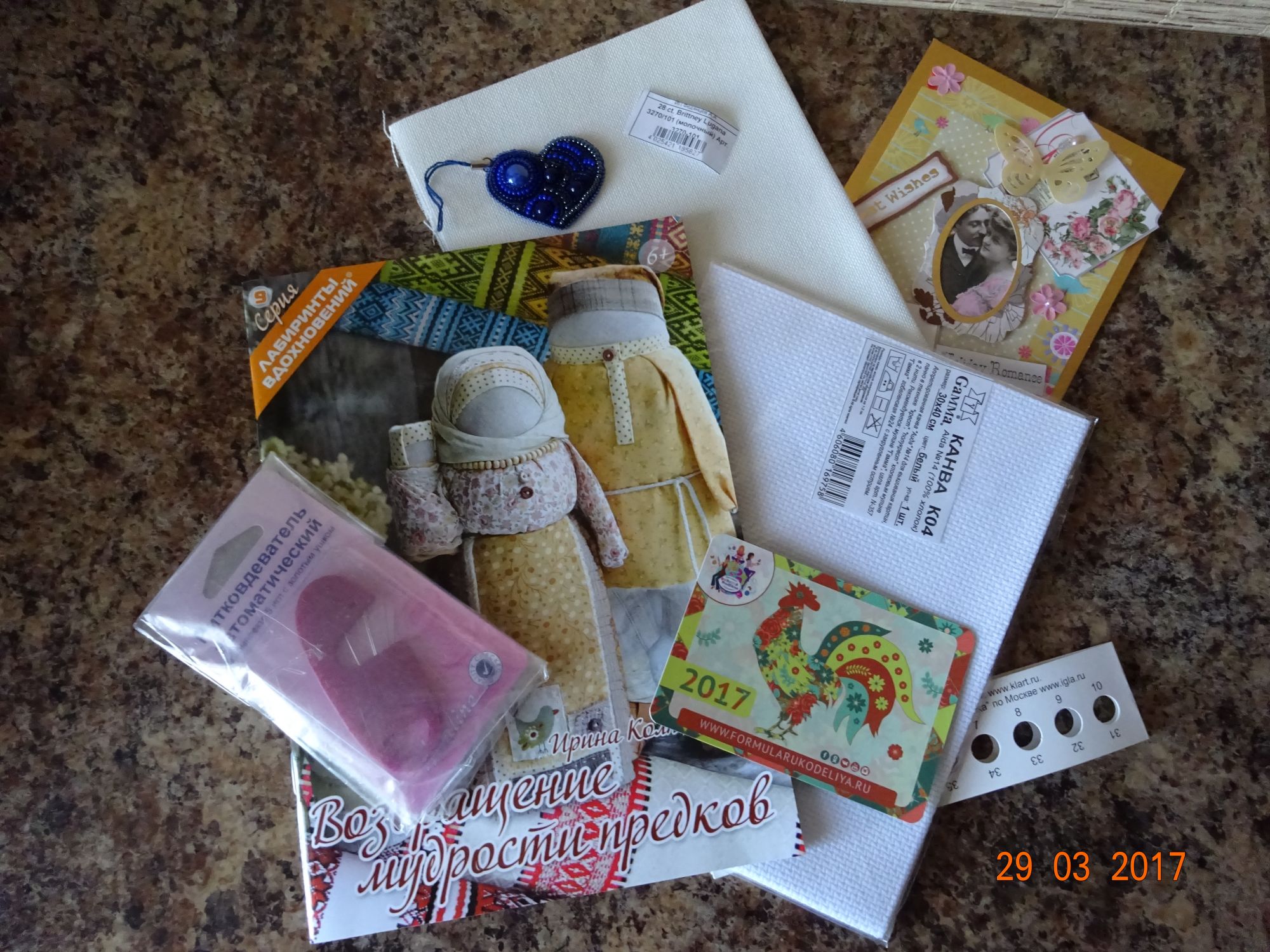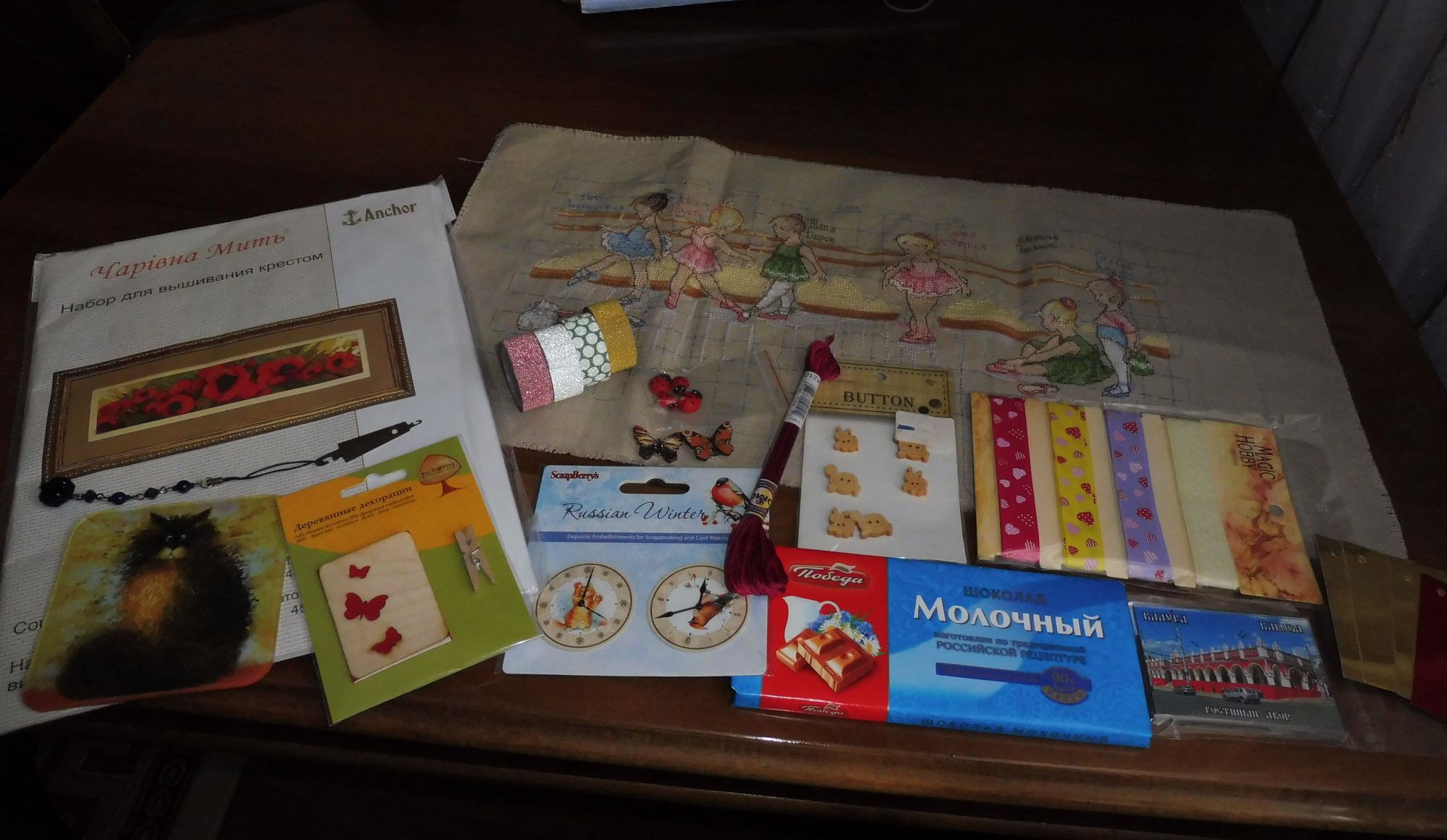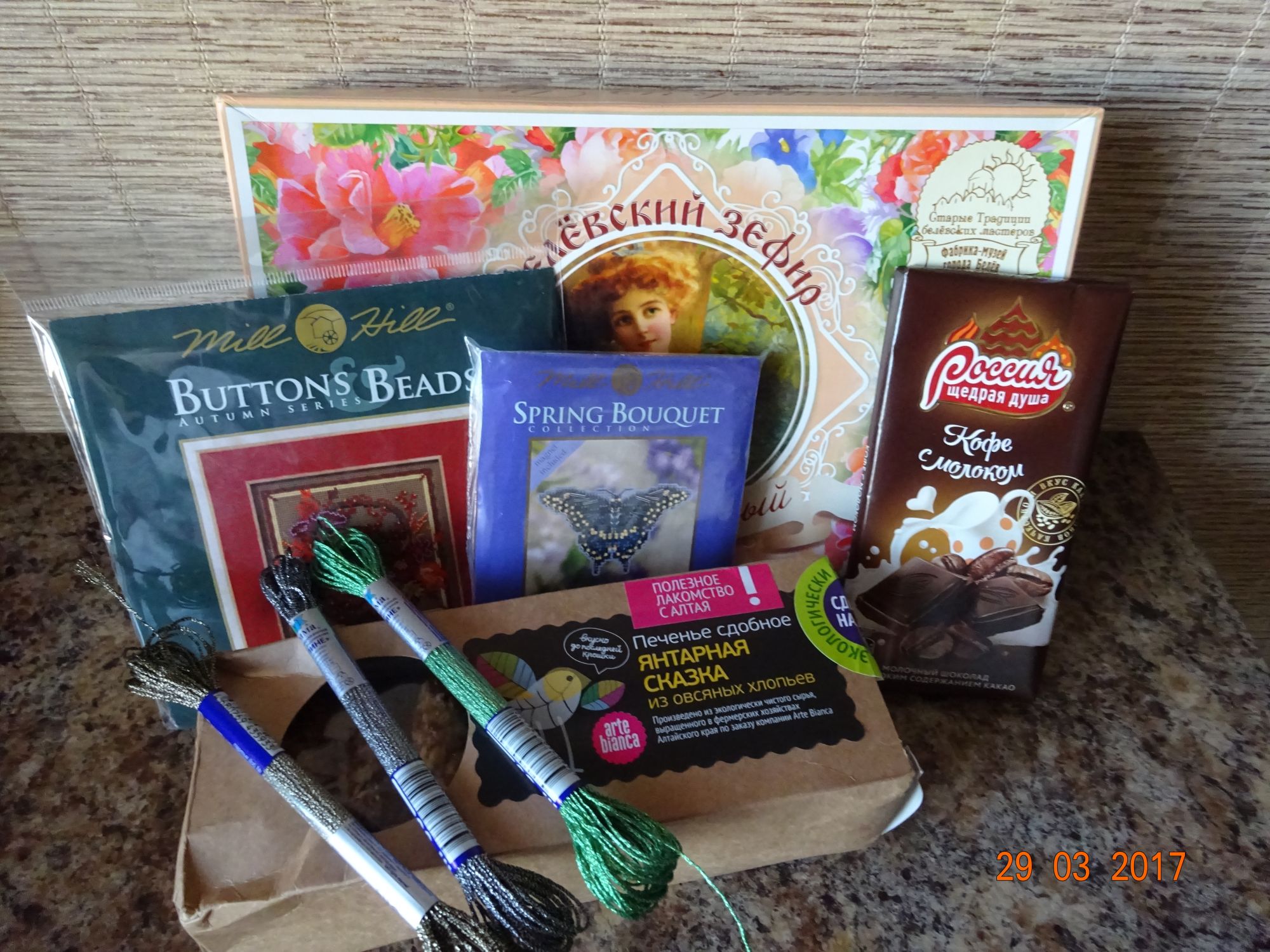 29 марта 2017 Доброе утро всем,ну вот я как и обещала хвалюсь.Это основной подарочек от Олеси,смотрите какая красота ко мне прилетела ,два наборчика от МХ,ниточки металлик и конечно же сладенькое,молодец Олесенька,беспокоится о моей фигуре,а вот подарочки от всех,равномерочка,канва,маячок,нитковдеватель,открыточка,календарик,органайзер,журнальчикВсем большое спасибо за отшив и подарочки.Всем удачи!!!!!!!!!!!!!!!!!!!!!!!!!!!!!!!!!!!!!!!!!!!!!!! Marina_19, Ксен40, Nadezhda M и 4 других сказали спасибо Поделиться сообщением Ссылка на сообщение
