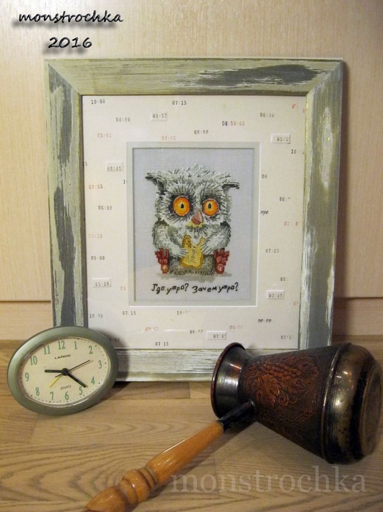 19 октября 2016 Ыть, друзья-подруги требуют выйти из сумрака с третьей работой... Быть посему! От меня третьим конкурсантом будет еще один прикольный невыспавшийся сов... "Совеныш с печенькой" по схеме Полины Тарусовой. Вышился на работе месяца за полтора, там же и поселен, как еще одно напоминание о благости здорового образе жизни ...Кстати, висит ровно напротив своего антипода - супержизнерадостного свежевылупившегося собрата, вышитого тоже по схеме Полины Тарусовой... так сказать, гармонирует и оттеняет... Сэйко, masha-vyshivasha, Ginger_mama и 107 других сказали спасибо Поделиться сообщением Ссылка на сообщение