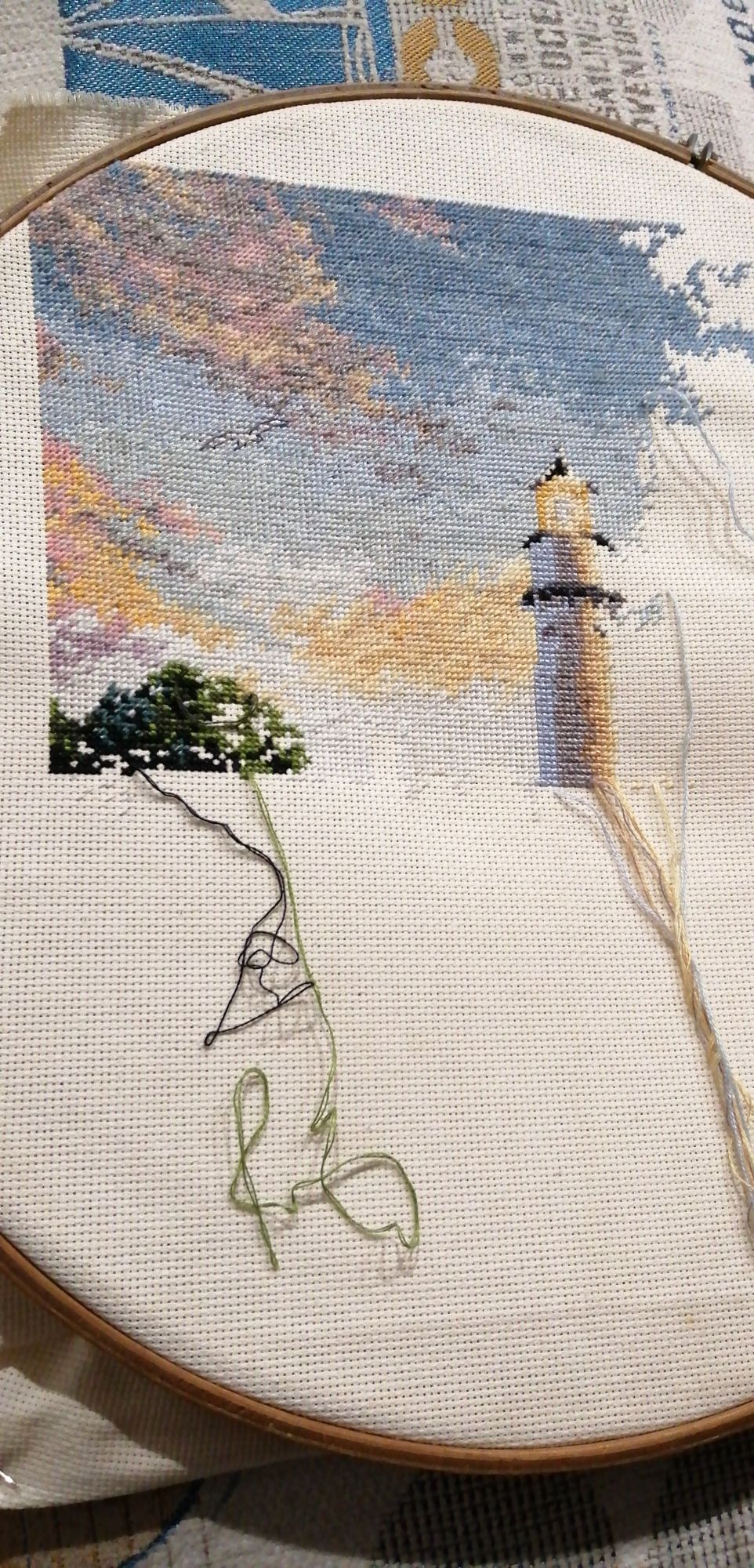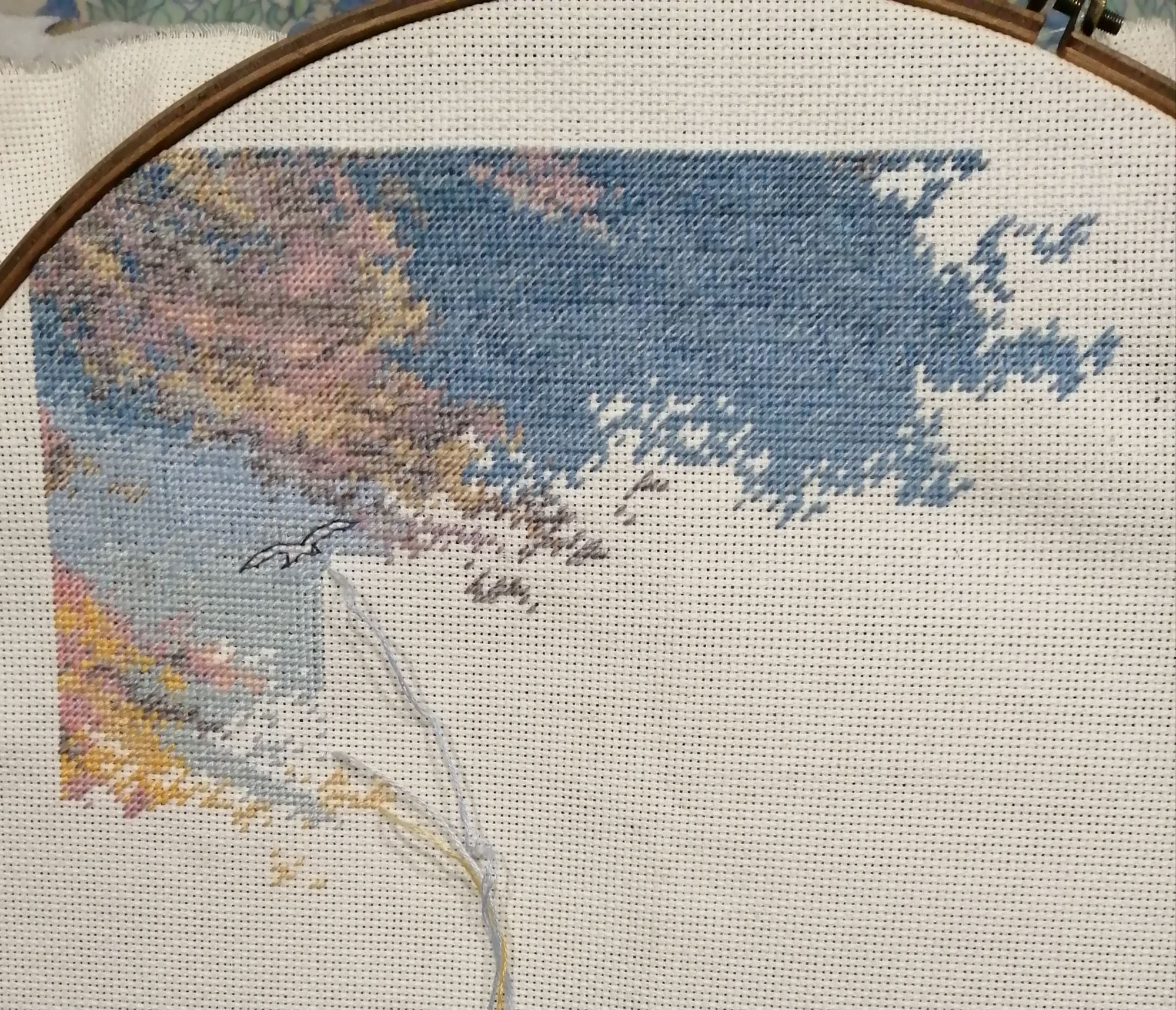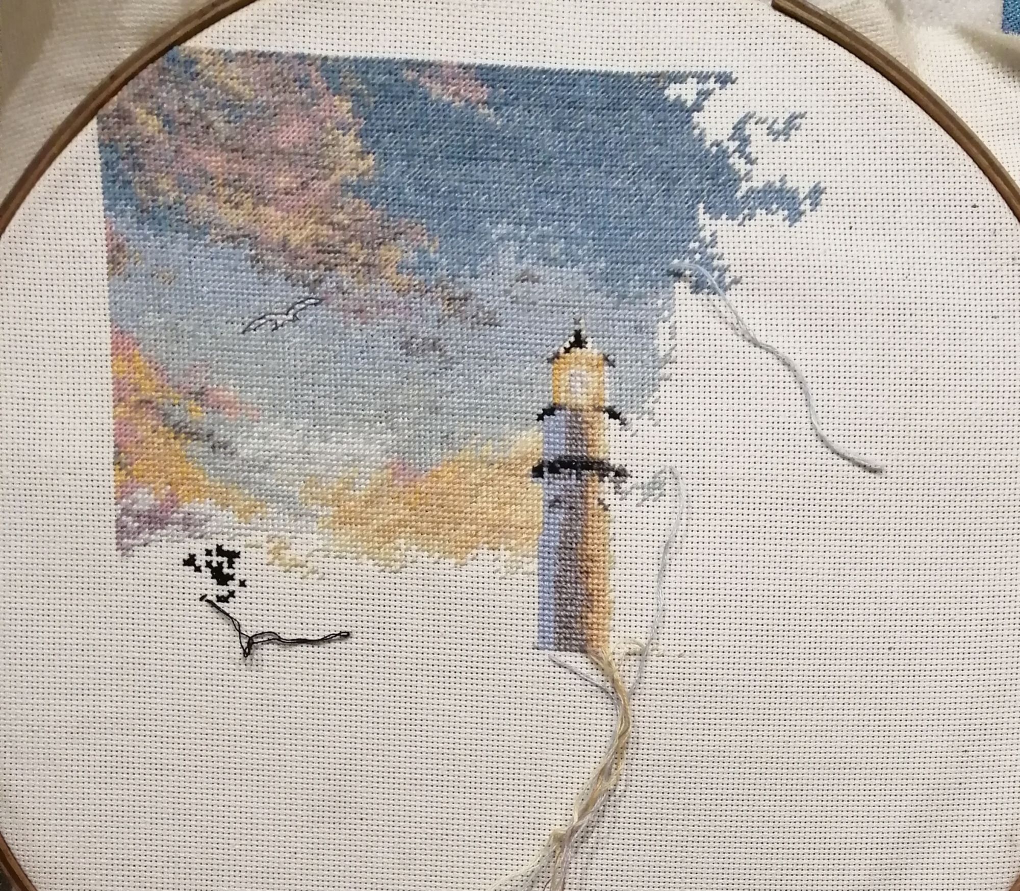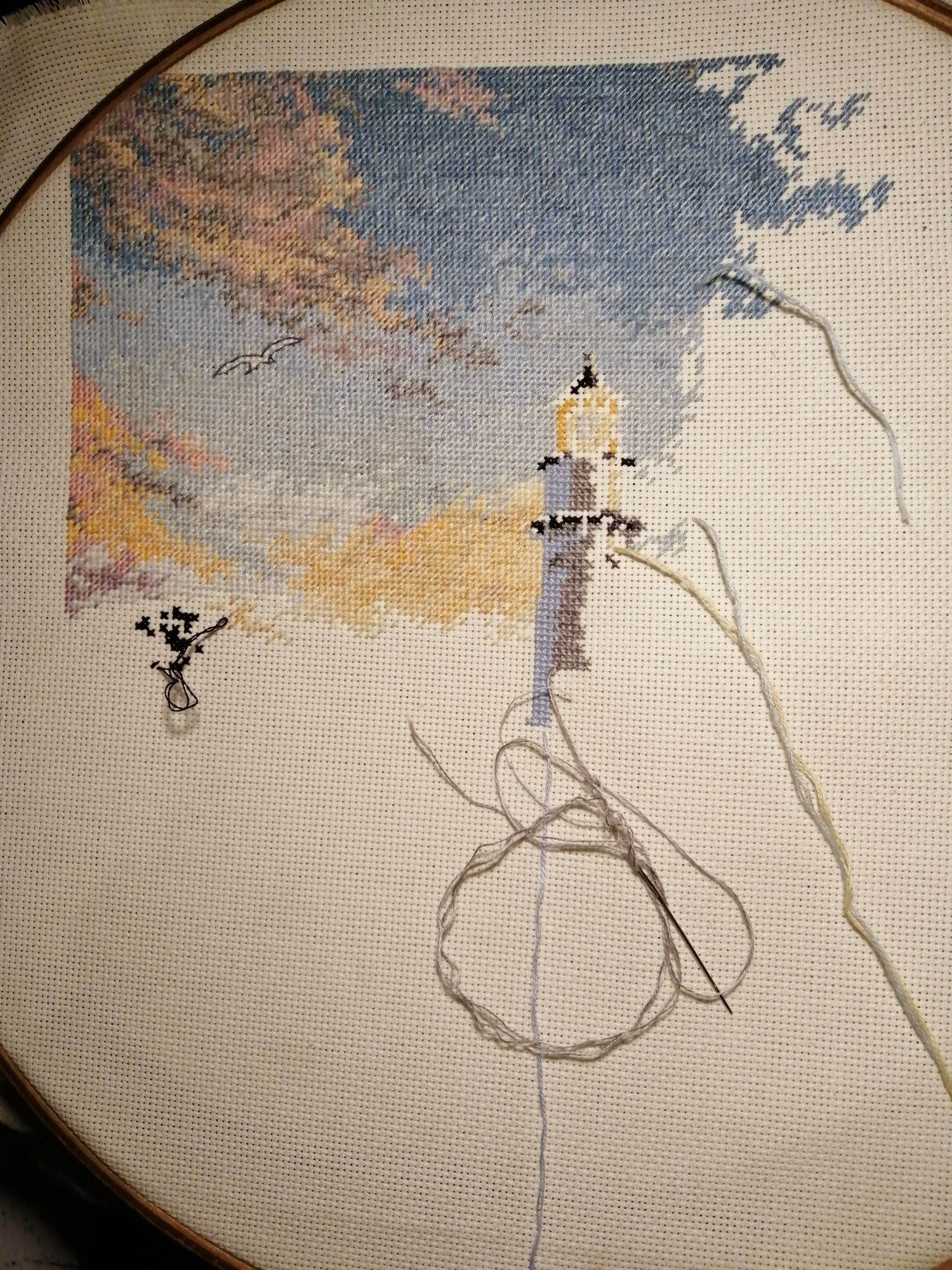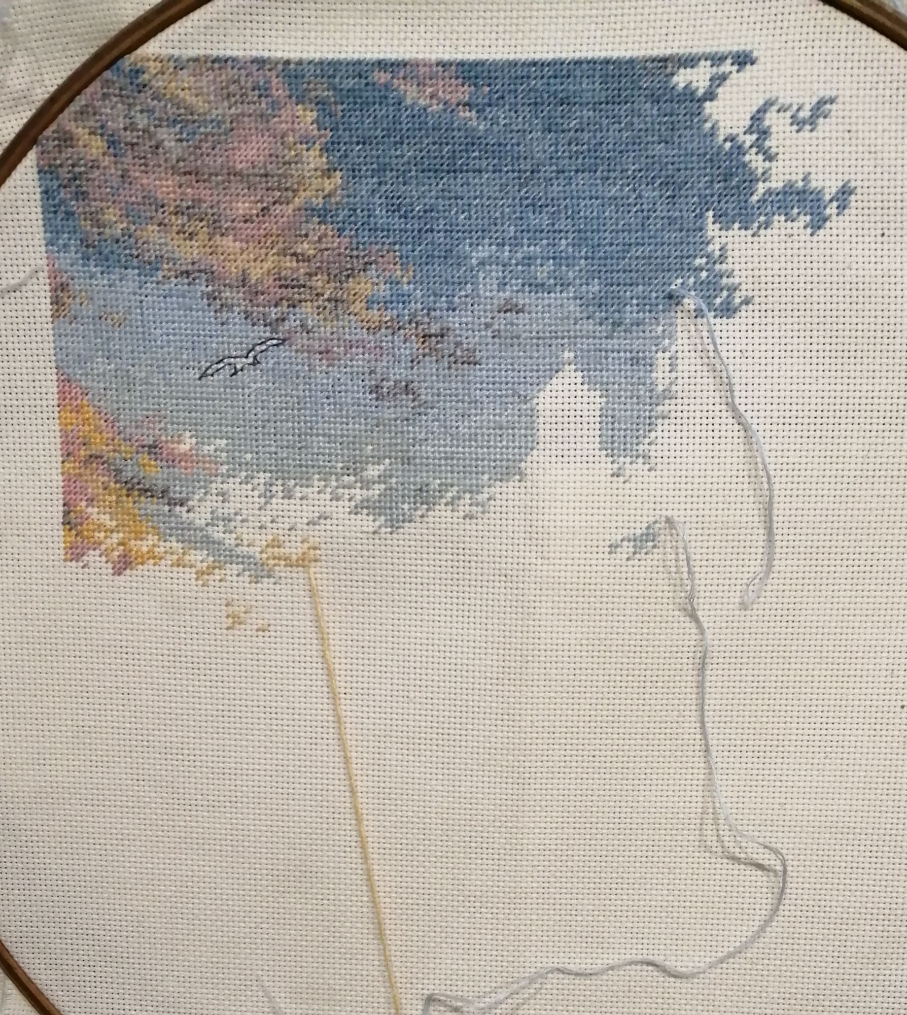 9 марта 2019 06.03.2019 в 00:33, anjyta сказал(а): Я с продолжением маяка. Небо...облака..чайка... Бэк буду добавлять сразу,так удобнее, не придется возвращаться к вышитым участкам и искать нужные крестики. Ещё кусочек неба появился.. не смотря на полукрест, двигаюсь не очень быстро, из-за мелкого каунта канвы и довольно непростого цвета самого неба. Пушистая, Naduh, almmatea и 1 другой сказали спасибо Поделиться сообщением Ссылка на сообщение