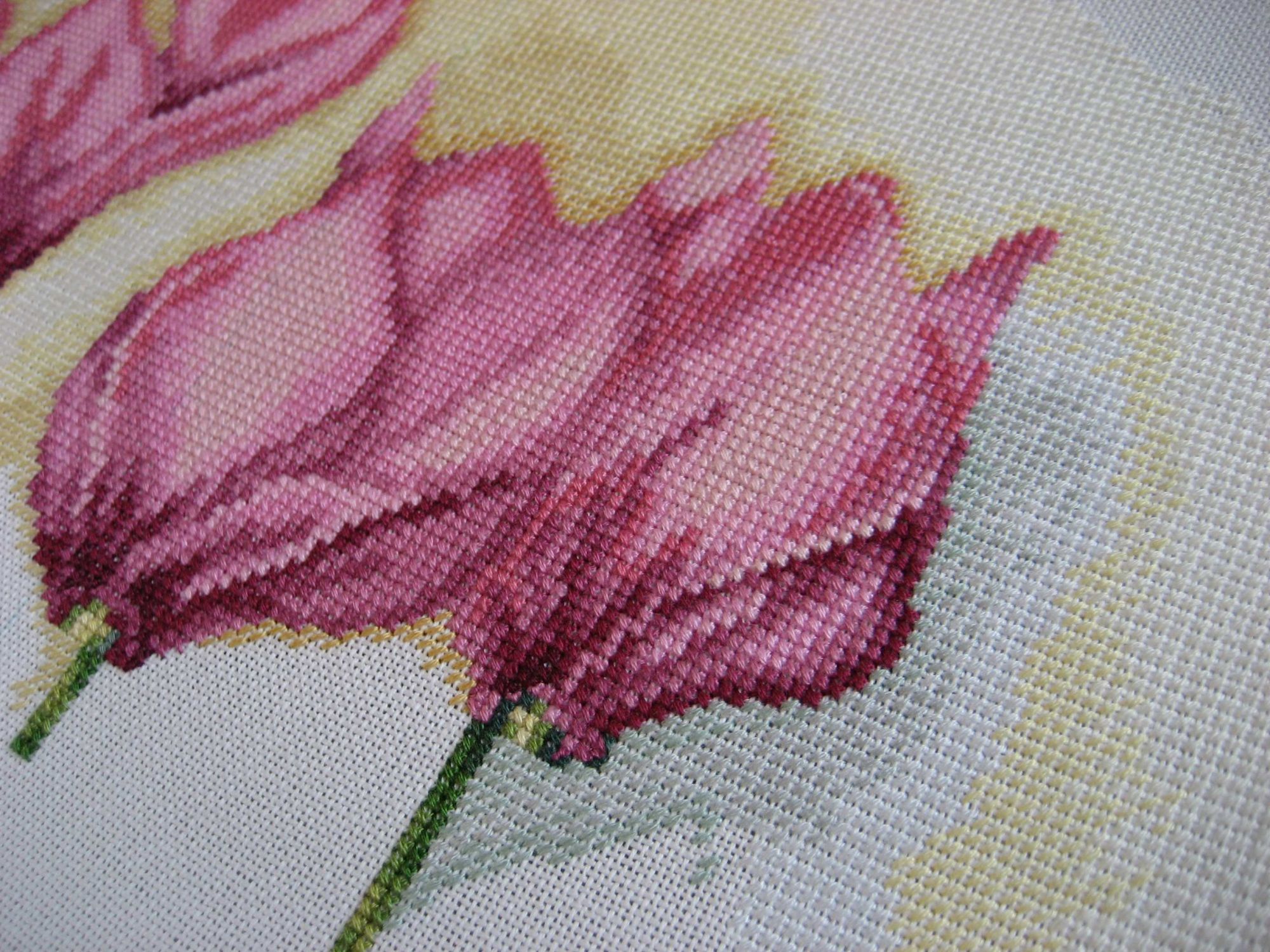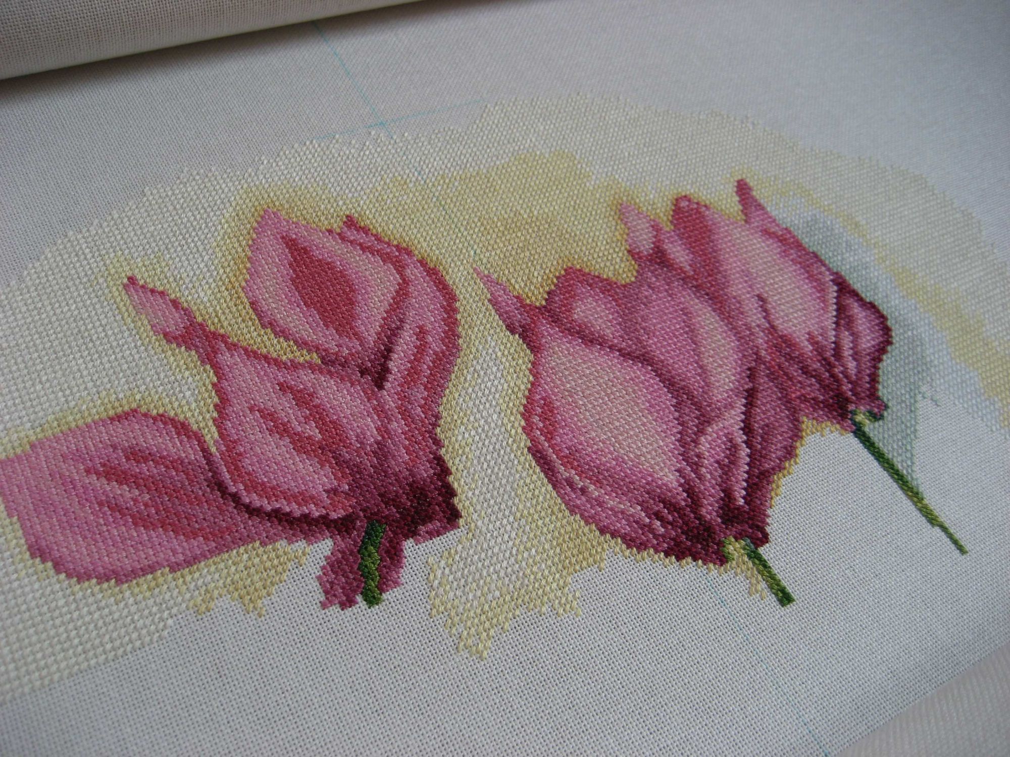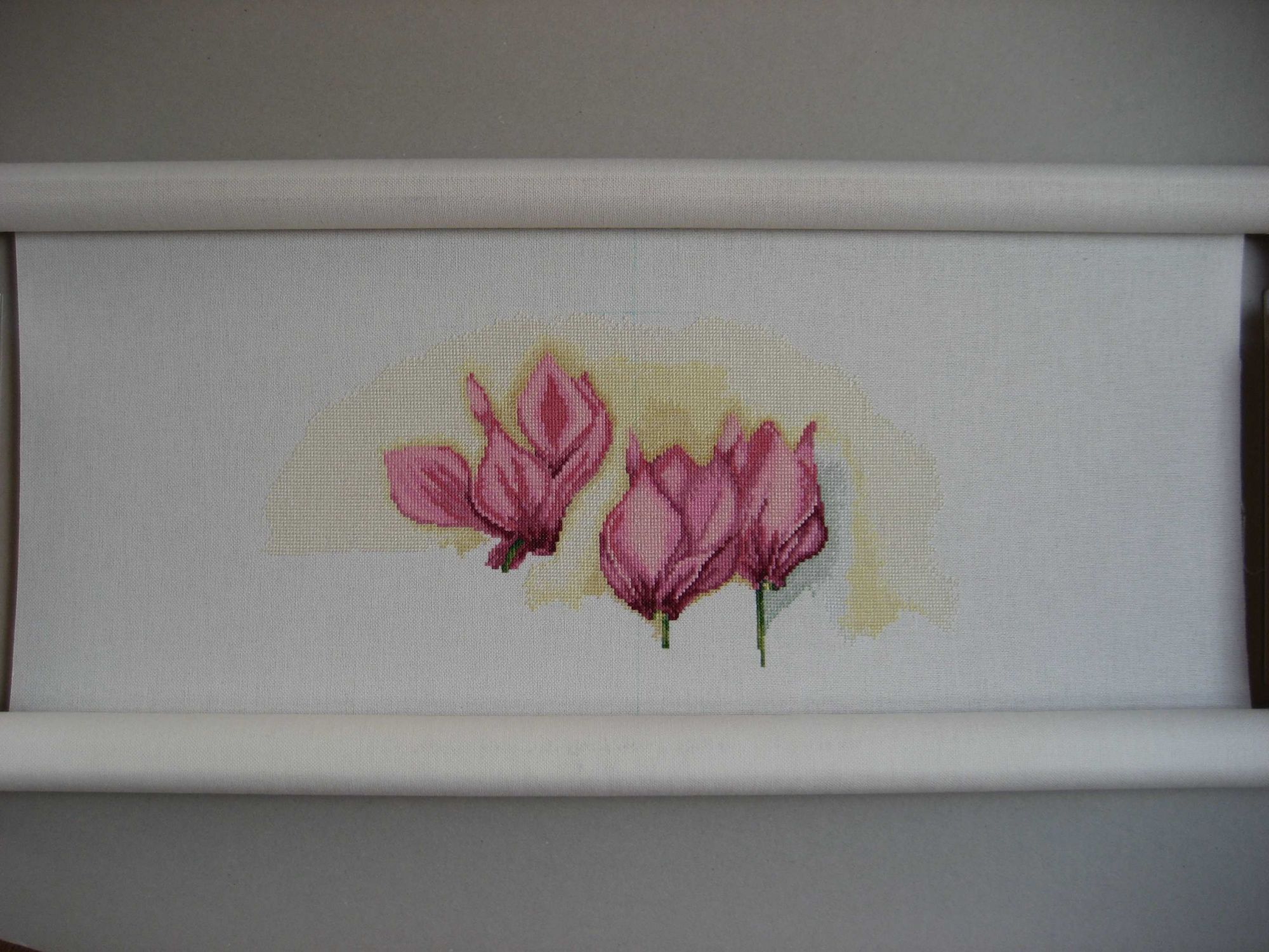 13 августа 2017 Отчитываюсь по Цикламенам. Выросли еще два цветочка. Было: Стало: Сейчас перемотала вышитое вверх и надо что-то решать с боковой натяжкой. Зашивка неполная, так что чем больше буду наматывать на планку зашитую часть, тем больше будет волна по краям (слабее натяжка). Начало шила без горизонтальной натяжки и на фото видно, что ткань уже норовит сжиматься от боков к центру. Дальше будет еще хуже. Не подошла ни натяжка от Алины, ни от Дубко, т.к. края тканюшки очень близко к боковым планкам подходят. Придется пришивать. Не люблю я это дело - мороки много, да и дыры будут на ткани. Ничего не поделаешь, сейчас пойду колдовать . Что могу сказать по материалам: я уже писала, что аиду заменила на мурано, так вот, муранка радует. До этого вышивала на ней только маленькие работы - старого филина да начало пейзажика от лука-с. На большой работе вроде тоже ведет себя неплохо. Обнаружила небольшой брак - ниточка одна чуть ли не вдвое толще других попалась (небольшая - сантиметра два в длину), зашилась полукрестом, вроде не заметно. К ниточкам привыкла уже. Чем-то напоминают мулине из наборов Dimensions китайской сборки, только тоньше. Что касается проработки схемы, пока могу сказать, что на цветочках схема не сложная - довольно большие участки зашиваются одним цветом, а вот например стебелек у среднего цветочка, вроде такой небольшой, а задействовано аж семь цветов мулине. С дробными крестиками уже столкнулась, они как раз в области стебельков. Шью их как два три-четверть-крестика в одной клеточке. Мне так проще - не надо думать, какой цвет в этой клеточке должен превалировать. Фон - большие области зашиваются одним цветом. Шахматки, которую я шибко не люблю, нет. Цвета на границах аккуратно вливаются один в другой. Цвета фона подобраны таким образом, что выглядят как размывы акварельной краски. Мне не очень нравятся пока желтые тона в фоне, но уж такая задумка дизайнера. Может в целом будет лучше смотреться. Спасибо за внимание. Всем легких крестиков! Veta, АлёNка, Гало4ка и 31 других сказали спасибо Поделиться сообщением Ссылка на сообщение