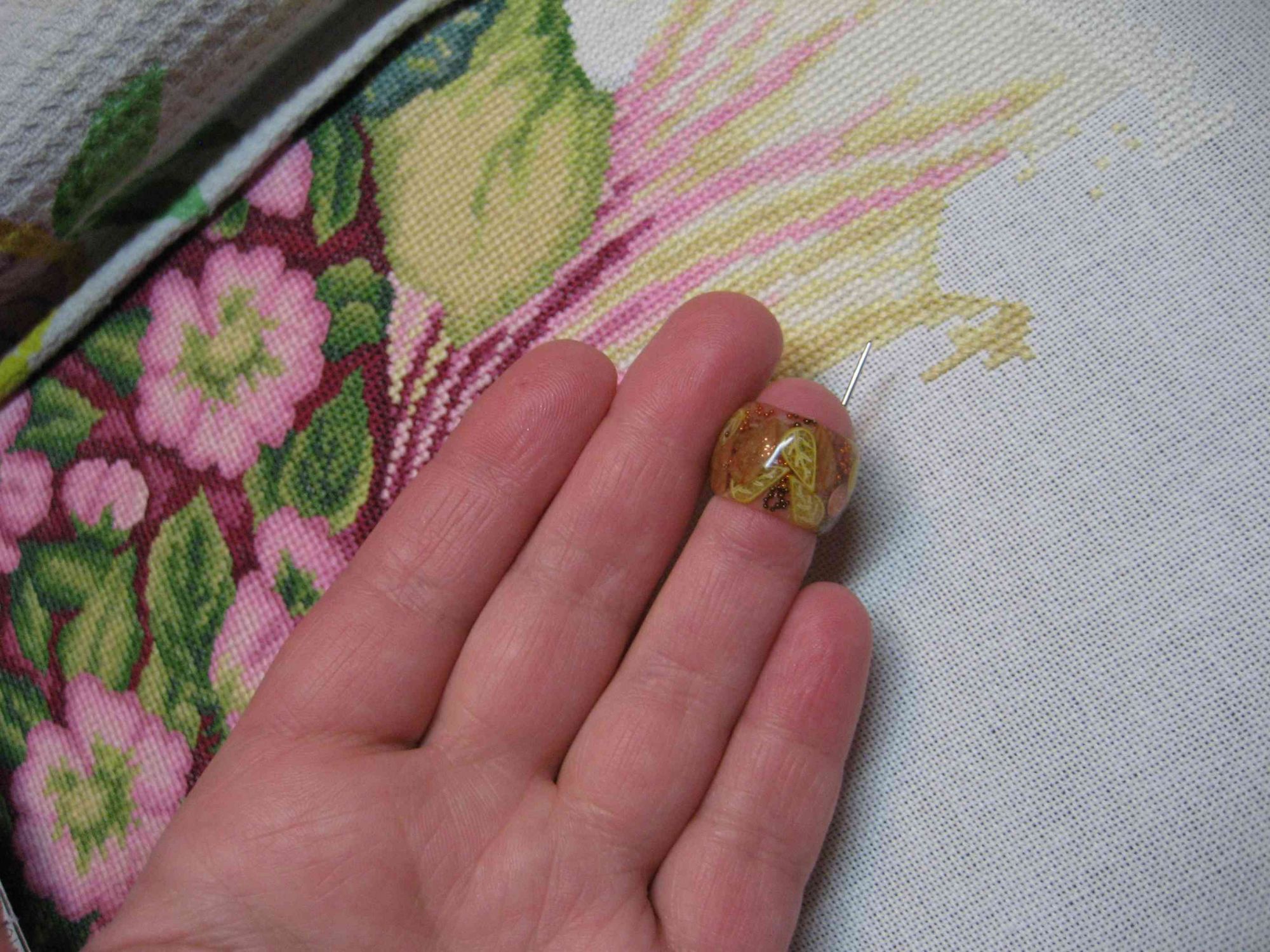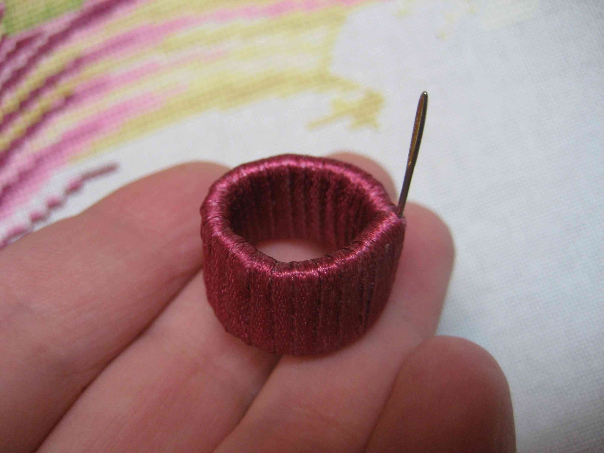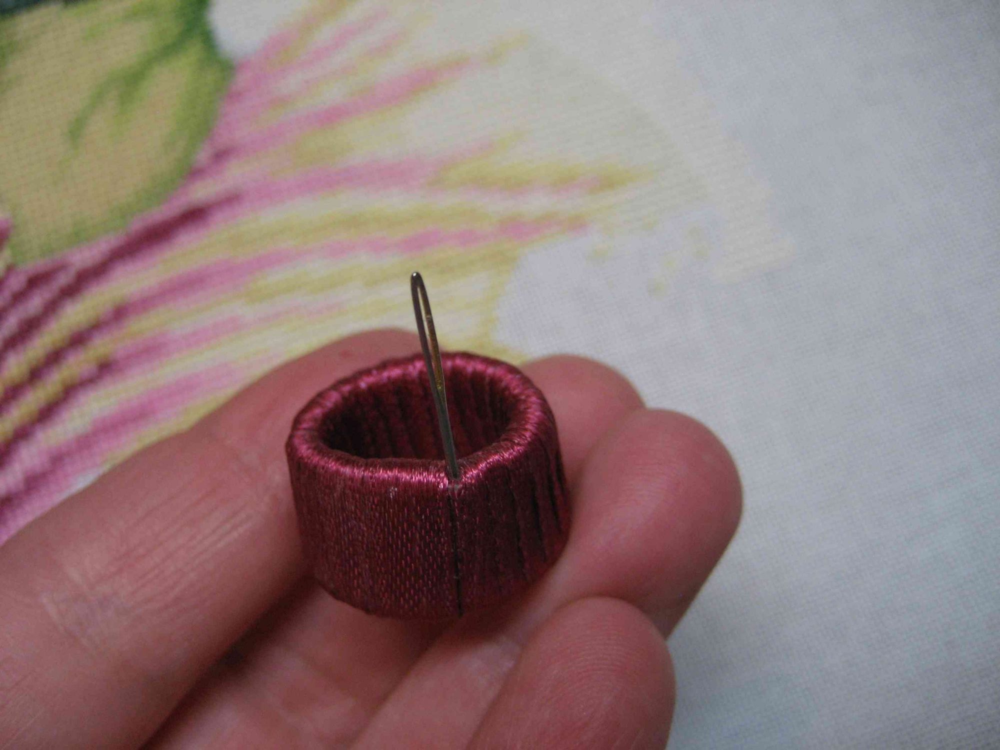 8 февраля 2018 Фото 10 - сделала специально, чтобы показать, в каком положении находится игла относительно ногтевой пластинки: 10. Фото 11 - вид наперстка при раскрытой ладони, видно, насколько глубоко сидит наперсток на пальце: 11. Фото 12 - еще один Иринин наперсток - он мне большеват. Сидит на пальце очень глубоко, так работать очень неудобно. 12. Фото 13 - еще один наперсточек, в нем игла потолще. 13. Фото 14-18 - моя самоделочка )) У гибкого пластикового наперстка обрезала верхушку, приклеила иглу суперклеем (предварительно ее укоротила - отхряпала кусок плоскогубцами), обмотала атласной ленточкой (шириной 6 мм), кончик ленточки подшила изнутри (видно на 18 фото) 14. 15. 16. 17. 18. Фото 19 - для сравнения габаритов самоделки и гелевого наперстка. Гелевый менее громоздкий и более эргономичный. 19. Надо признаться, что к гелевому не сразу привыкла. На самоделке - торчит ушко иголки, оно широкое и очень хорошо помогает "расплющивать" нитки в момент прижимания к ткани. В гелевом наперстке поначалу этого сильно не хватало. Жалела, что не заказала наперстки с торчащим ушком, а не острием. А потом привыкла. И еще - поначалу не нравилось вышивать с гелевым, потому что пальчик все время потел. Приклеила внутрь пластырь тканевый телесного цвета и проблема исчезла. Девочки, что я еще не написала? Что упустила? lesik, Marbll, Хельга и 23 других сказали спасибо Поделиться сообщением Ссылка на сообщение