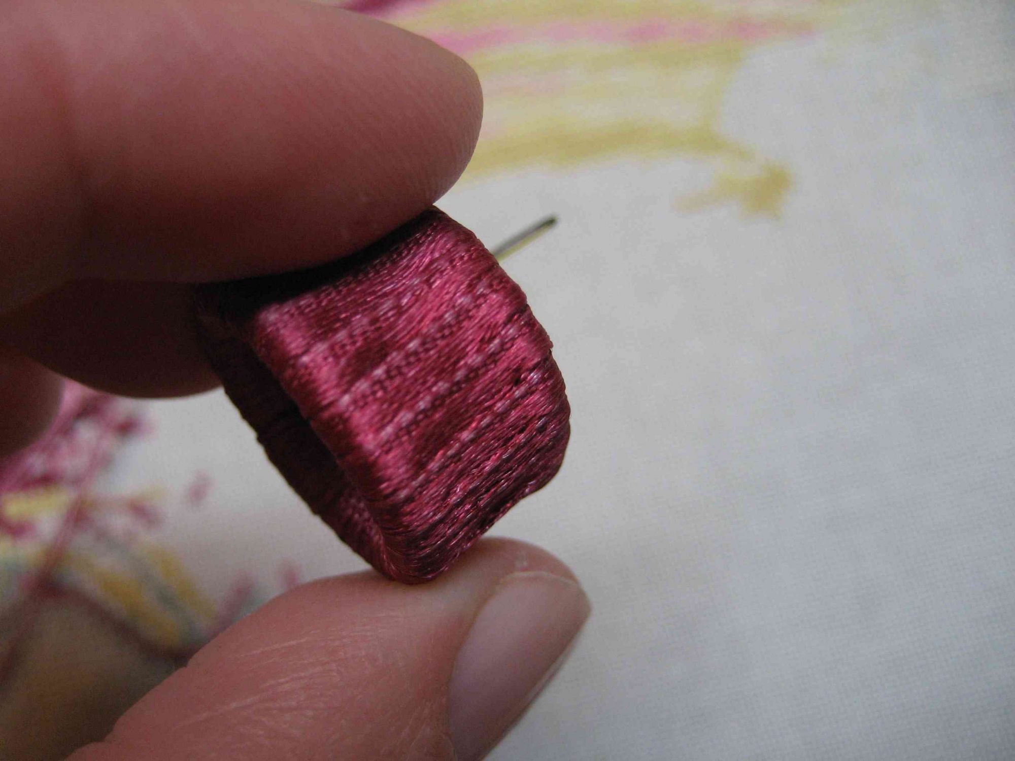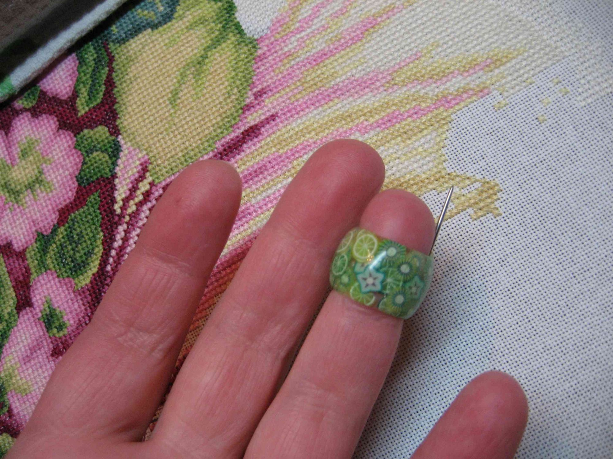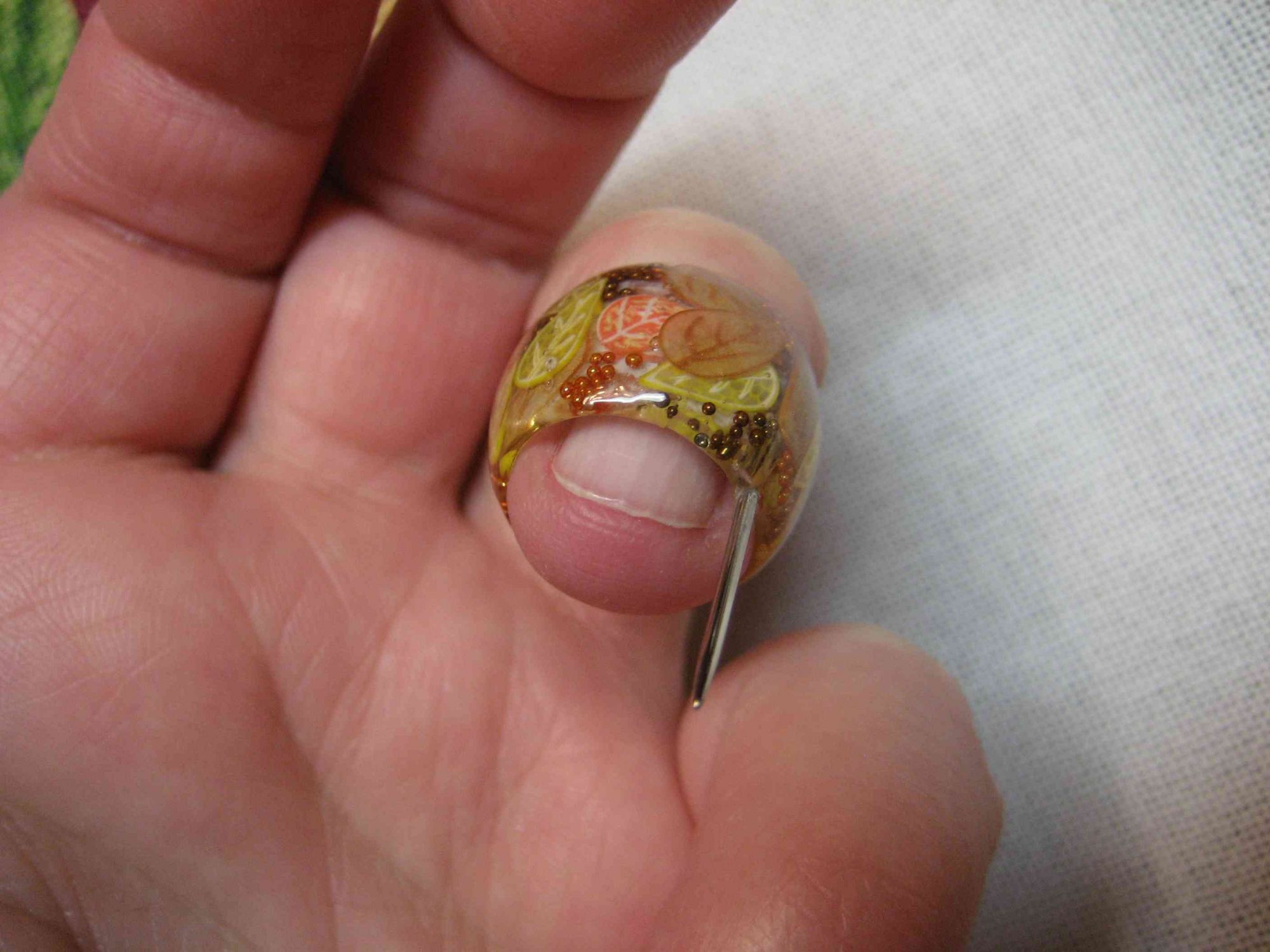 8 февраля 2018 Фото 10 - сделала специально, чтобы показать, в каком положении находится игла относительно ногтевой пластинки: 10. Фото 11 - вид наперстка при раскрытой ладони, видно, насколько глубоко сидит наперсток на пальце: 11. Фото 12 - еще один Иринин наперсток - он мне большеват. Сидит на пальце очень глубоко, так работать очень неудобно. 12. Фото 13 - еще один наперсточек, в нем игла потолще. 13. Фото 14-18 - моя самоделочка )) У гибкого пластикового наперстка обрезала верхушку, приклеила иглу суперклеем (предварительно ее укоротила - отхряпала кусок плоскогубцами), обмотала атласной ленточкой (шириной 6 мм), кончик ленточки подшила изнутри (видно на 18 фото) 14. 15. 16. 17. 18. Фото 19 - для сравнения габаритов самоделки и гелевого наперстка. Гелевый менее громоздкий и более эргономичный. 19. Надо признаться, что к гелевому не сразу привыкла. На самоделке - торчит ушко иголки, оно широкое и очень хорошо помогает "расплющивать" нитки в момент прижимания к ткани. В гелевом наперстке поначалу этого сильно не хватало. Жалела, что не заказала наперстки с торчащим ушком, а не острием. А потом привыкла. И еще - поначалу не нравилось вышивать с гелевым, потому что пальчик все время потел. Приклеила внутрь пластырь тканевый телесного цвета и проблема исчезла. Девочки, что я еще не написала? Что упустила? lesik, Marbll, Хельга и 23 других сказали спасибо Поделиться сообщением Ссылка на сообщение