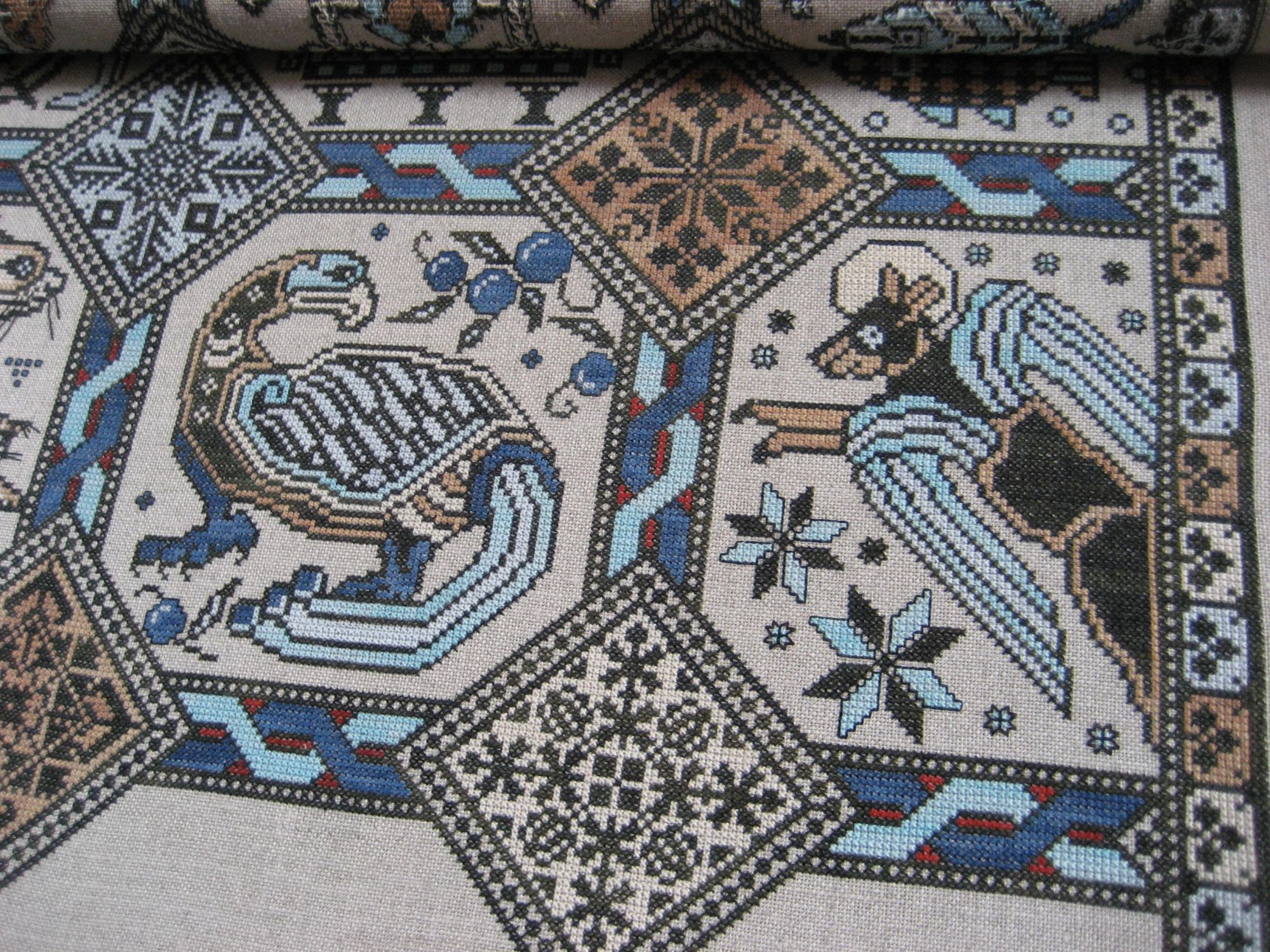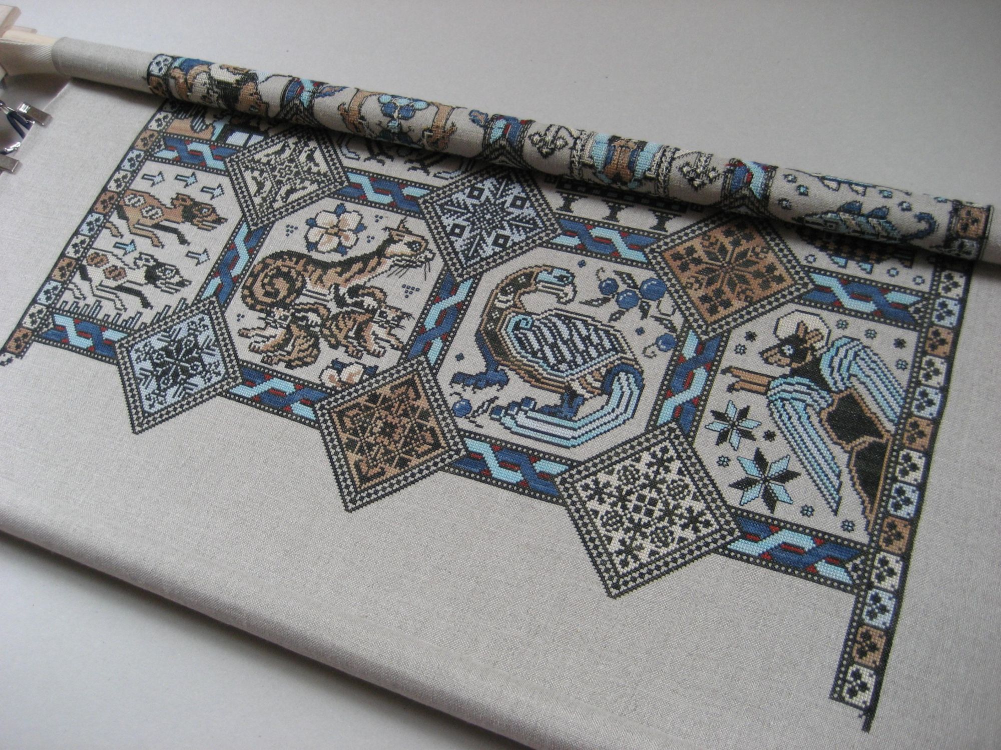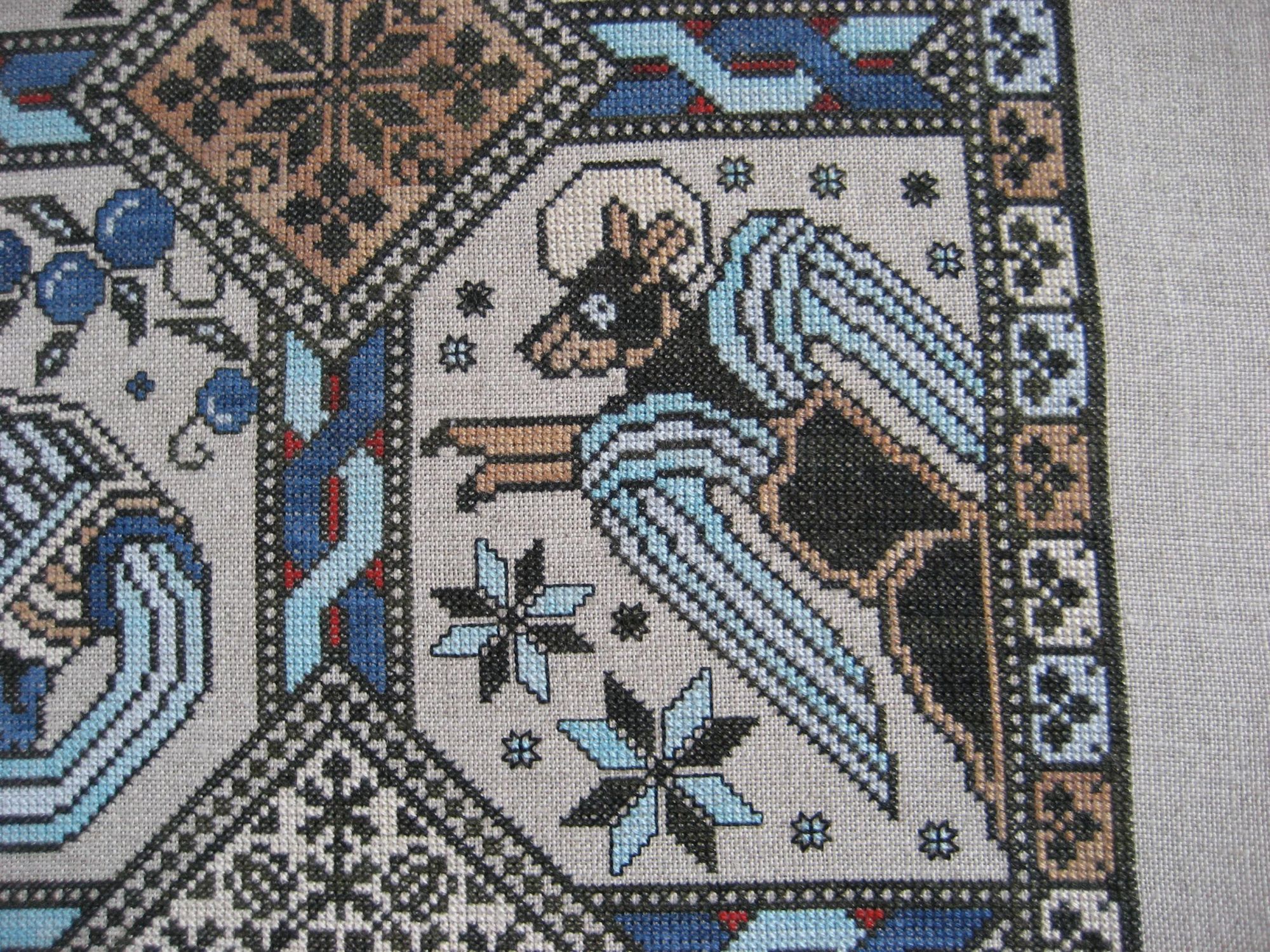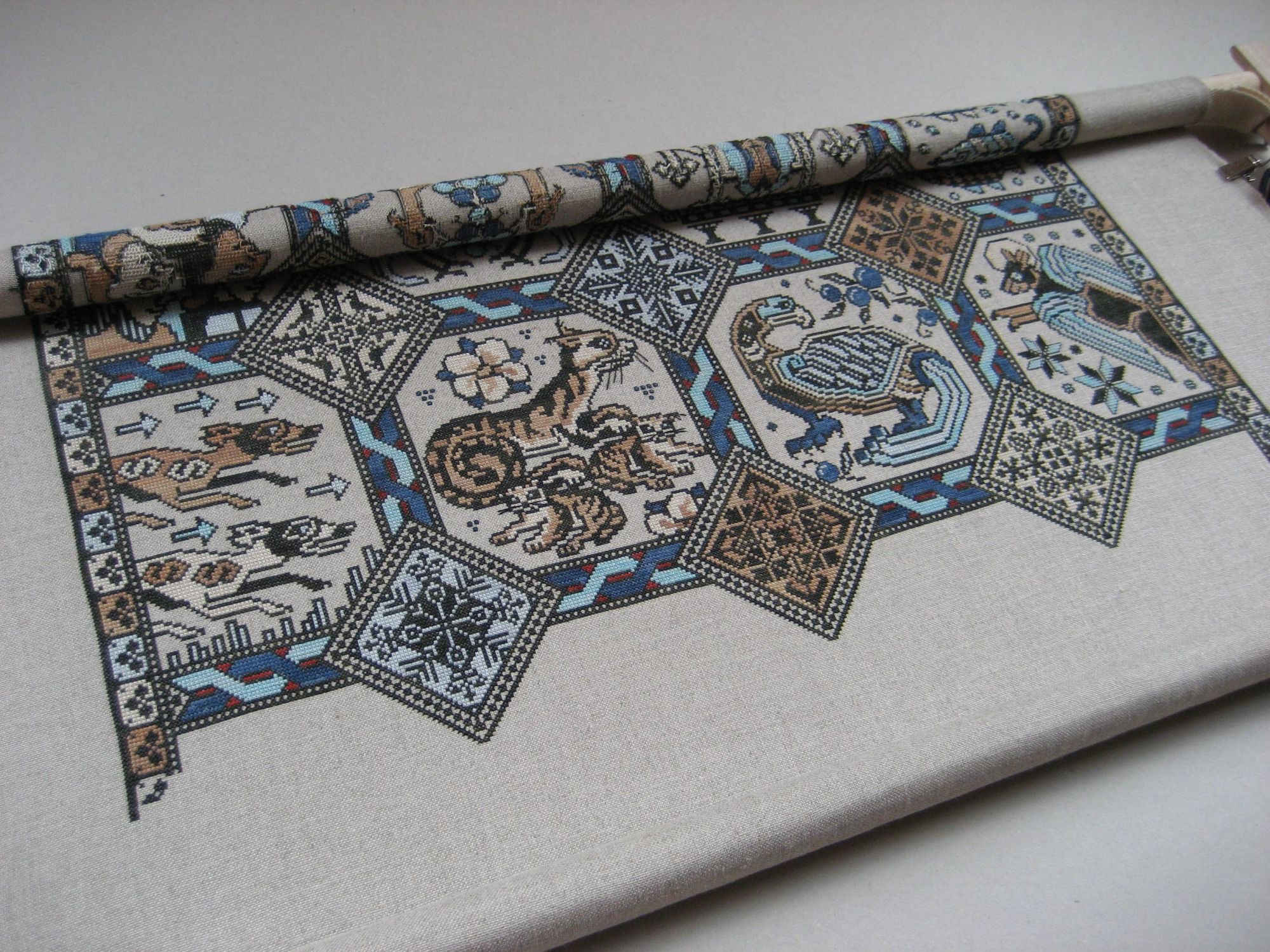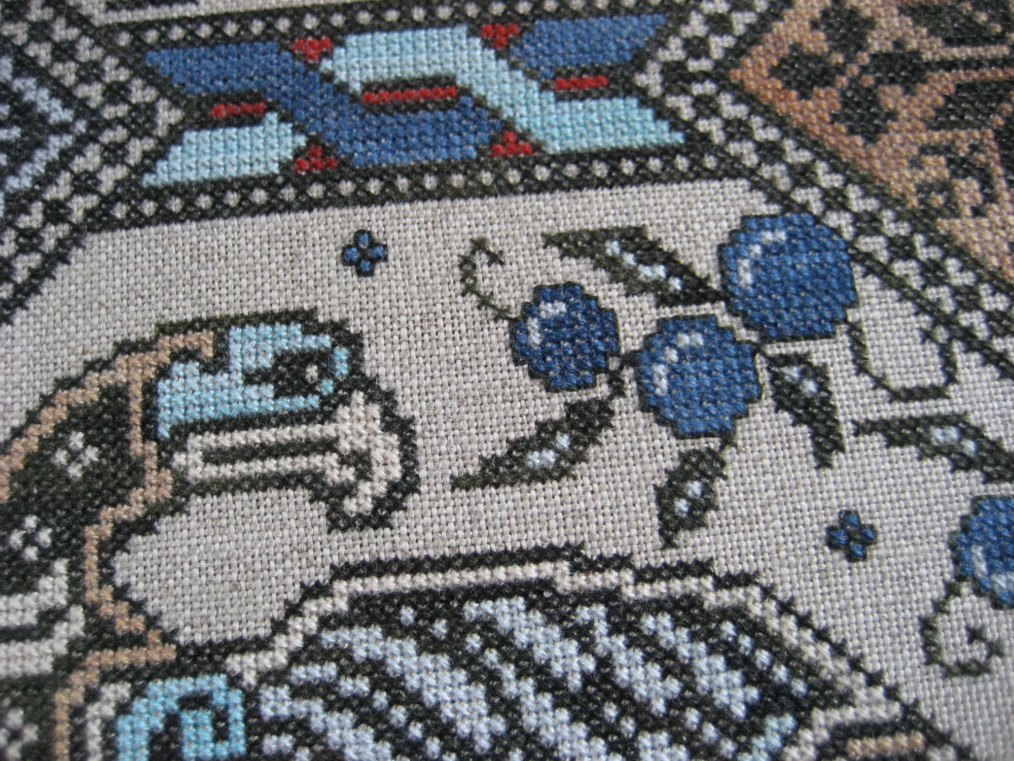 22 августа 2019 Всем доброго дня! Сделаю вид, что не пропадала надолго из своей темы и покажу свои продвижения в сэмплере Опус Магнуссона. Напомню, что вышиваю на льне 40 каунта в одну нить. Герои сегодняшнего дня - черепахоподобная птица, летающая собака, голубоглазая лошадка и зайцы во фраках. Итак, было: Стало: И продолжение: На лошадке мои инициалы, а рядышком - актуальная дата (год). С инициалами пришлось немного повозиться, чтобы нарисовать что-то более-менее похожее по стилю на исходник, с цифрам проще - всего лишь нарисовать единицу вместо нуля, ну и девятку чуть подправила. Проще всего вышивалась именно лошадка, хотя и медленнее, чем остальные картинки - это из-за большого пространства, зашиваемого одним цветом. Пришлось пыхтеть над каждым крестиком, тщательно регулируя натяжение нити, но как я не старалась, все равно явно просматриваются ряды туда-обратно из-за разного наклона крестиков. У меня такая же ерунда получается при вязании на спицах: если идет гладкая вязка, то явная полосатость наблюдается. Если честно, сэмплер мне уже поднадоел, хотя и очень к нему привязалась. Буду скучать, когда закончу. Больше всего надоедает вышивать повторяющийся орнамент - сетку. Картинки куда веселее движутся. Прямо праздник для меня каждый раз )) Небольшое количество цветов, как ни странно, не утомляет. Наверное потому, что цветовая гамма спокойная, да и интенсивность окраски нити все время меняется, не дает скучать. Напомню, нити - хлопок ручного крашения. Больше всего в деле переходы цвета заметны на карамельно-коричневых, меньше - на бирюзовых (хорошо видно на инициалах) и синих, почти не видны на бледно-голубых и совсем их нет на бежевых. Черные - совсем другая история. Они черные с зеленым отливом, недаром называются Raven (Ворон). Последняя пара мотков, что в работе, прямо совсем зеленые. Думала, что будут сильно выделяться на общем фоне, ан нет, также смотрятся черными в вышивке. Фото не передает эти зеленые переливы, но мне очень нравится. Обратите внимание, какие милипизерные бабочки рядом с зайцами, Прямо улыбнуло )) А зайцы непонятные какие-то. На дубе (!) То ли ноги у них вывернутые, то ли еще что. В общем для себя решила, что они во фраках )) А какие ягодки рядом с черепахоподобной птицей? Очень мне гжель напоминают. Работы впереди еще полно. Осталось вышить бородатую щуку и вторую толпу мужиков, а затем широкую полосу орнамента. И тогда будет усе )) Спасибо всем, кто зашел и прочитал мою писанину. Всем легких крестиков! Nat717, Irina 1, татьяна0674 и 32 других сказали спасибо Поделиться сообщением Ссылка на сообщение