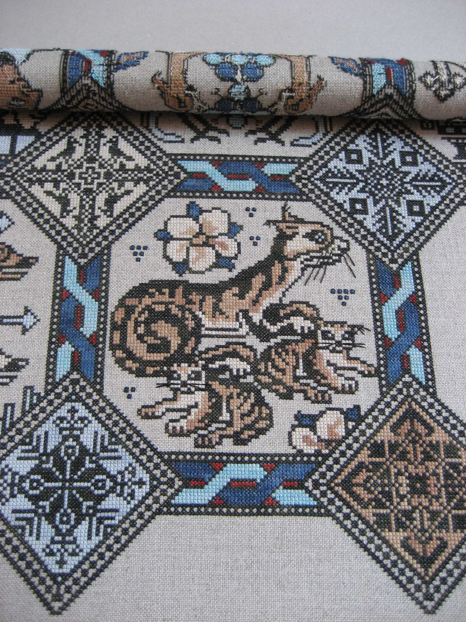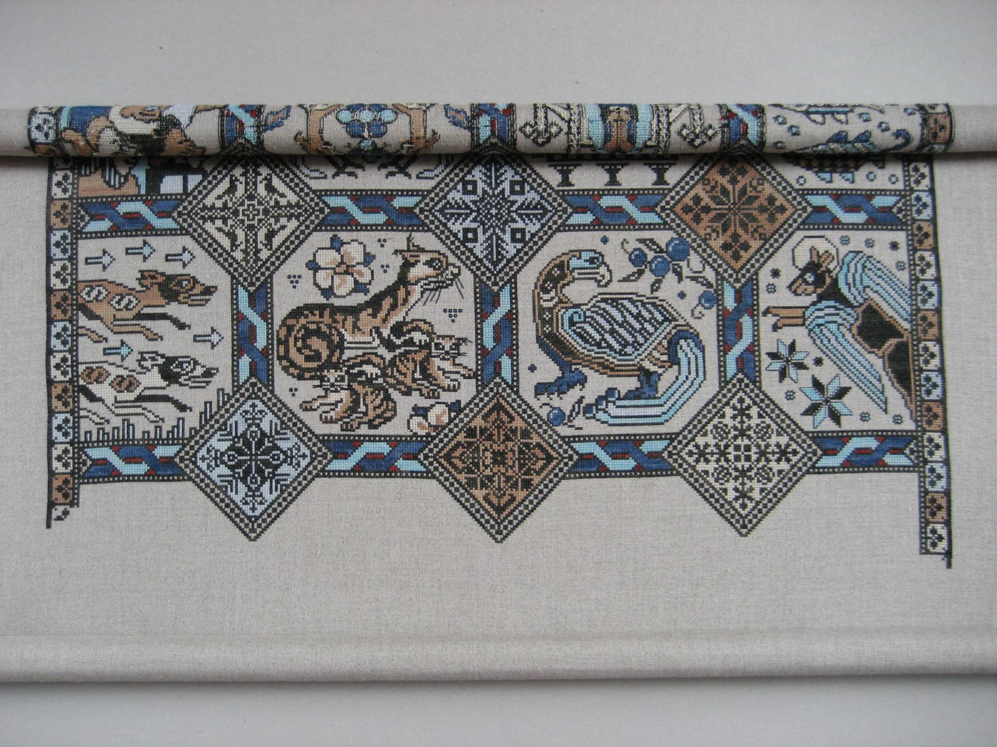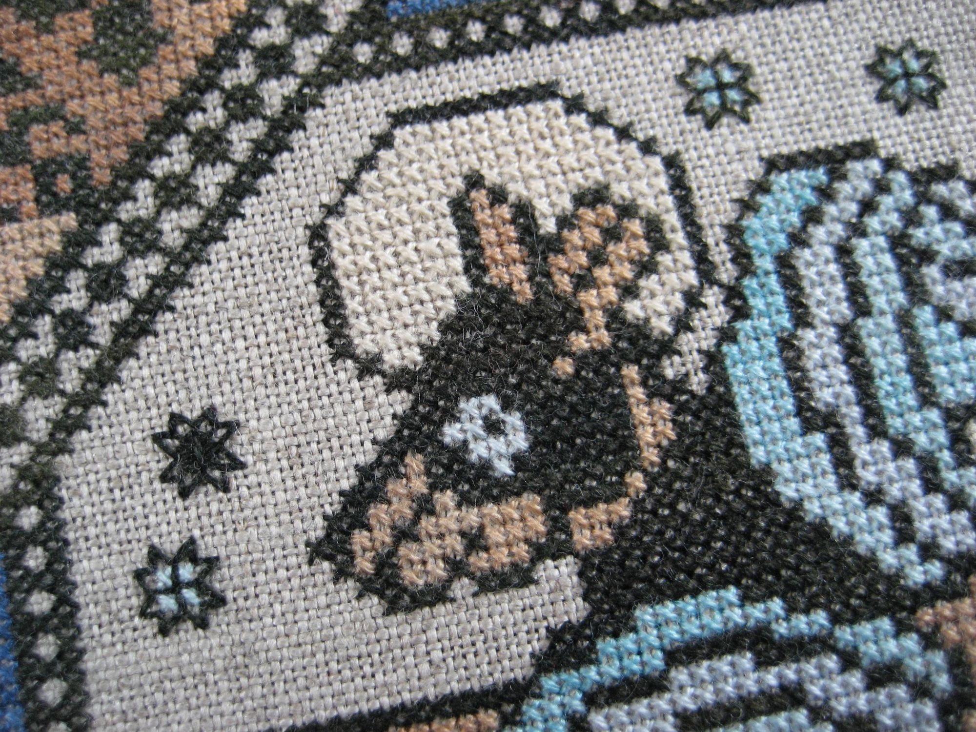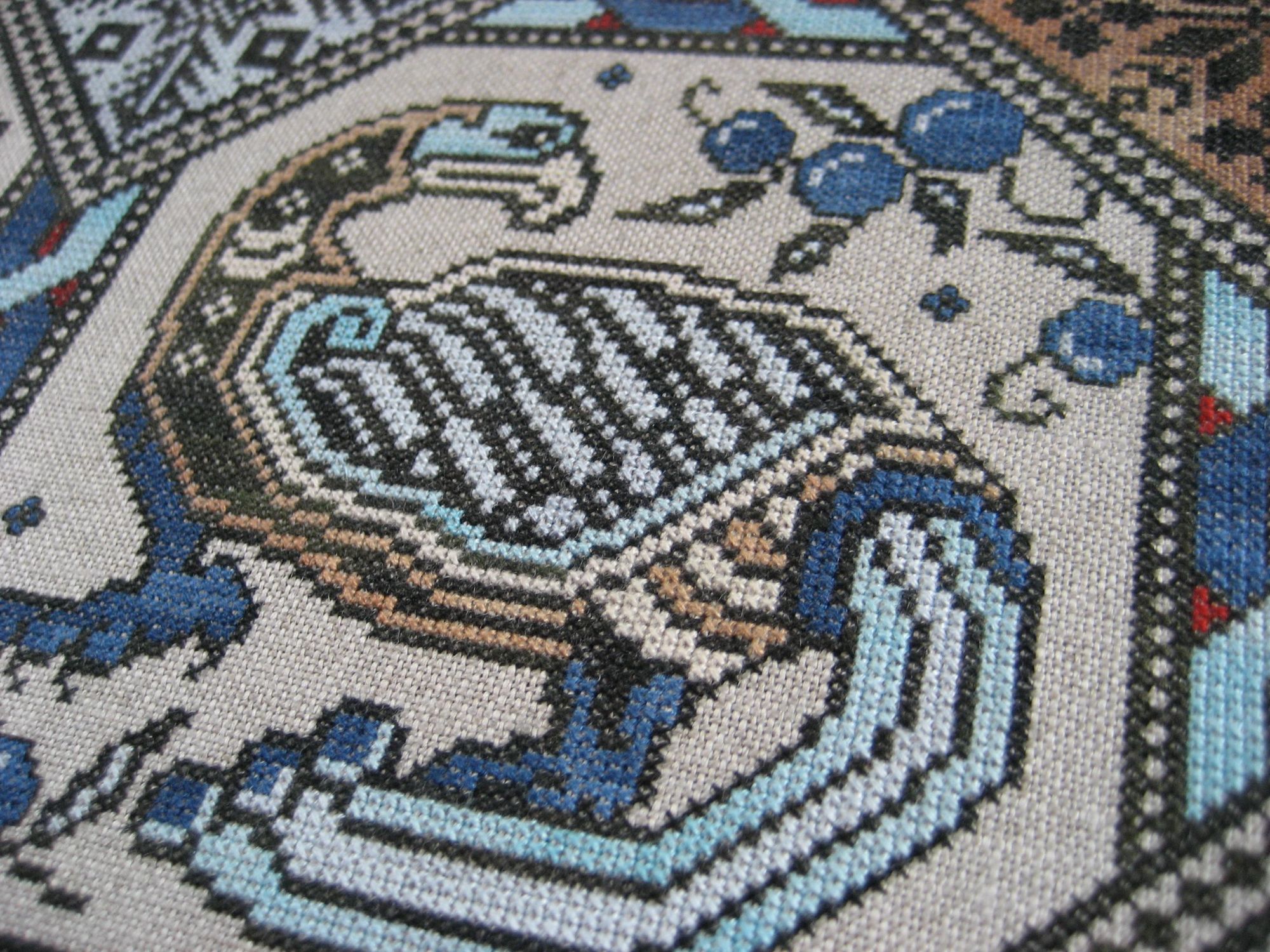 22 августа 2019 Всем доброго дня! Сделаю вид, что не пропадала надолго из своей темы и покажу свои продвижения в сэмплере Опус Магнуссона. Напомню, что вышиваю на льне 40 каунта в одну нить. Герои сегодняшнего дня - черепахоподобная птица, летающая собака, голубоглазая лошадка и зайцы во фраках. Итак, было: Стало: И продолжение: На лошадке мои инициалы, а рядышком - актуальная дата (год). С инициалами пришлось немного повозиться, чтобы нарисовать что-то более-менее похожее по стилю на исходник, с цифрам проще - всего лишь нарисовать единицу вместо нуля, ну и девятку чуть подправила. Проще всего вышивалась именно лошадка, хотя и медленнее, чем остальные картинки - это из-за большого пространства, зашиваемого одним цветом. Пришлось пыхтеть над каждым крестиком, тщательно регулируя натяжение нити, но как я не старалась, все равно явно просматриваются ряды туда-обратно из-за разного наклона крестиков. У меня такая же ерунда получается при вязании на спицах: если идет гладкая вязка, то явная полосатость наблюдается. Если честно, сэмплер мне уже поднадоел, хотя и очень к нему привязалась. Буду скучать, когда закончу. Больше всего надоедает вышивать повторяющийся орнамент - сетку. Картинки куда веселее движутся. Прямо праздник для меня каждый раз )) Небольшое количество цветов, как ни странно, не утомляет. Наверное потому, что цветовая гамма спокойная, да и интенсивность окраски нити все время меняется, не дает скучать. Напомню, нити - хлопок ручного крашения. Больше всего в деле переходы цвета заметны на карамельно-коричневых, меньше - на бирюзовых (хорошо видно на инициалах) и синих, почти не видны на бледно-голубых и совсем их нет на бежевых. Черные - совсем другая история. Они черные с зеленым отливом, недаром называются Raven (Ворон). Последняя пара мотков, что в работе, прямо совсем зеленые. Думала, что будут сильно выделяться на общем фоне, ан нет, также смотрятся черными в вышивке. Фото не передает эти зеленые переливы, но мне очень нравится. Обратите внимание, какие милипизерные бабочки рядом с зайцами, Прямо улыбнуло )) А зайцы непонятные какие-то. На дубе (!) То ли ноги у них вывернутые, то ли еще что. В общем для себя решила, что они во фраках )) А какие ягодки рядом с черепахоподобной птицей? Очень мне гжель напоминают. Работы впереди еще полно. Осталось вышить бородатую щуку и вторую толпу мужиков, а затем широкую полосу орнамента. И тогда будет усе )) Спасибо всем, кто зашел и прочитал мою писанину. Всем легких крестиков! Nat717, Irina 1, татьяна0674 и 32 других сказали спасибо Поделиться сообщением Ссылка на сообщение