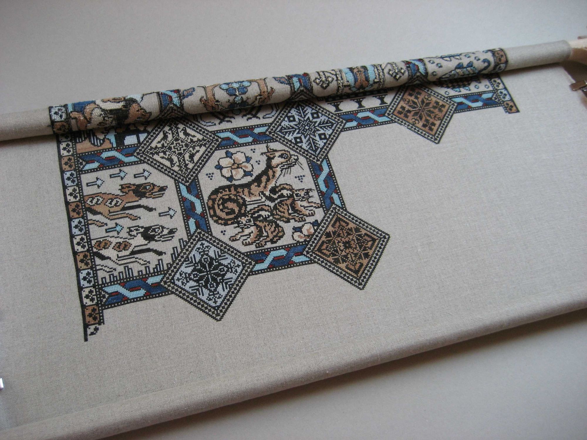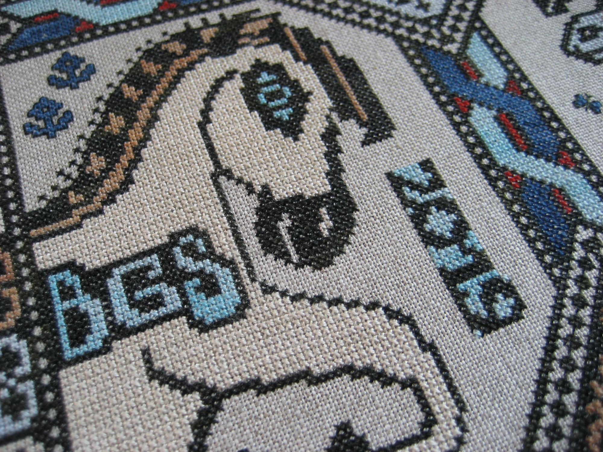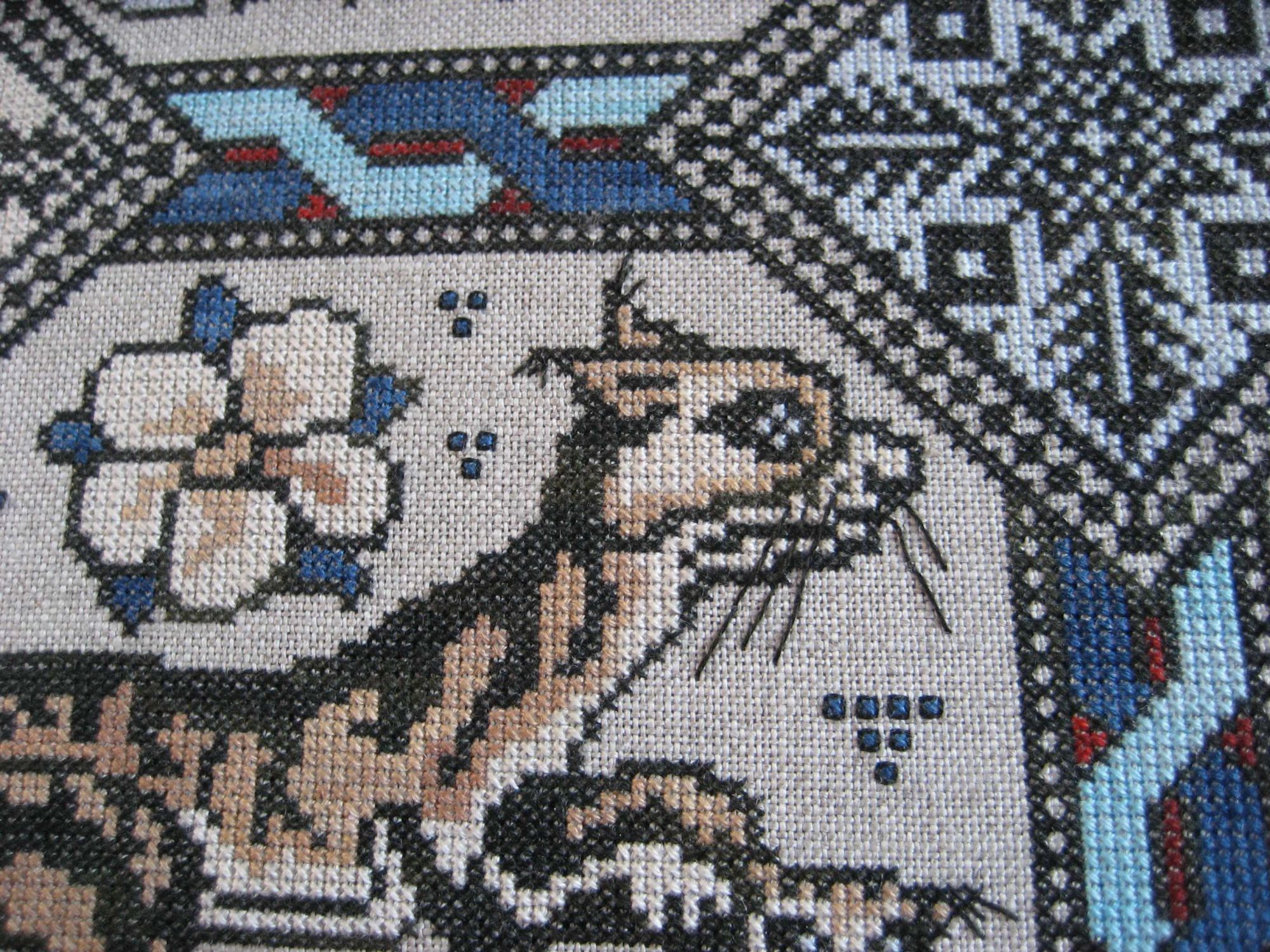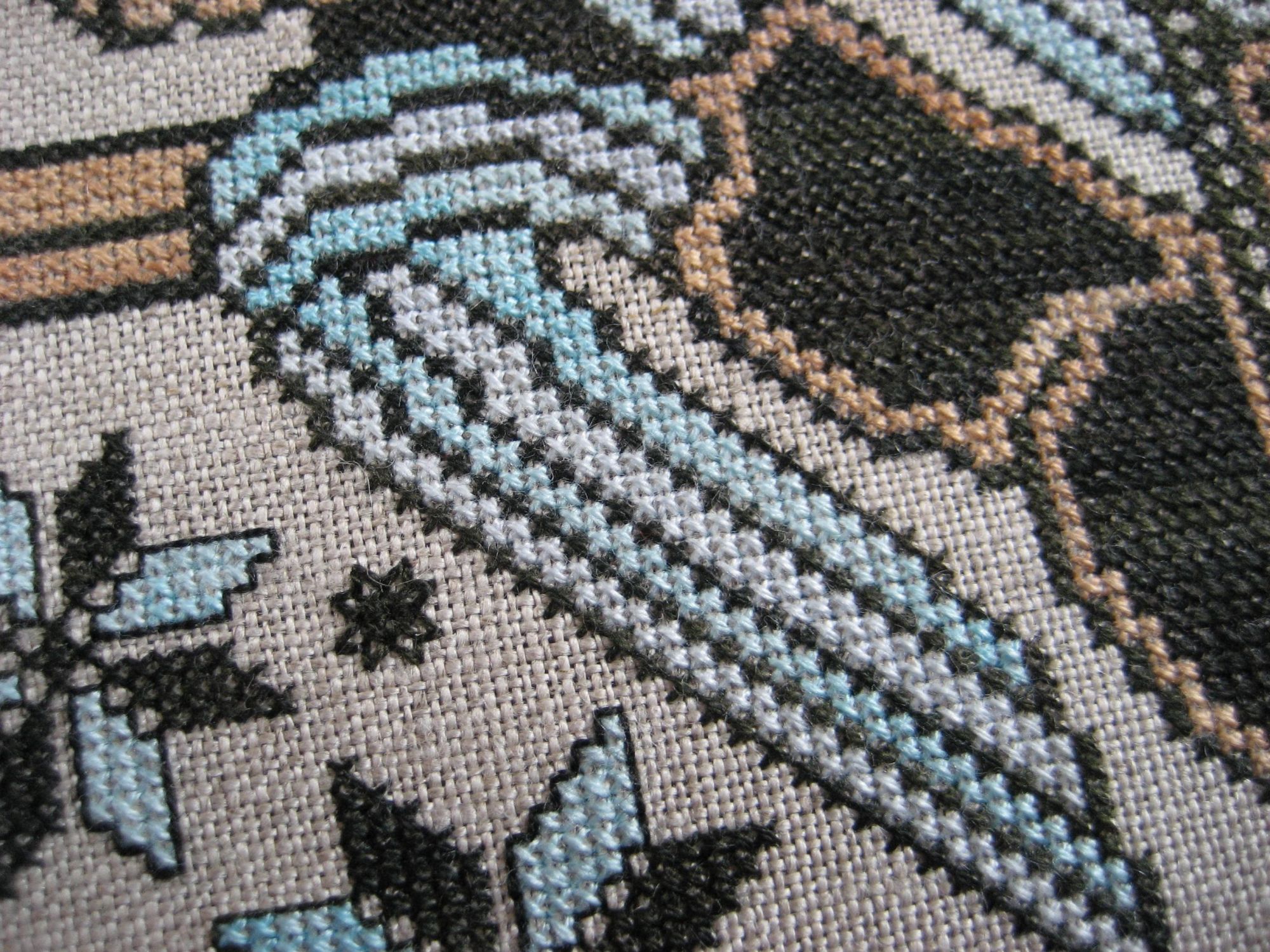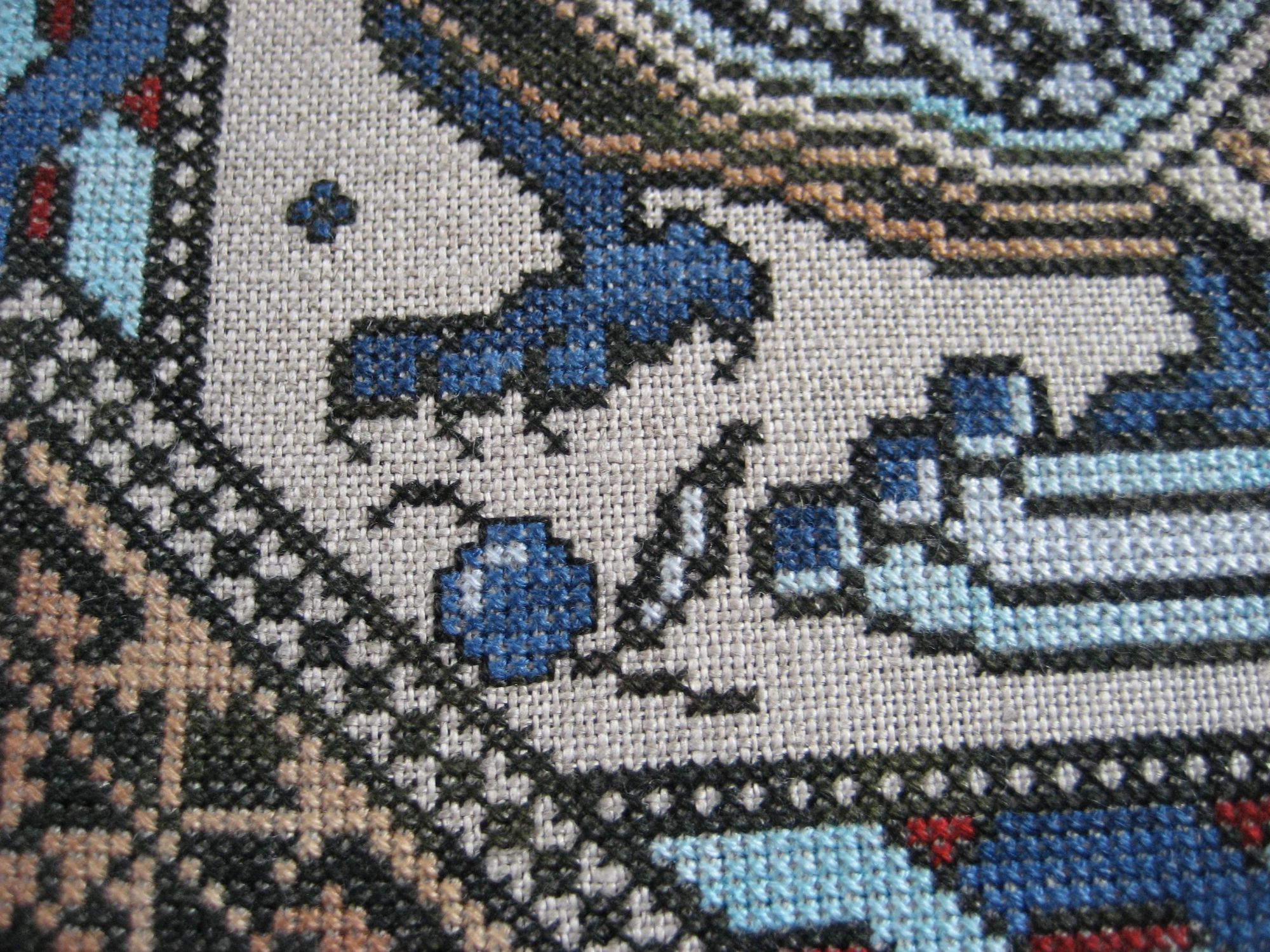 22 августа 2019 Всем доброго дня! Сделаю вид, что не пропадала надолго из своей темы и покажу свои продвижения в сэмплере Опус Магнуссона. Напомню, что вышиваю на льне 40 каунта в одну нить. Герои сегодняшнего дня - черепахоподобная птица, летающая собака, голубоглазая лошадка и зайцы во фраках. Итак, было: Стало: И продолжение: На лошадке мои инициалы, а рядышком - актуальная дата (год). С инициалами пришлось немного повозиться, чтобы нарисовать что-то более-менее похожее по стилю на исходник, с цифрам проще - всего лишь нарисовать единицу вместо нуля, ну и девятку чуть подправила. Проще всего вышивалась именно лошадка, хотя и медленнее, чем остальные картинки - это из-за большого пространства, зашиваемого одним цветом. Пришлось пыхтеть над каждым крестиком, тщательно регулируя натяжение нити, но как я не старалась, все равно явно просматриваются ряды туда-обратно из-за разного наклона крестиков. У меня такая же ерунда получается при вязании на спицах: если идет гладкая вязка, то явная полосатость наблюдается. Если честно, сэмплер мне уже поднадоел, хотя и очень к нему привязалась. Буду скучать, когда закончу. Больше всего надоедает вышивать повторяющийся орнамент - сетку. Картинки куда веселее движутся. Прямо праздник для меня каждый раз )) Небольшое количество цветов, как ни странно, не утомляет. Наверное потому, что цветовая гамма спокойная, да и интенсивность окраски нити все время меняется, не дает скучать. Напомню, нити - хлопок ручного крашения. Больше всего в деле переходы цвета заметны на карамельно-коричневых, меньше - на бирюзовых (хорошо видно на инициалах) и синих, почти не видны на бледно-голубых и совсем их нет на бежевых. Черные - совсем другая история. Они черные с зеленым отливом, недаром называются Raven (Ворон). Последняя пара мотков, что в работе, прямо совсем зеленые. Думала, что будут сильно выделяться на общем фоне, ан нет, также смотрятся черными в вышивке. Фото не передает эти зеленые переливы, но мне очень нравится. Обратите внимание, какие милипизерные бабочки рядом с зайцами, Прямо улыбнуло )) А зайцы непонятные какие-то. На дубе (!) То ли ноги у них вывернутые, то ли еще что. В общем для себя решила, что они во фраках )) А какие ягодки рядом с черепахоподобной птицей? Очень мне гжель напоминают. Работы впереди еще полно. Осталось вышить бородатую щуку и вторую толпу мужиков, а затем широкую полосу орнамента. И тогда будет усе )) Спасибо всем, кто зашел и прочитал мою писанину. Всем легких крестиков! Nat717, Irina 1, татьяна0674 и 32 других сказали спасибо Поделиться сообщением Ссылка на сообщение