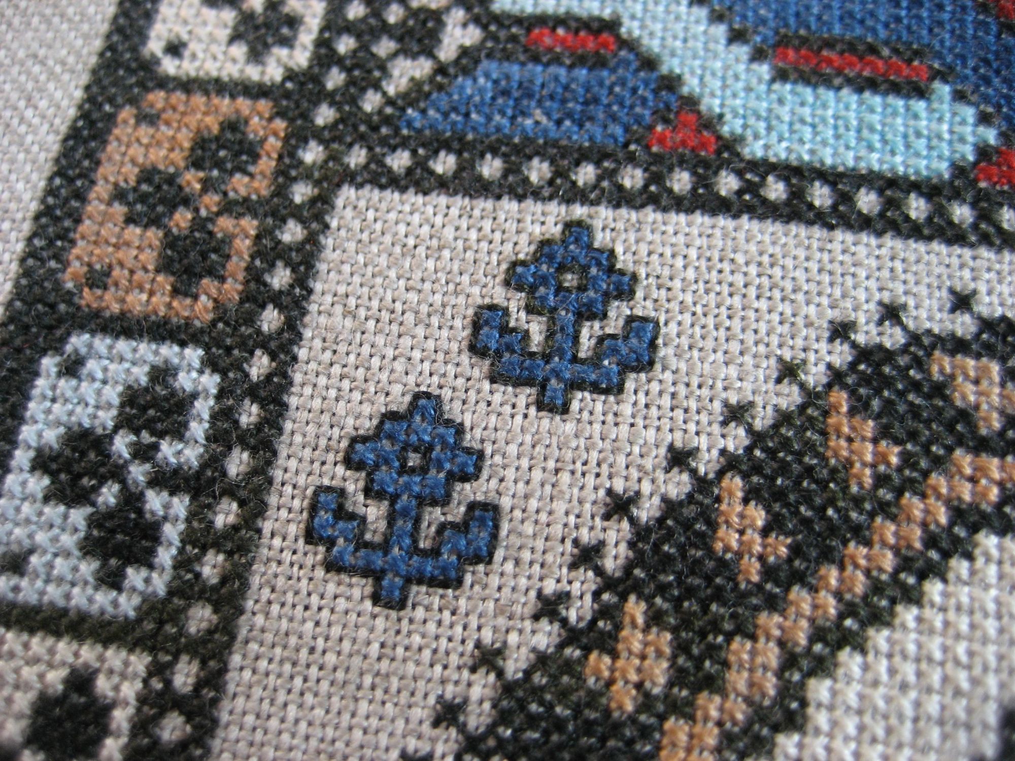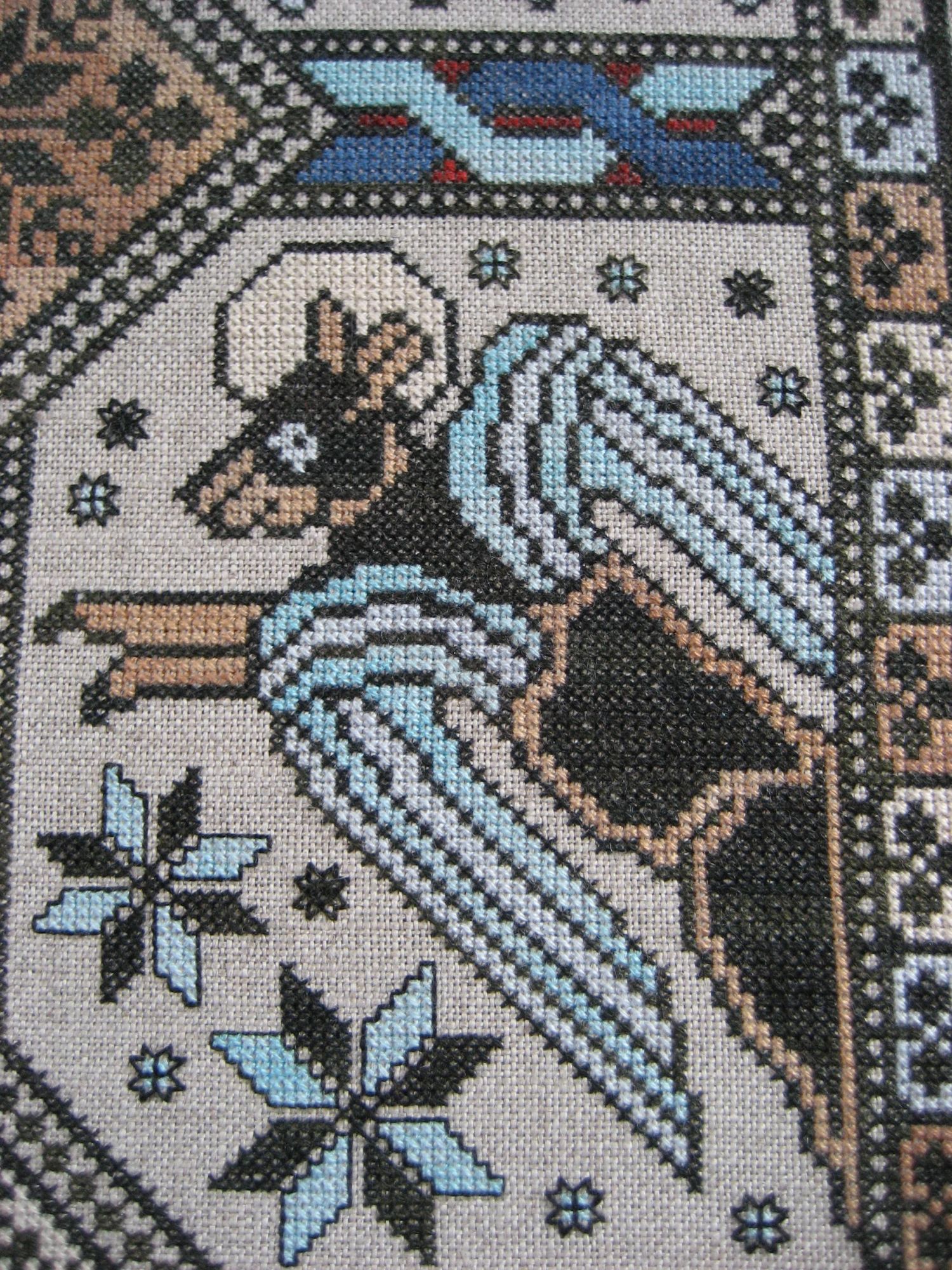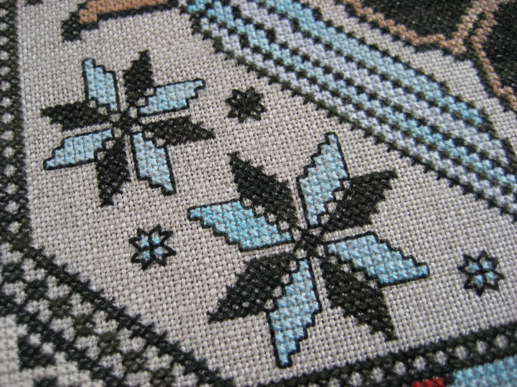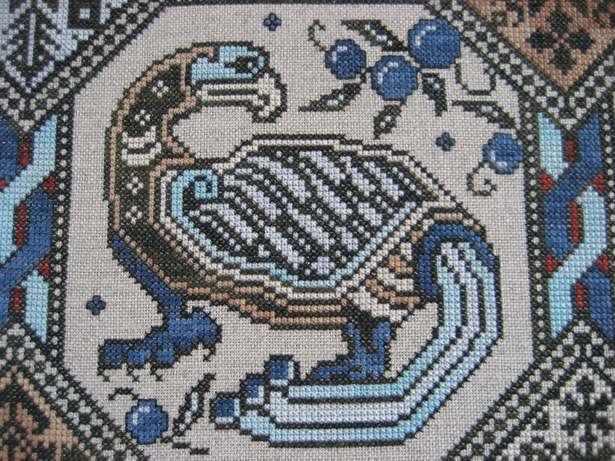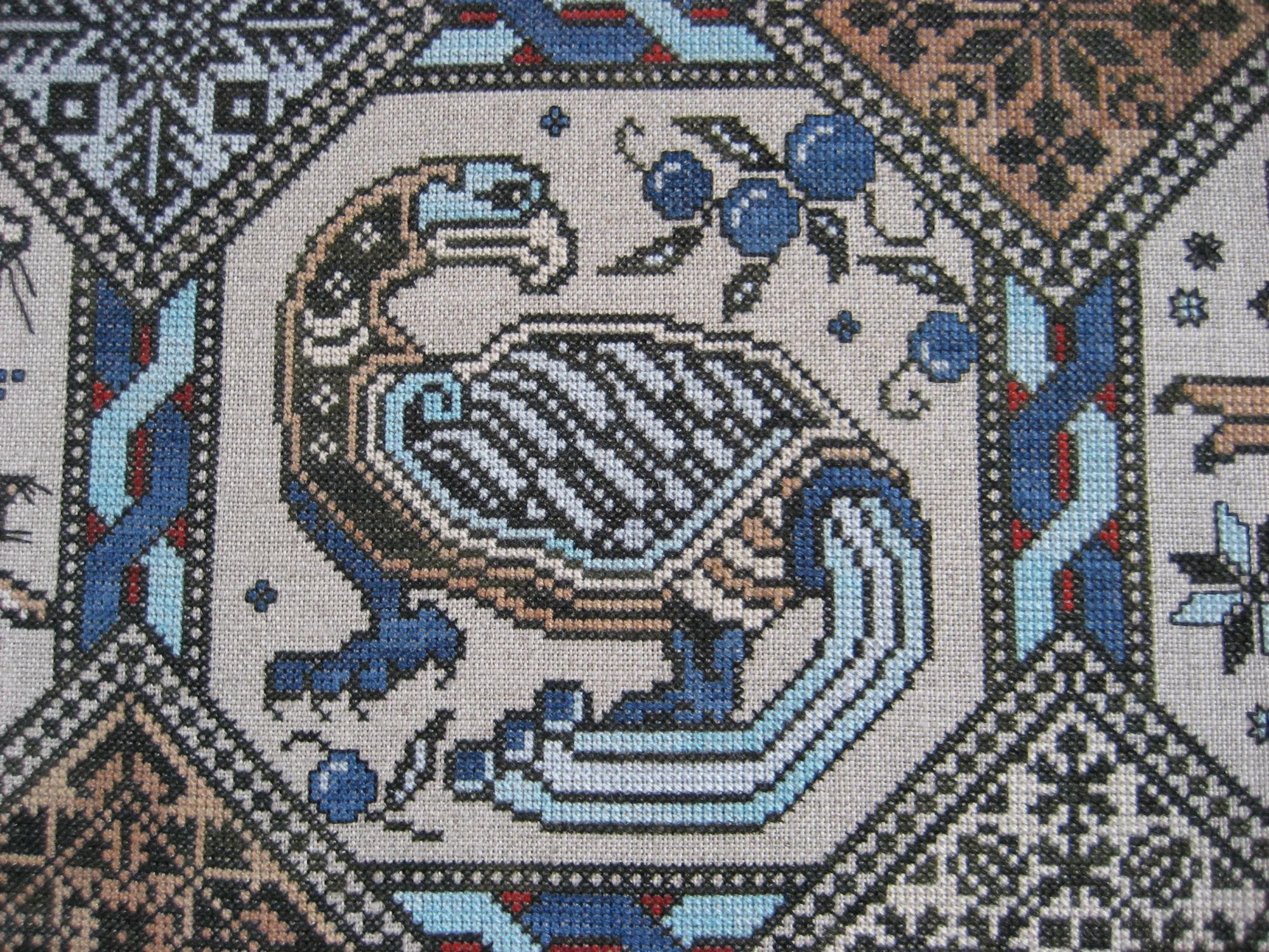 22 августа 2019 Всем доброго дня! Сделаю вид, что не пропадала надолго из своей темы и покажу свои продвижения в сэмплере Опус Магнуссона. Напомню, что вышиваю на льне 40 каунта в одну нить. Герои сегодняшнего дня - черепахоподобная птица, летающая собака, голубоглазая лошадка и зайцы во фраках. Итак, было: Стало: И продолжение: На лошадке мои инициалы, а рядышком - актуальная дата (год). С инициалами пришлось немного повозиться, чтобы нарисовать что-то более-менее похожее по стилю на исходник, с цифрам проще - всего лишь нарисовать единицу вместо нуля, ну и девятку чуть подправила. Проще всего вышивалась именно лошадка, хотя и медленнее, чем остальные картинки - это из-за большого пространства, зашиваемого одним цветом. Пришлось пыхтеть над каждым крестиком, тщательно регулируя натяжение нити, но как я не старалась, все равно явно просматриваются ряды туда-обратно из-за разного наклона крестиков. У меня такая же ерунда получается при вязании на спицах: если идет гладкая вязка, то явная полосатость наблюдается. Если честно, сэмплер мне уже поднадоел, хотя и очень к нему привязалась. Буду скучать, когда закончу. Больше всего надоедает вышивать повторяющийся орнамент - сетку. Картинки куда веселее движутся. Прямо праздник для меня каждый раз )) Небольшое количество цветов, как ни странно, не утомляет. Наверное потому, что цветовая гамма спокойная, да и интенсивность окраски нити все время меняется, не дает скучать. Напомню, нити - хлопок ручного крашения. Больше всего в деле переходы цвета заметны на карамельно-коричневых, меньше - на бирюзовых (хорошо видно на инициалах) и синих, почти не видны на бледно-голубых и совсем их нет на бежевых. Черные - совсем другая история. Они черные с зеленым отливом, недаром называются Raven (Ворон). Последняя пара мотков, что в работе, прямо совсем зеленые. Думала, что будут сильно выделяться на общем фоне, ан нет, также смотрятся черными в вышивке. Фото не передает эти зеленые переливы, но мне очень нравится. Обратите внимание, какие милипизерные бабочки рядом с зайцами, Прямо улыбнуло )) А зайцы непонятные какие-то. На дубе (!) То ли ноги у них вывернутые, то ли еще что. В общем для себя решила, что они во фраках )) А какие ягодки рядом с черепахоподобной птицей? Очень мне гжель напоминают. Работы впереди еще полно. Осталось вышить бородатую щуку и вторую толпу мужиков, а затем широкую полосу орнамента. И тогда будет усе )) Спасибо всем, кто зашел и прочитал мою писанину. Всем легких крестиков! Nat717, Irina 1, татьяна0674 и 32 других сказали спасибо Поделиться сообщением Ссылка на сообщение